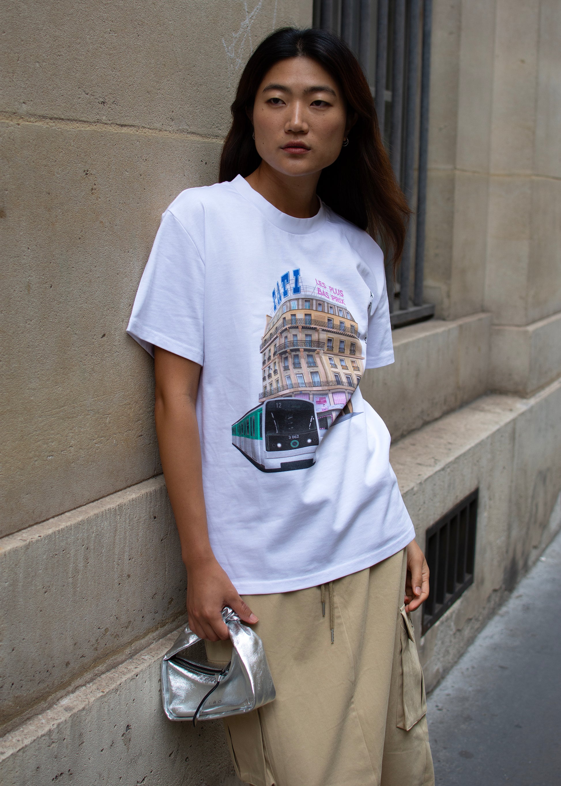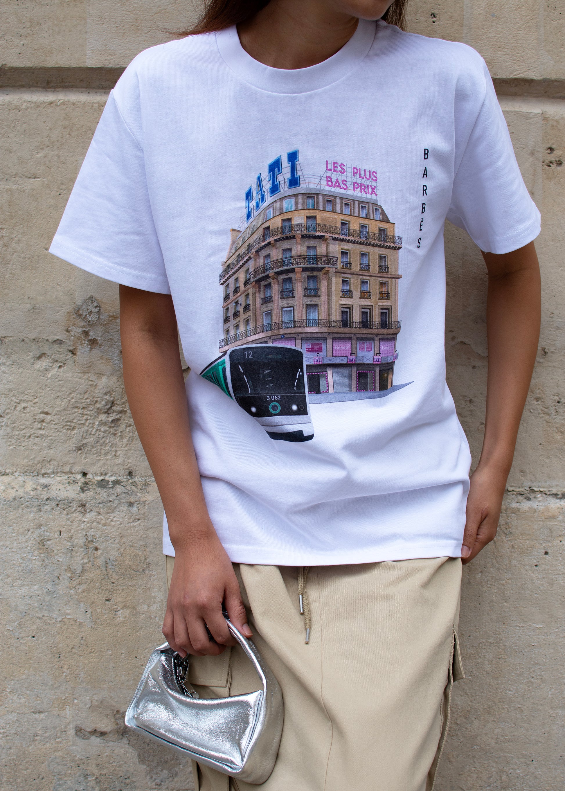 Our Barbès tee is a tribute to the vibrant Barbès-Rochechouart neighbourhood, situated at the intersection of Paris’s 9th, 10th, and 18th arrondissements. This area is known for its cultural diversity and bustling markets, where an eclectic mix of shops mirrors its multicultural community. Our design celebrates the iconic Tati department store, famous for its bold signage and colourful branding, which has long been a symbol of the 18th arrondissement. The elevated metro line 2, passes right by Tati, and captures the spirit of Barbès—a truely local scene and a defining feature of this lively Parisian area.
