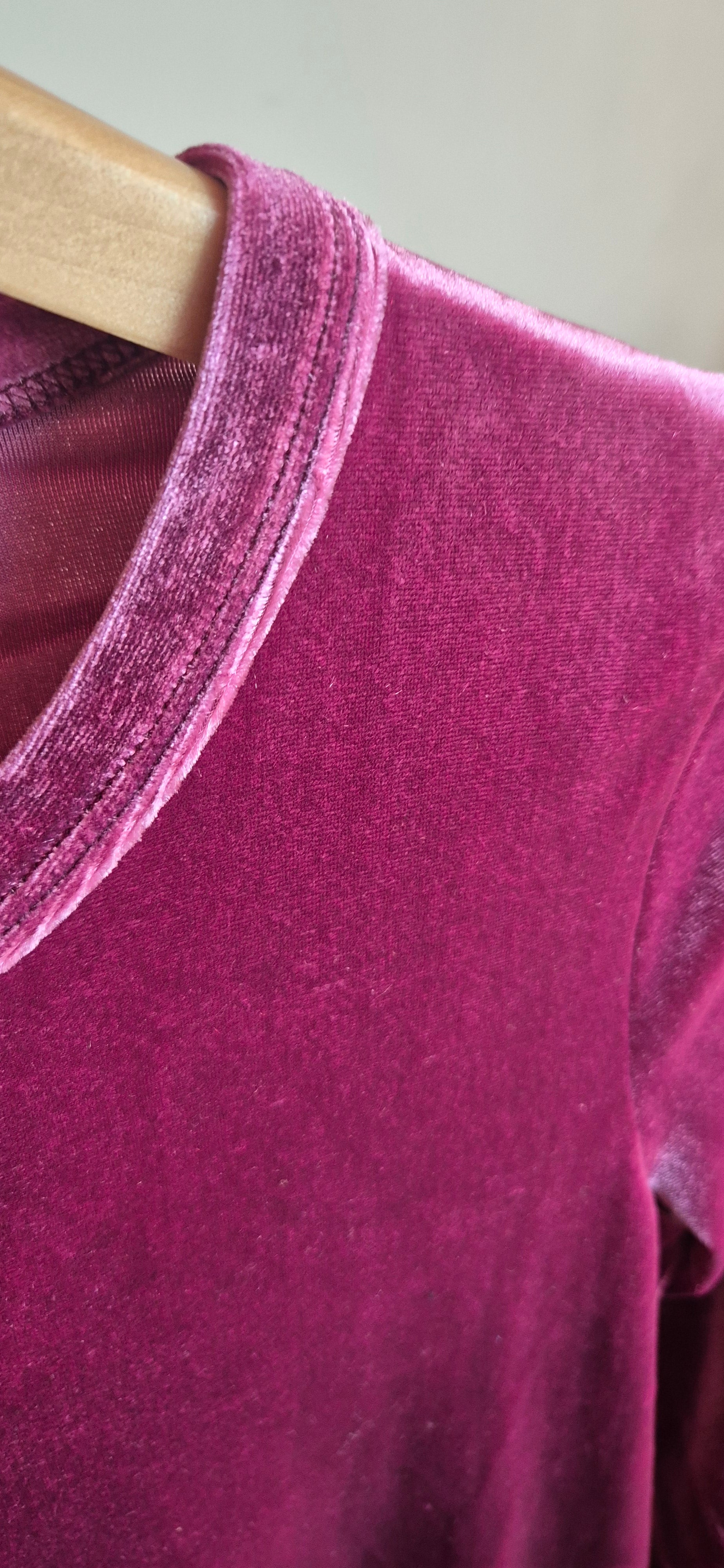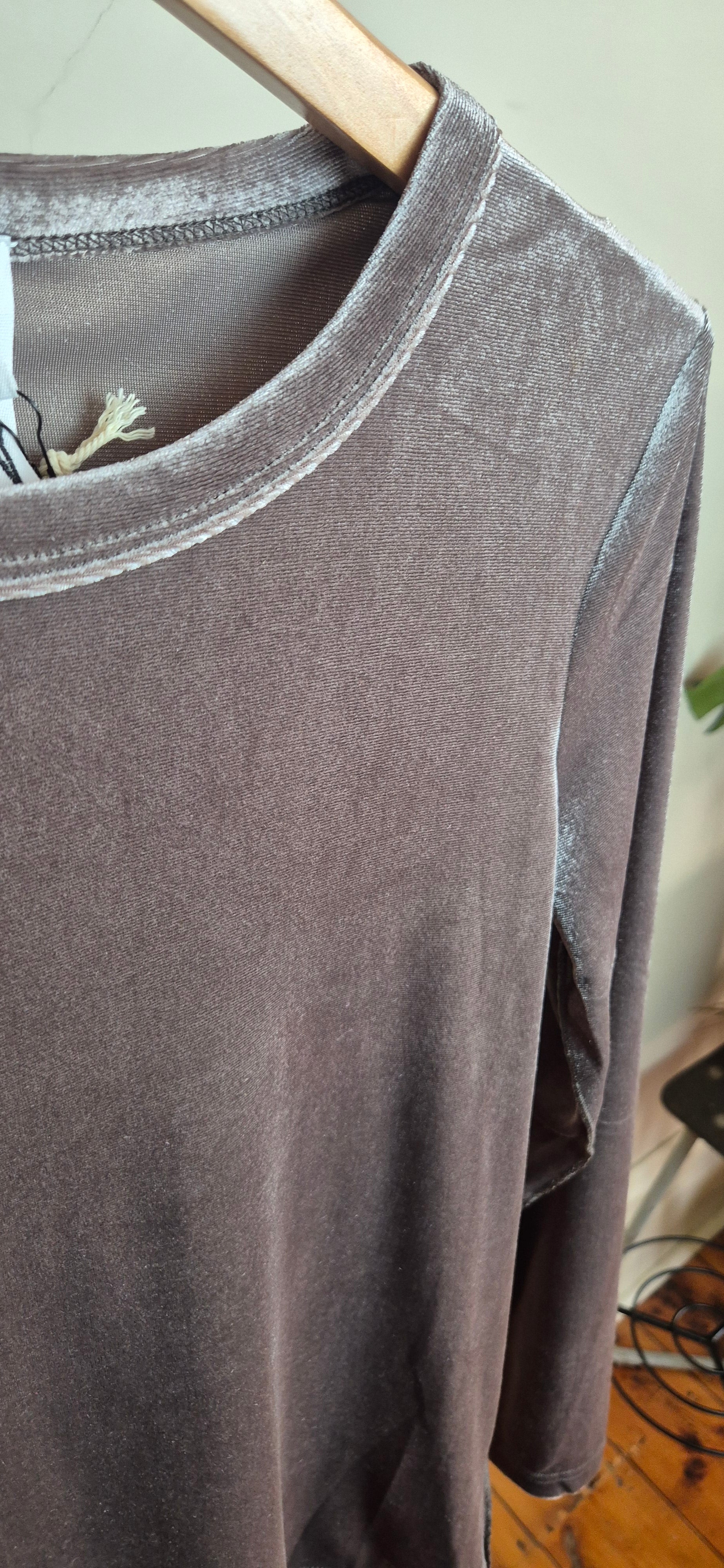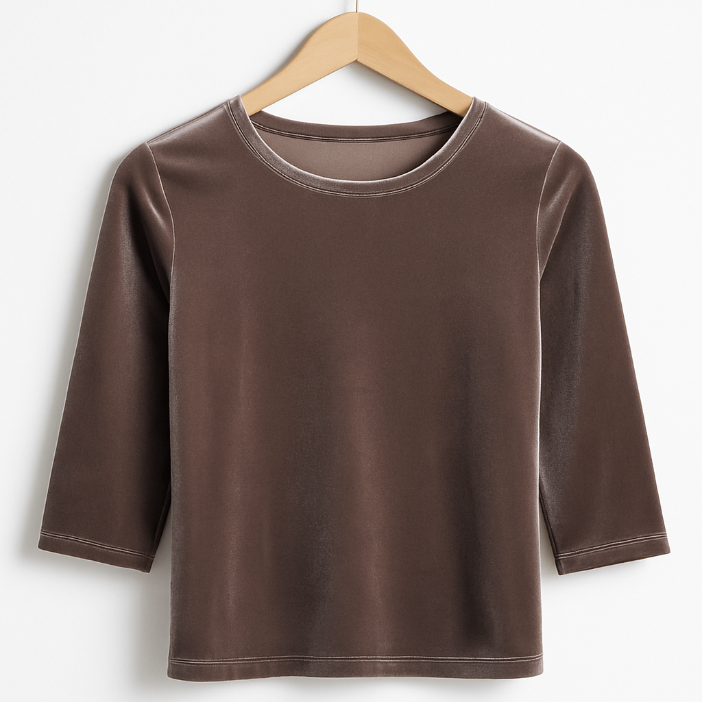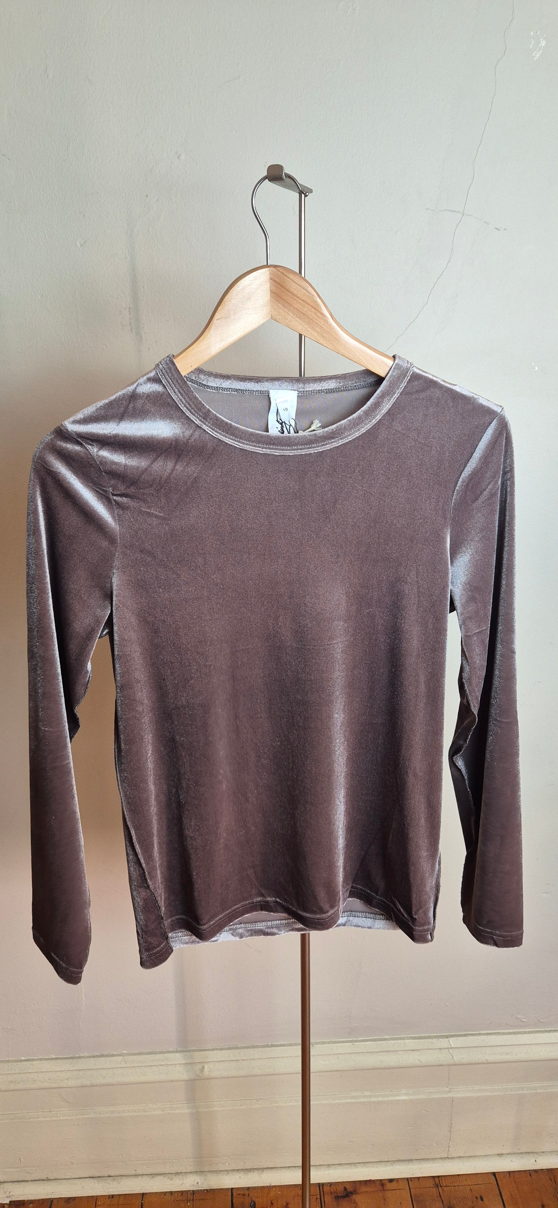 A luxe layering piece with rich colour and softness to match. This velvet long sleeve tee by Maud Dainty adds a dash of opulence to your everyday essentials. Featuring elbow-length sleeves and a clean, simple cut, it's the perfect blend of comfort and polish. Dress it down with denim or tuck it into a tailored trouser for an elevated edge.