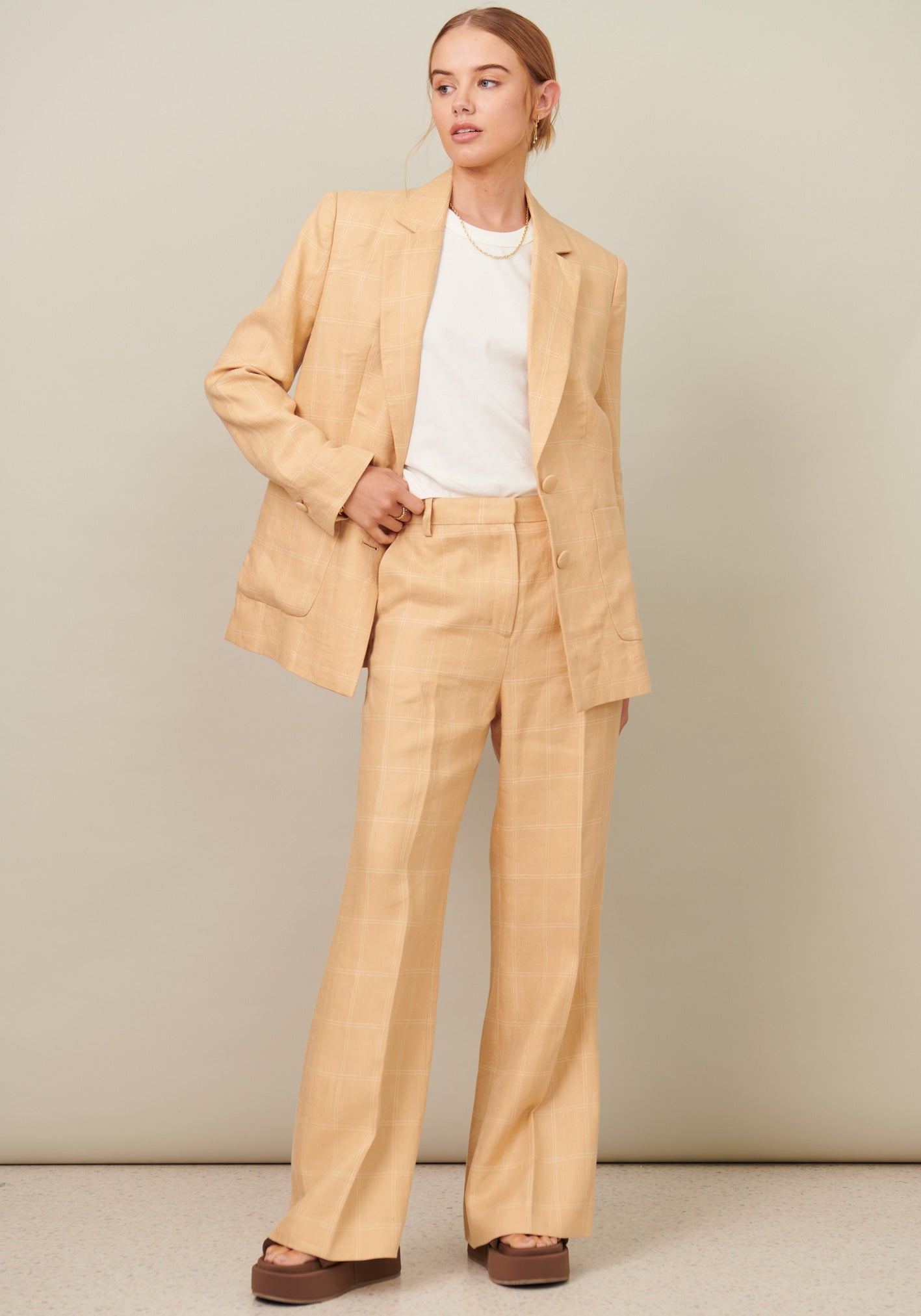 Introducing the Bianca Pant in Bianca Check, a sophisticated and exclusive piece for your Summer wardrobe. Crafted from a sumptuous linen blend, this pant features a fixed waistband, zip and button fly closure, and hip pockets for a tailored and flattering fit. The slim leg with a subtle flare creates an elegant silhouette. Complete the look with the Bianca Tailored Jacket for the perfect Summer suiting.