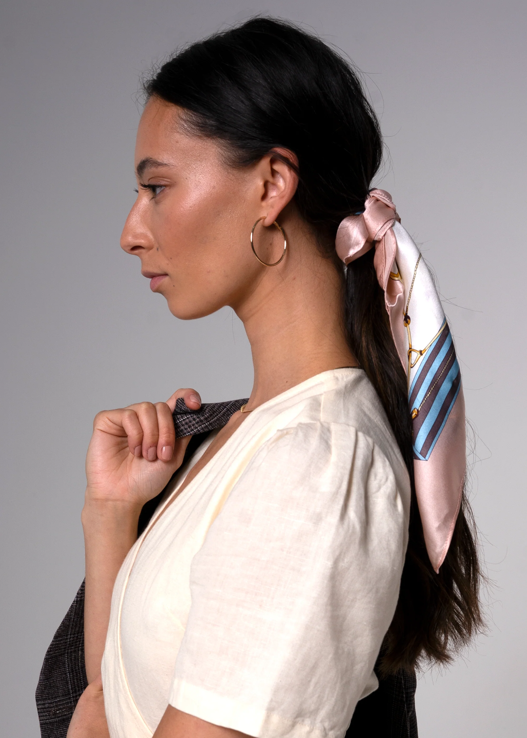 Elevate your ensemble effortlessly with our Cecile silk scarf. Featuring a vintage, soft dusty rose print, 'le foulard' can be worn elegantly round the neck in a 'French knot', in the hair or tied onto your bag for a that extra 'nonchalant' style.