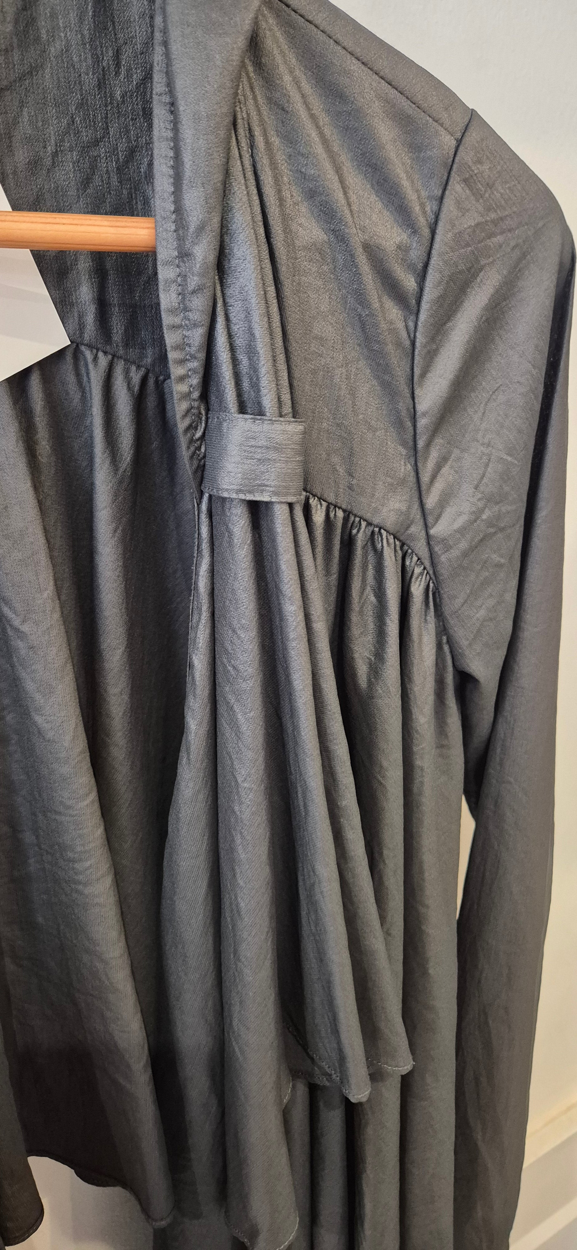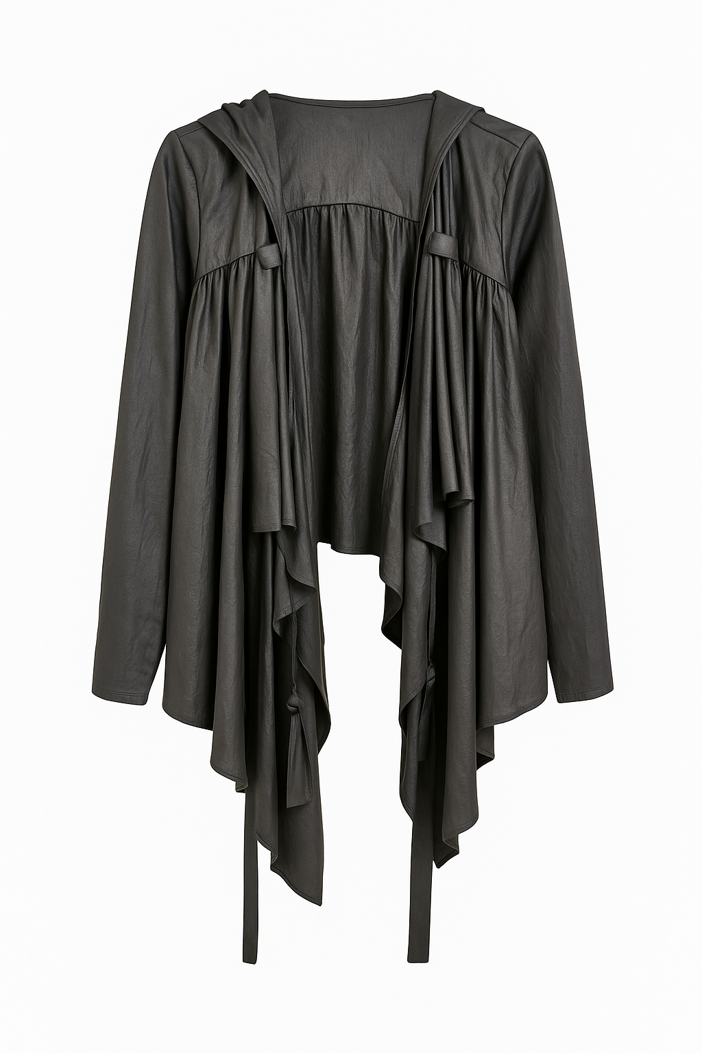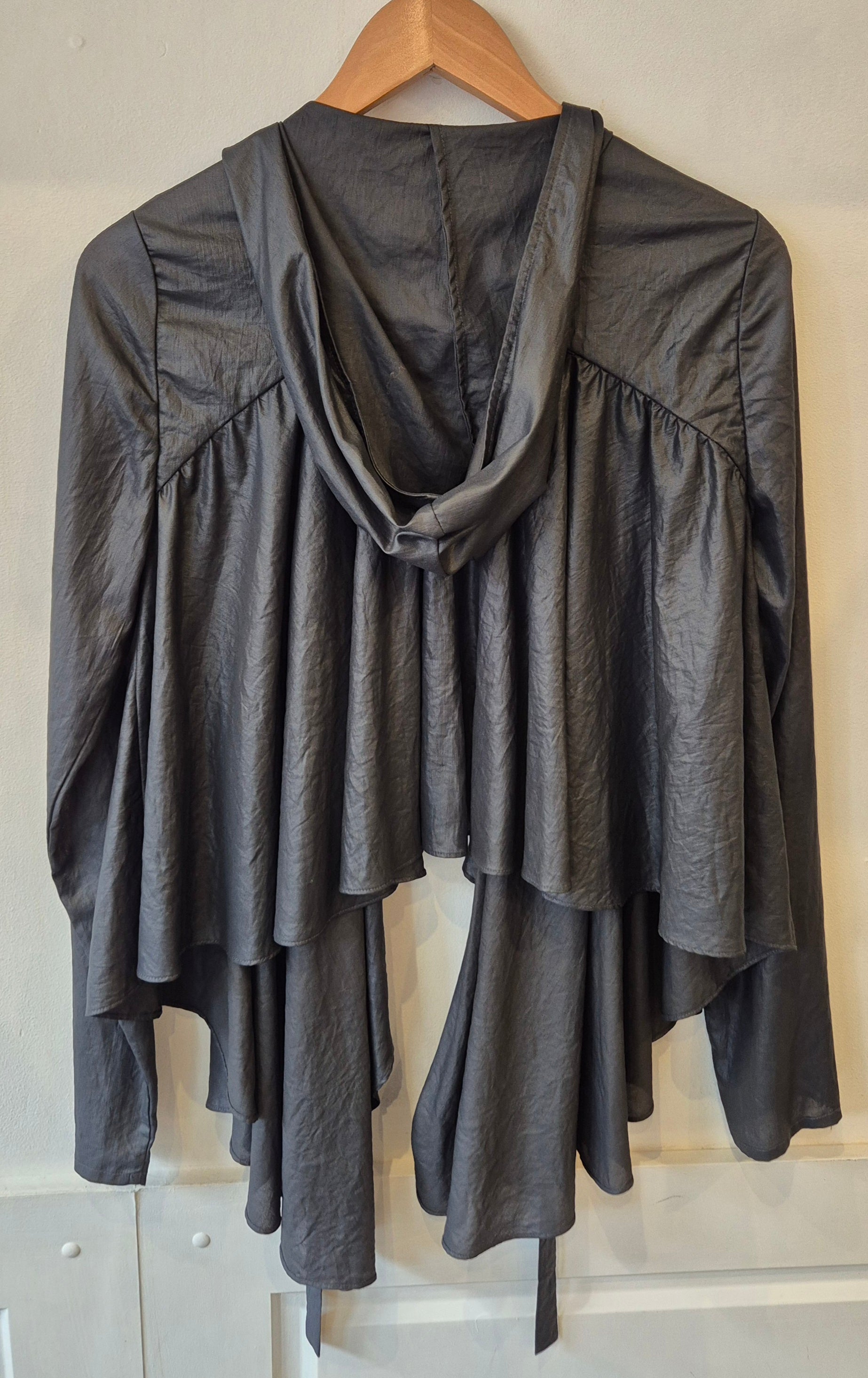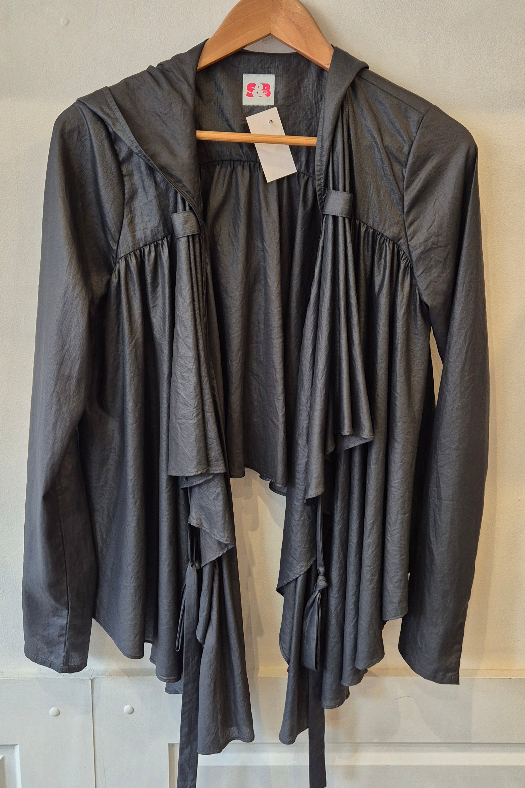 A statement piece from Sass & Bide, this lightweight charcoal hooded top blends edge and elegance with its cascading drape front and structured pleat detail. Designed with long sleeves and a fluid open silhouette, it layers effortlessly over both casual and elevated looks. The soft sheen finish and dramatic lines add interest without bulk—ideal for transitional dressing or layering through the seasons.