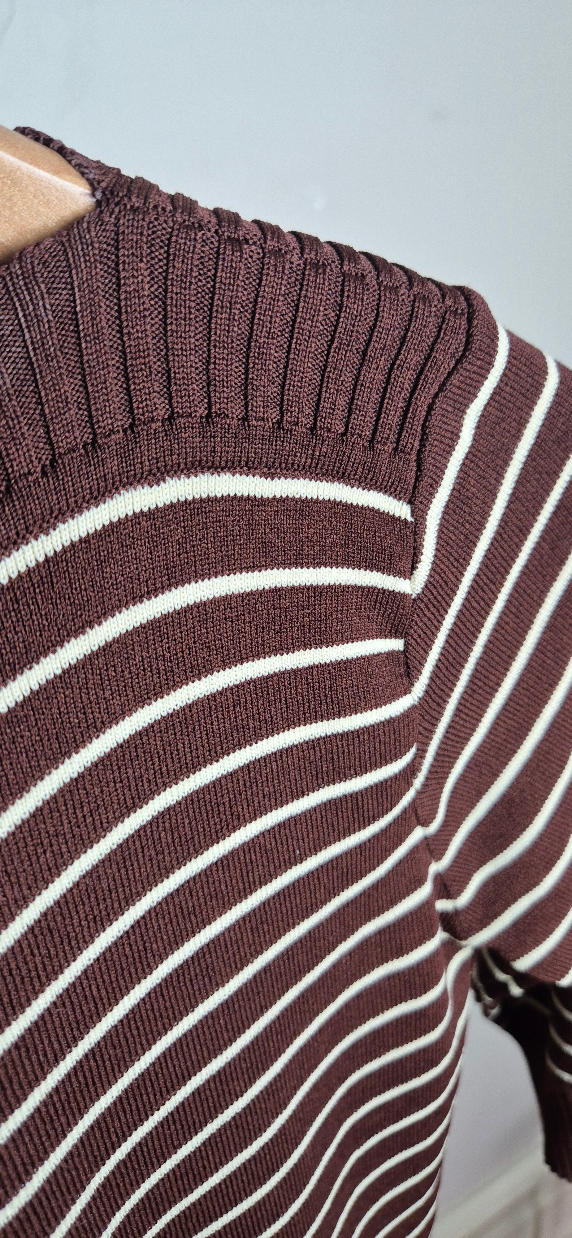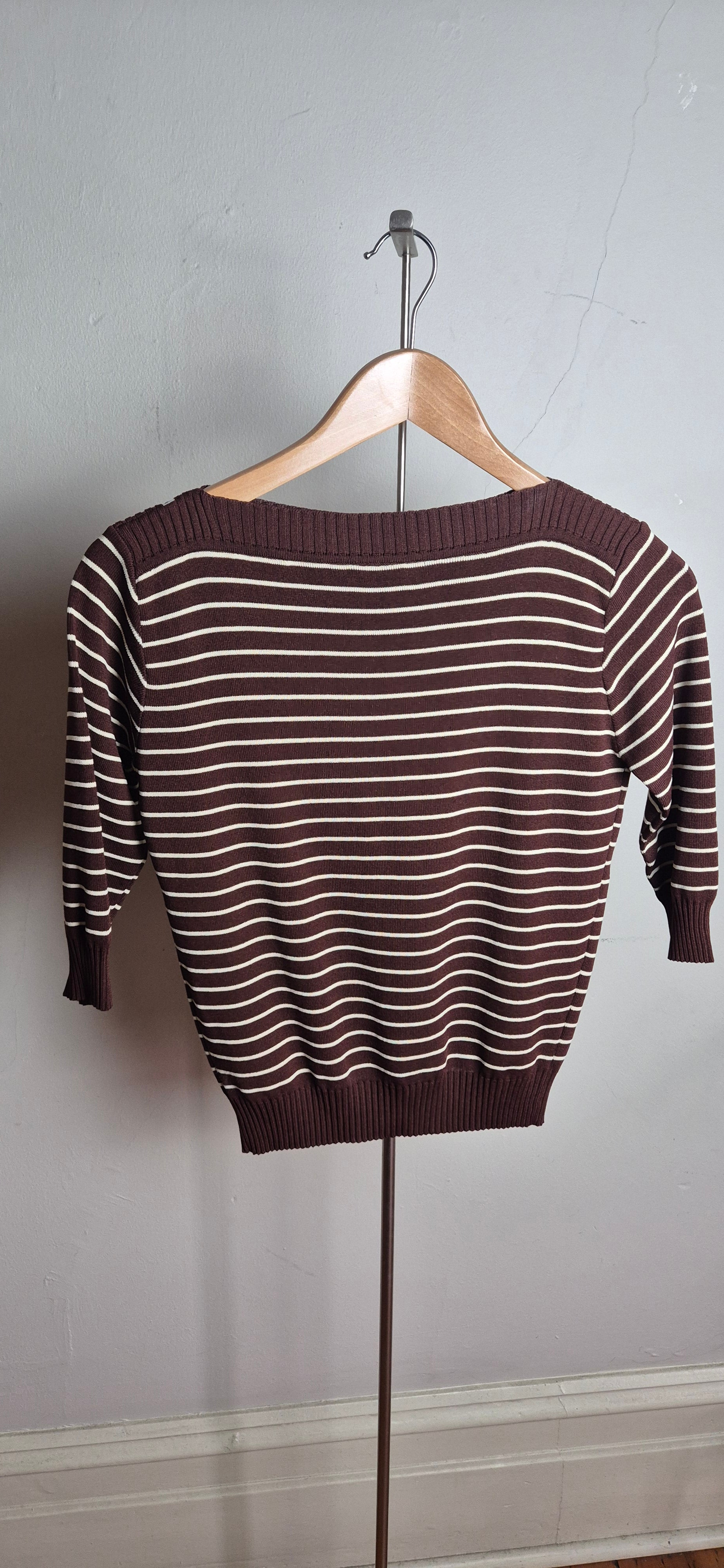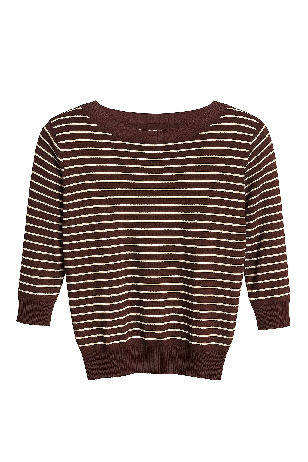 A classic staple with a twist, this chocolate brown and cream striped top offers effortless polish with its flattering boat neckline and softly cropped silhouette. The stretch rib cuffs and hemline give shape without clinging, while the midweight knit makes it perfect for layering through the cooler seasons.