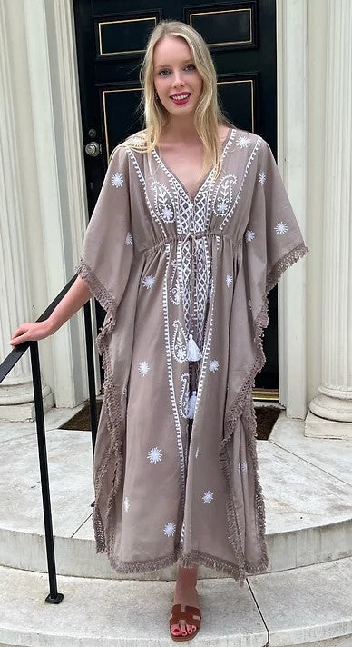 Presenting an elegant full-length kaftan crafted from French Linen and featuring crisp white embroidery on both the front and back. Detailed with full-length lace down both slits and the base, flattering side-slits, an under-breast drawstring, and stylish tassels. Crafted from 100% Cotton and designed in Australia, this piece is ethically made in Jaipur, India.