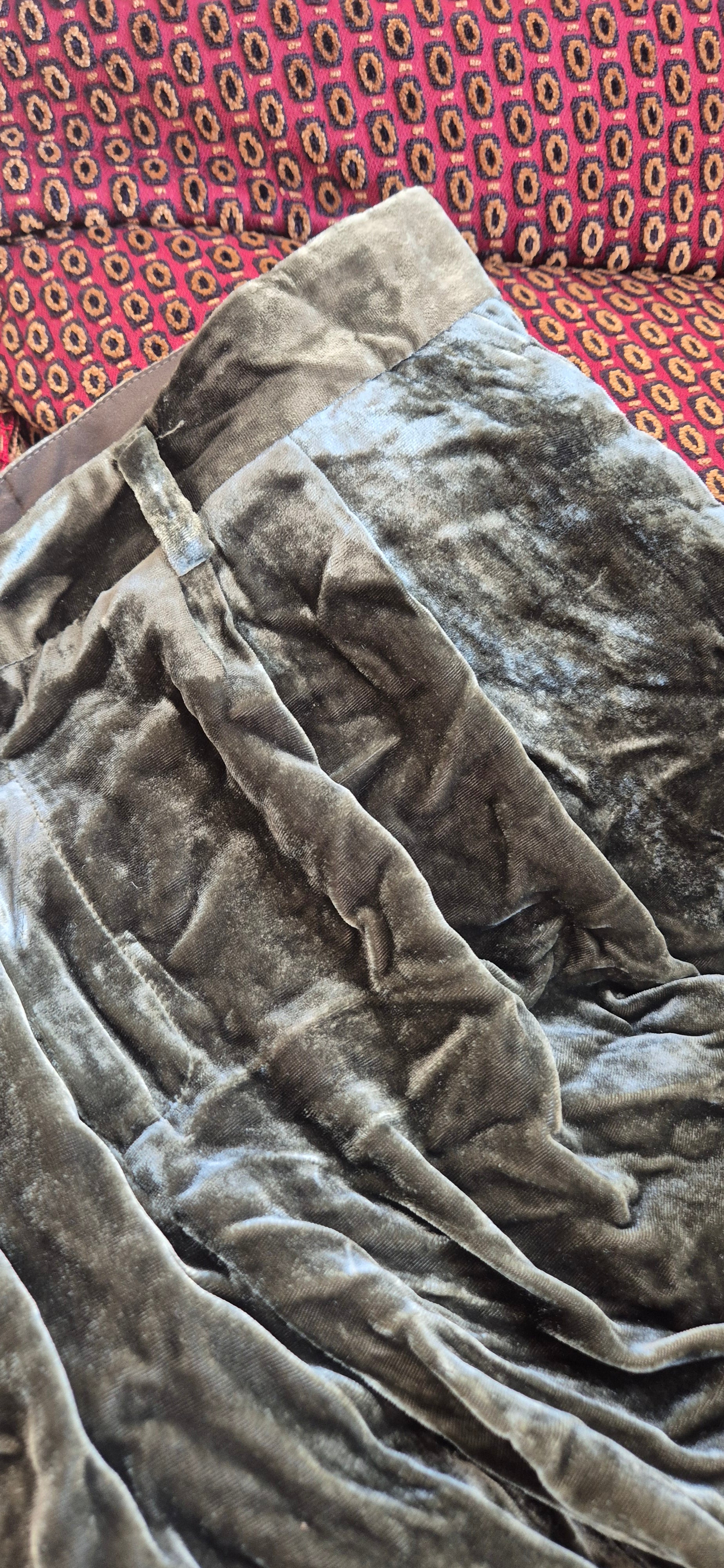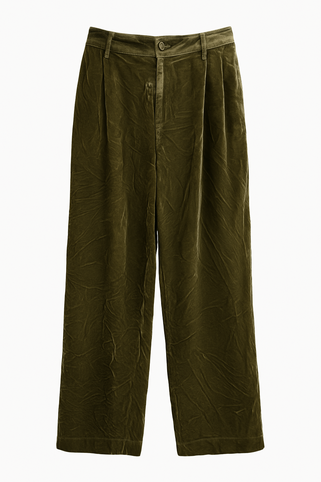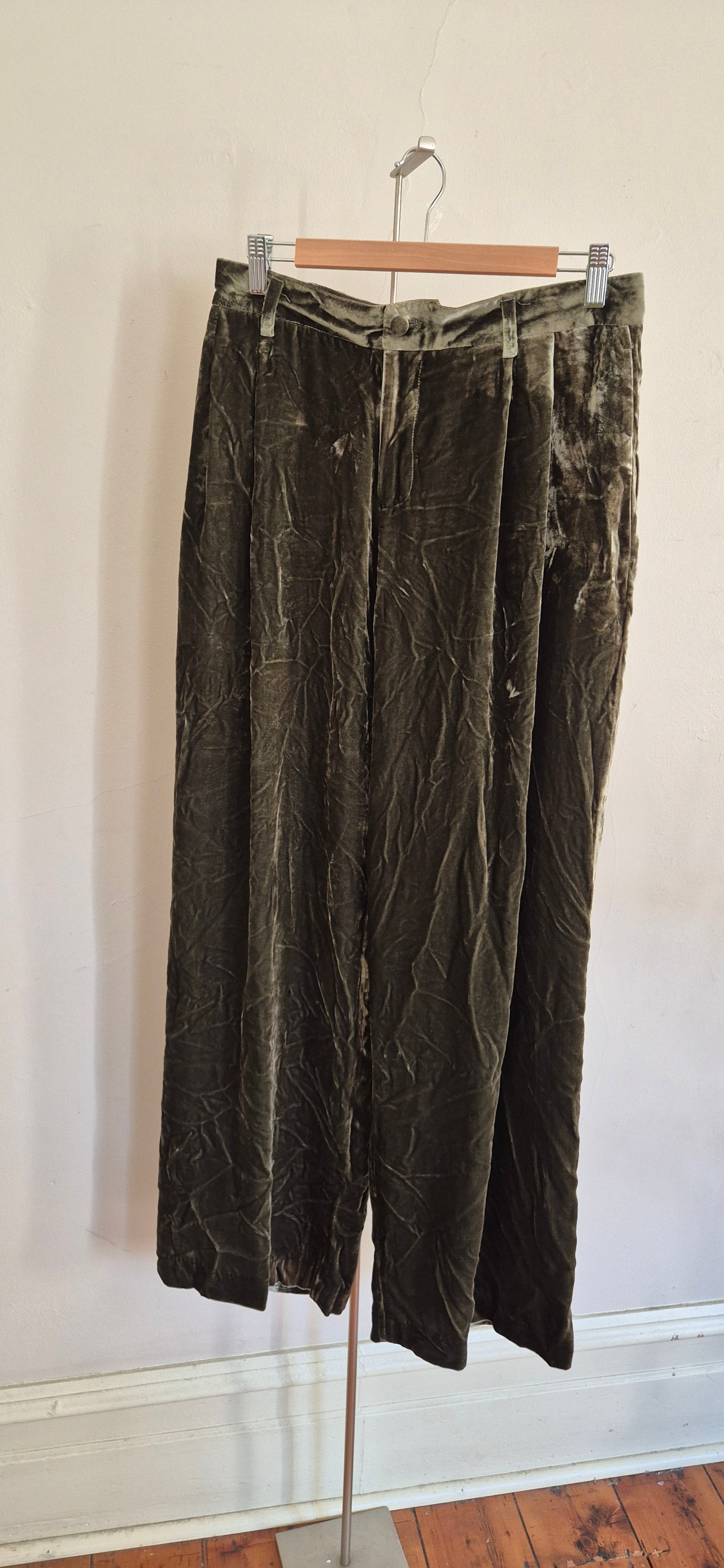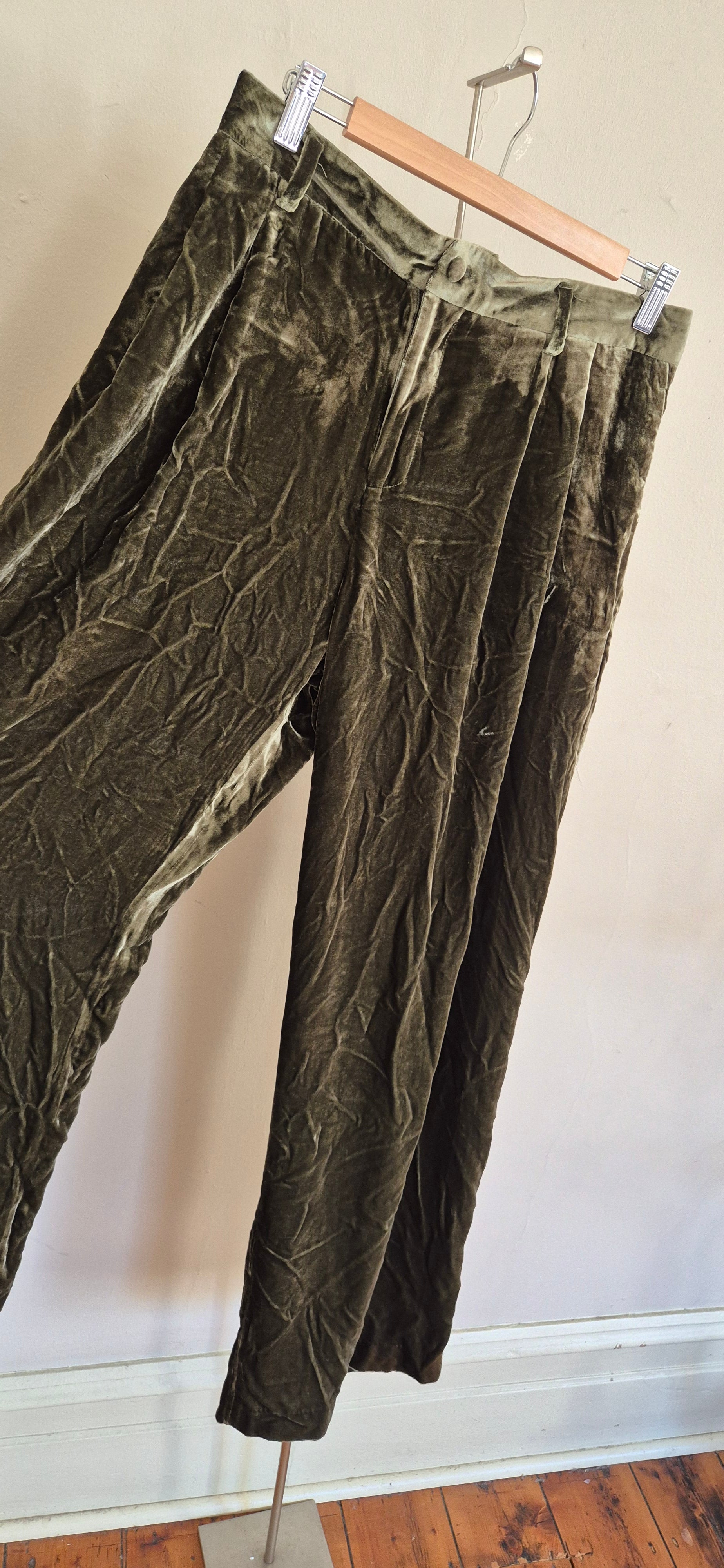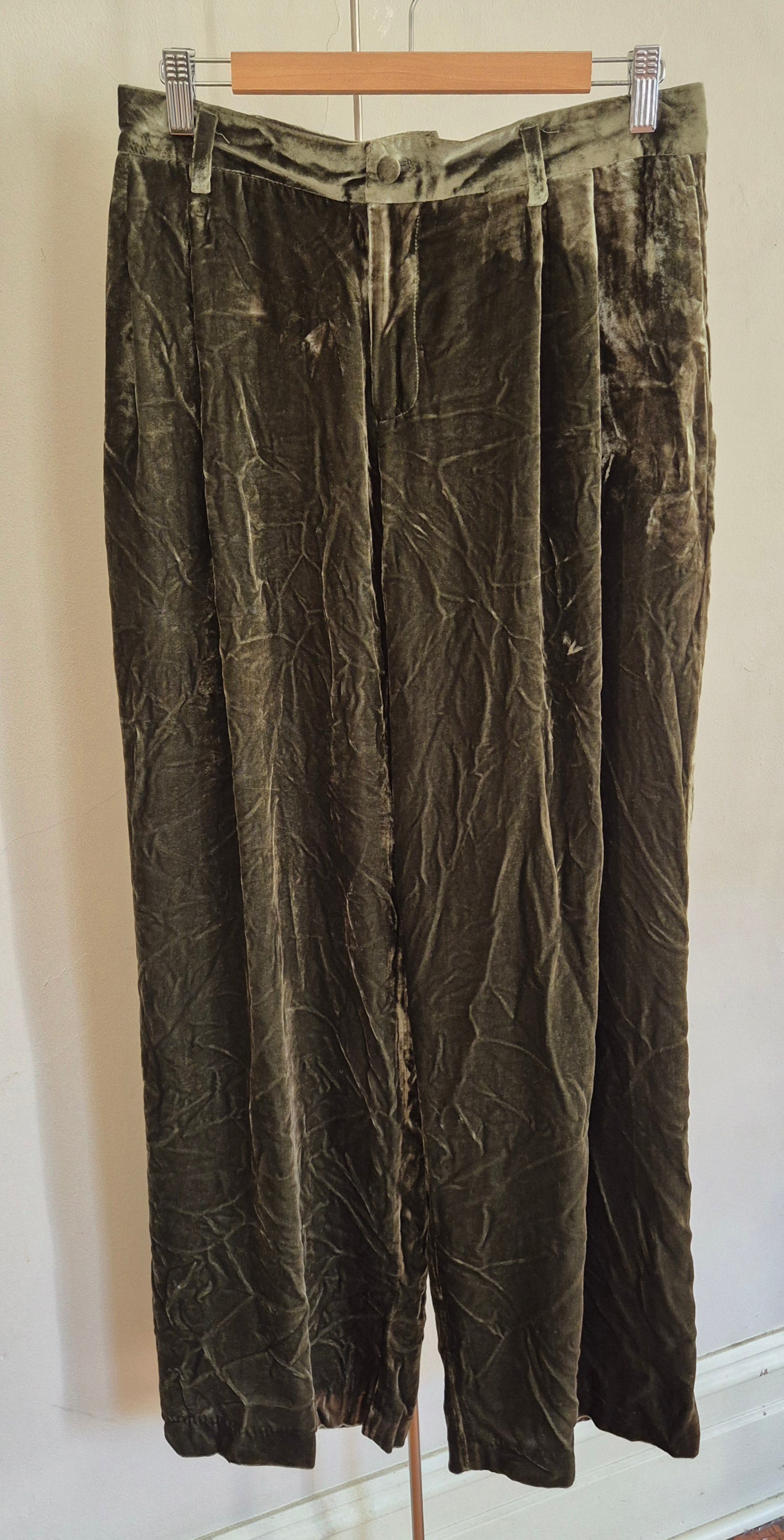 A luxurious pair of wide-leg pants from Australian label Oxford, crafted from a plush crushed velvet in a rich olive hue. Features include a fixed waistband with a fabric-covered button, belt loops, and a relaxed, draped silhouette that flows beautifully with movement.