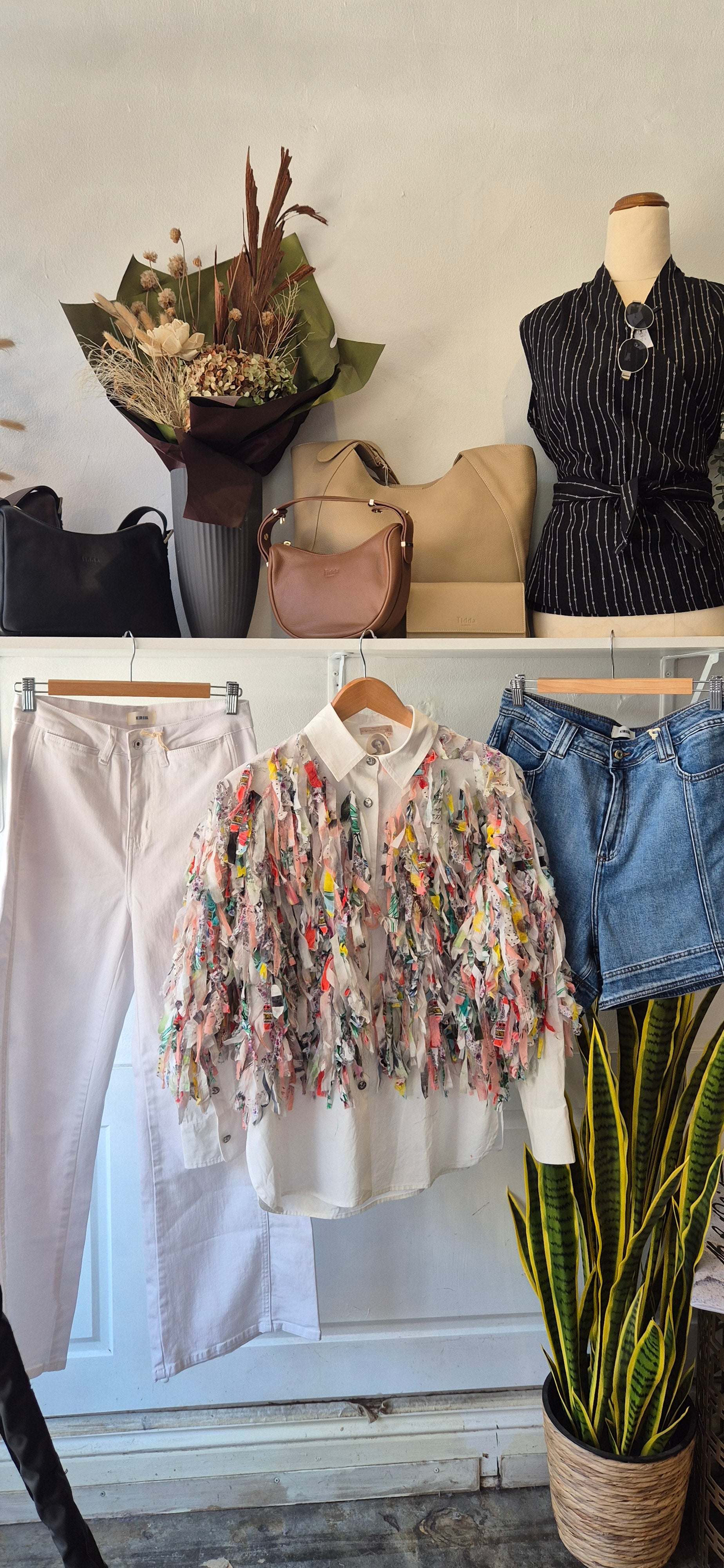 This one-of-a-kind shirt features custom Maud buttons and hand-stitched frill detailing made entirely from excess fabric from previous seasons. Each piece is uniquely crafted with no two shirts ever the same — a true celebration of creativity and zero-waste design. A timeless silhouette with a statement finish, made to be worn with pride and personality.