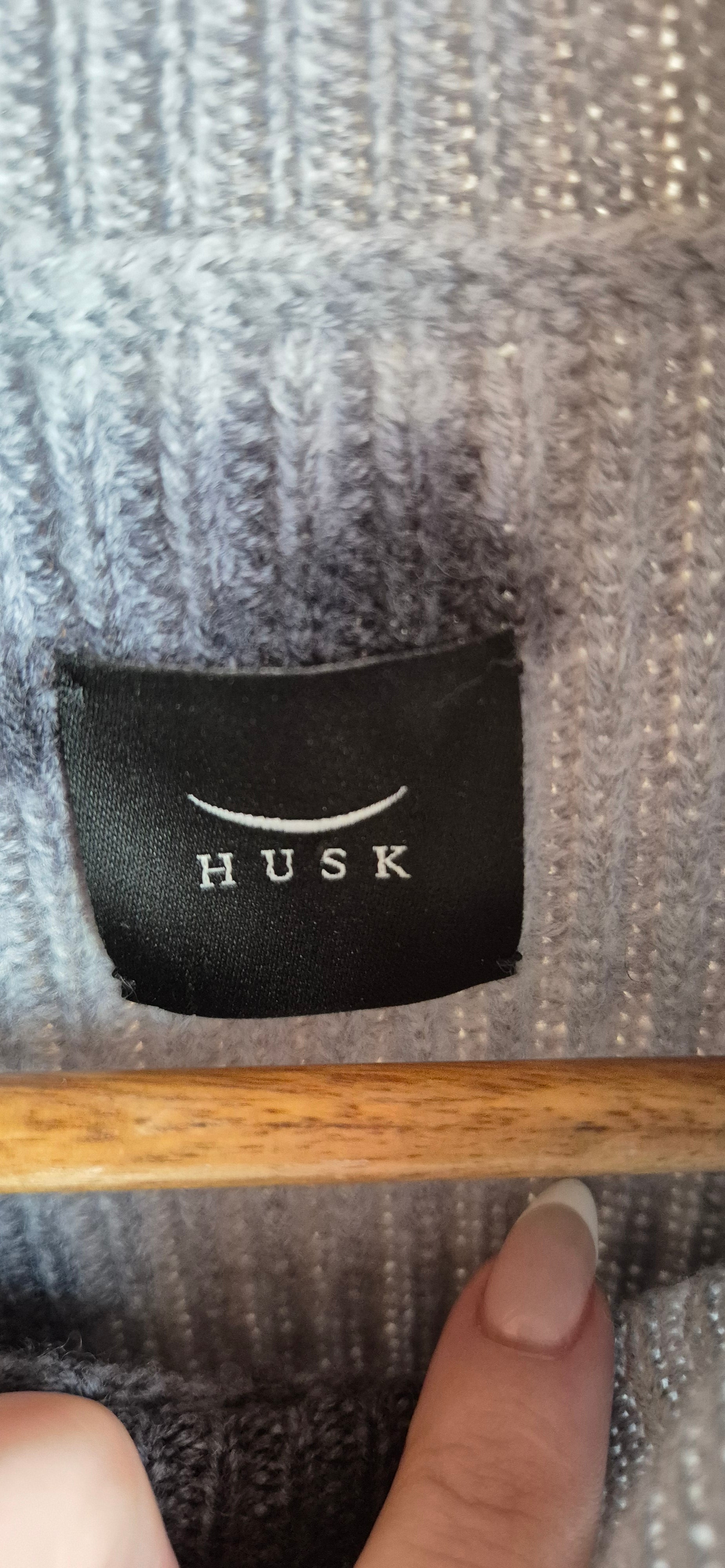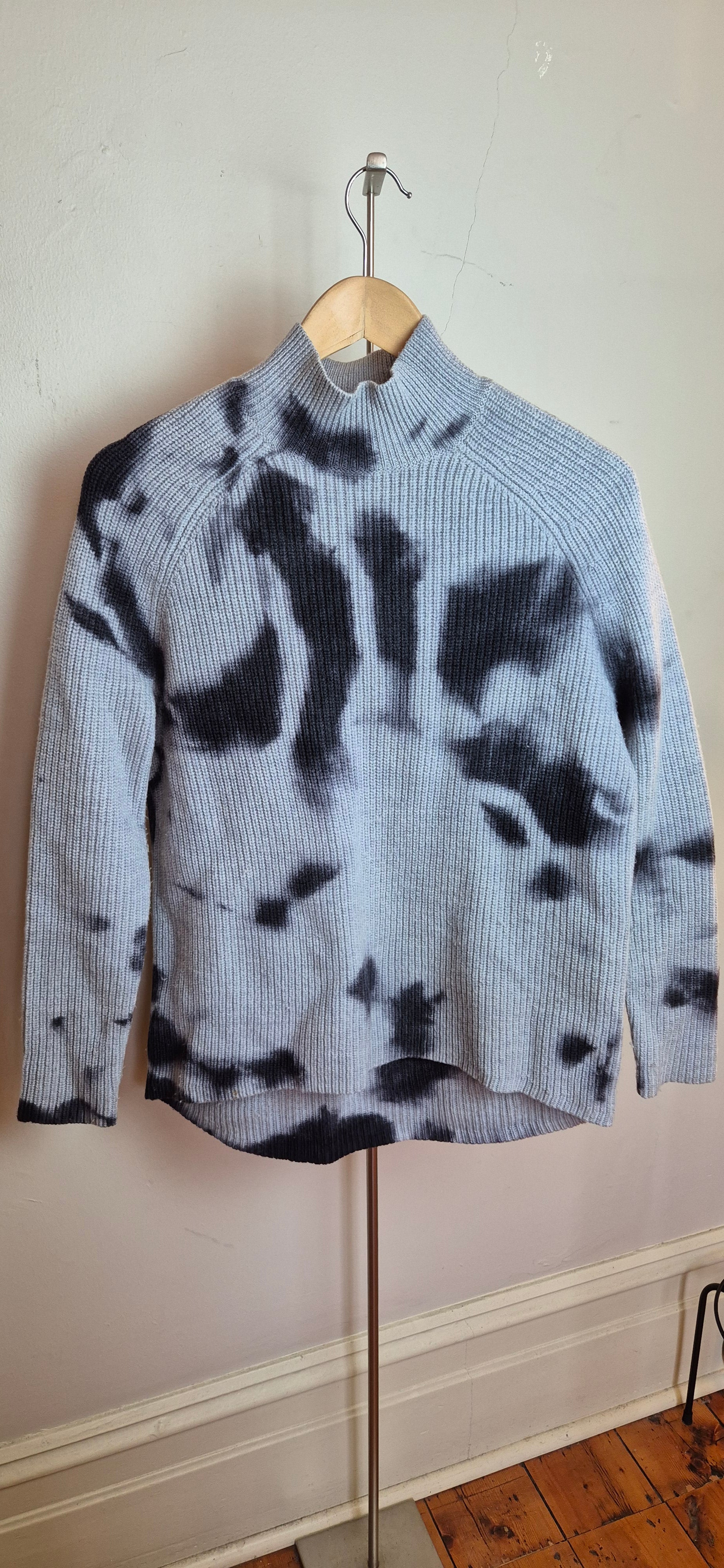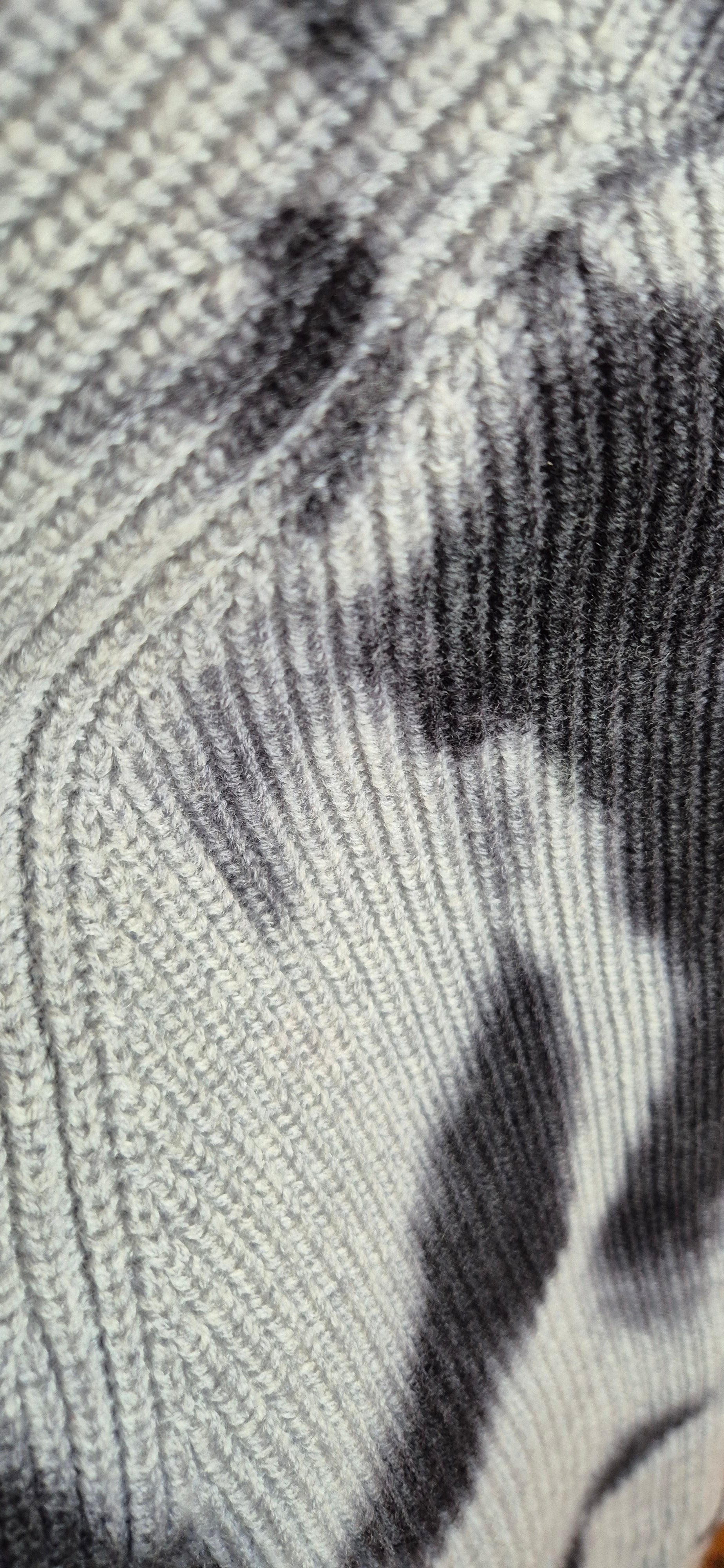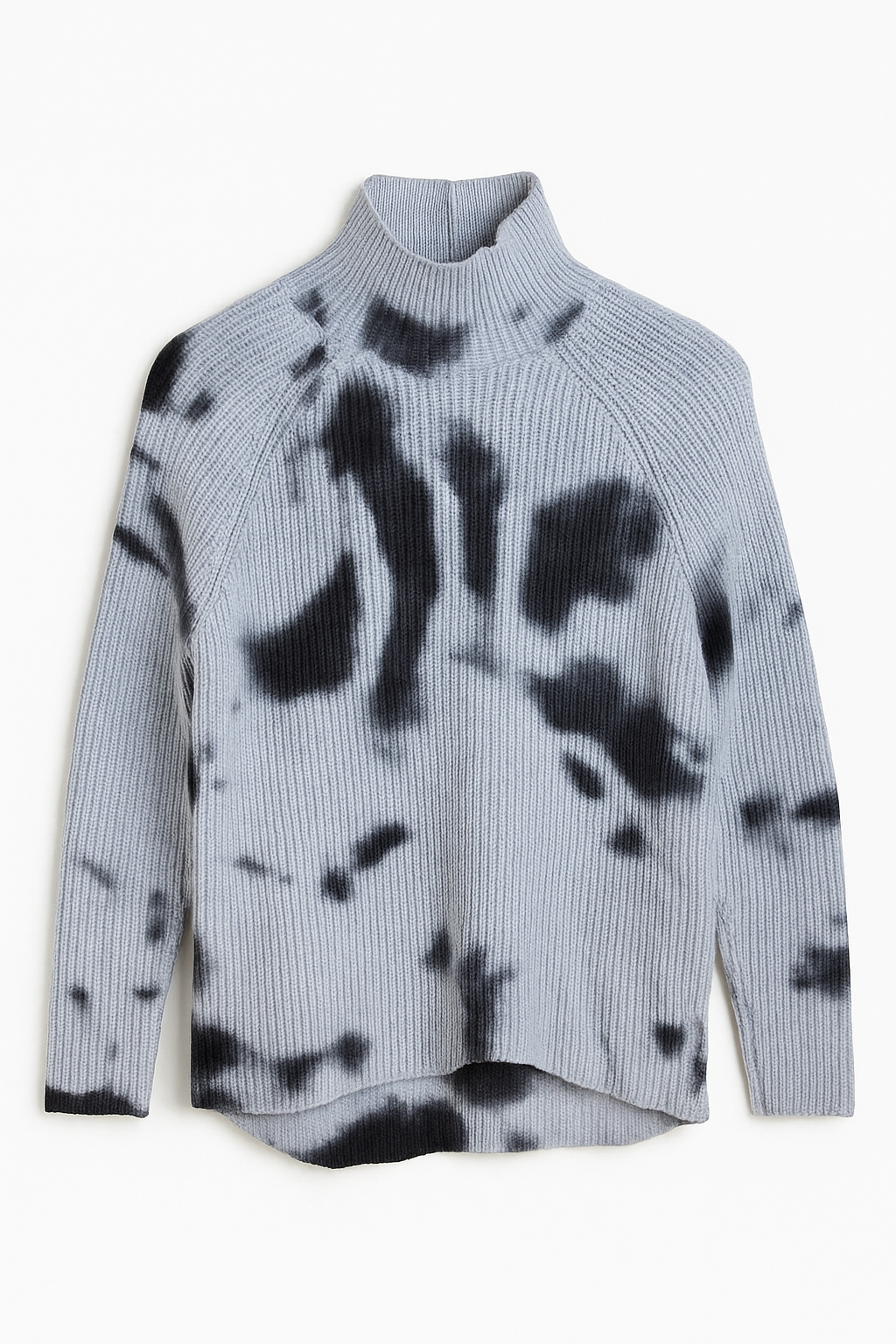 Crafted from premium wool by Australian designer label Husk, this ink-dye knit is a wearable work of art. The soft grey ribbed base is elevated by abstract black patterning, while the structured funnel neck and curved hem create a silhouette that’s both modern and flattering. Designed for warmth and quiet confidence, it’s a perfect statement piece for winter layering.