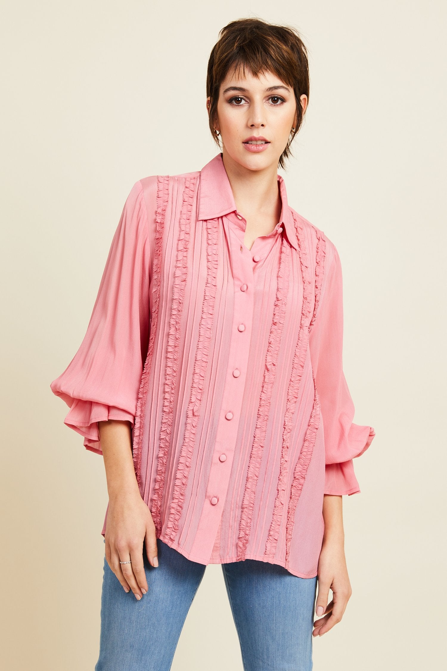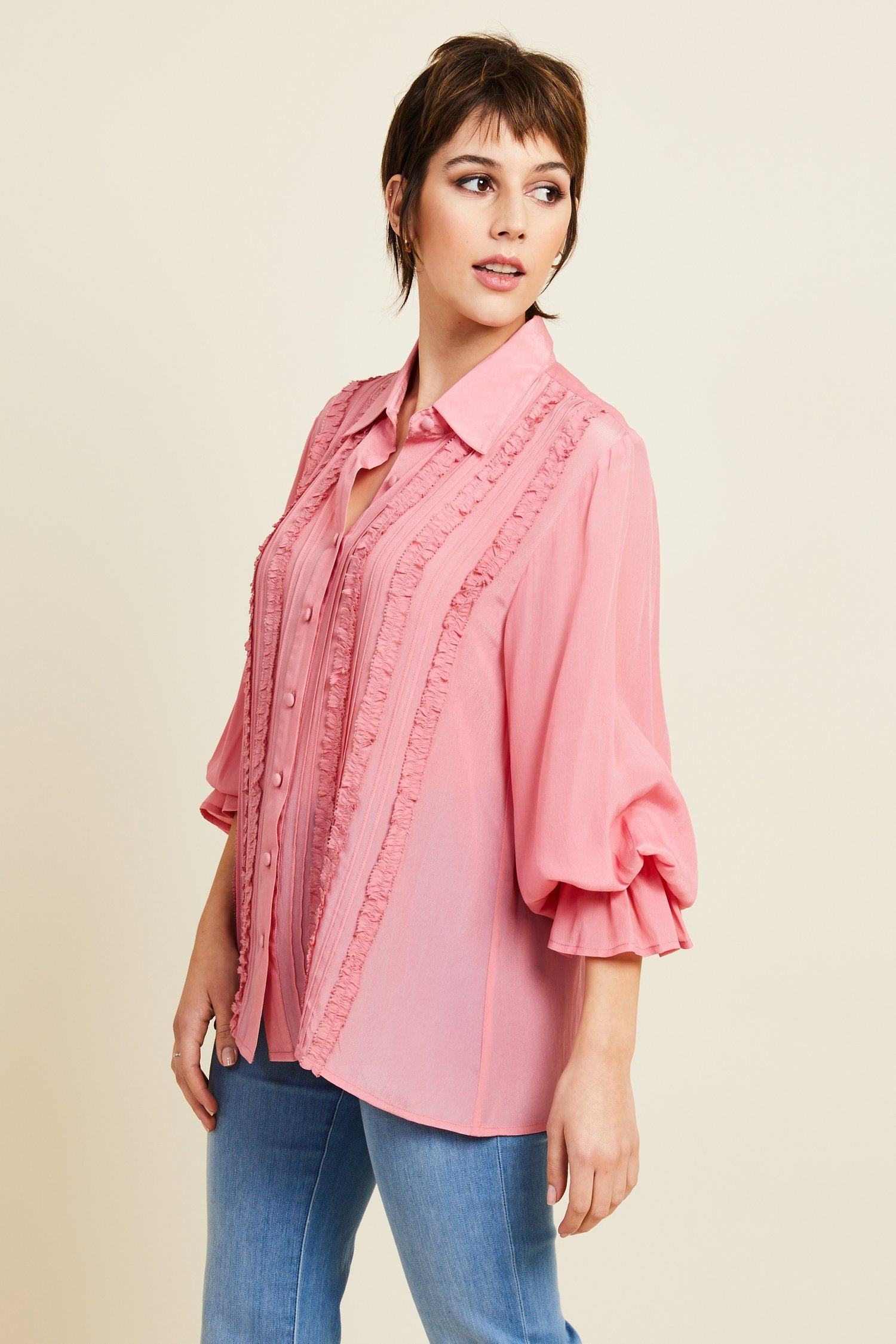 Elevate your wardrobe with the Kamare Harper Blouse, crafted from luxurious Viscose Crepe de Chine. This elegant shirt features a collar neckline, button-through front and delicate puff sleeves, adorned with charming frill details for a sophisticated and stylish look. This versatile blouse pairs perfectly with jeans for effortless street-style or with velvet for a timeless and chic evening look.