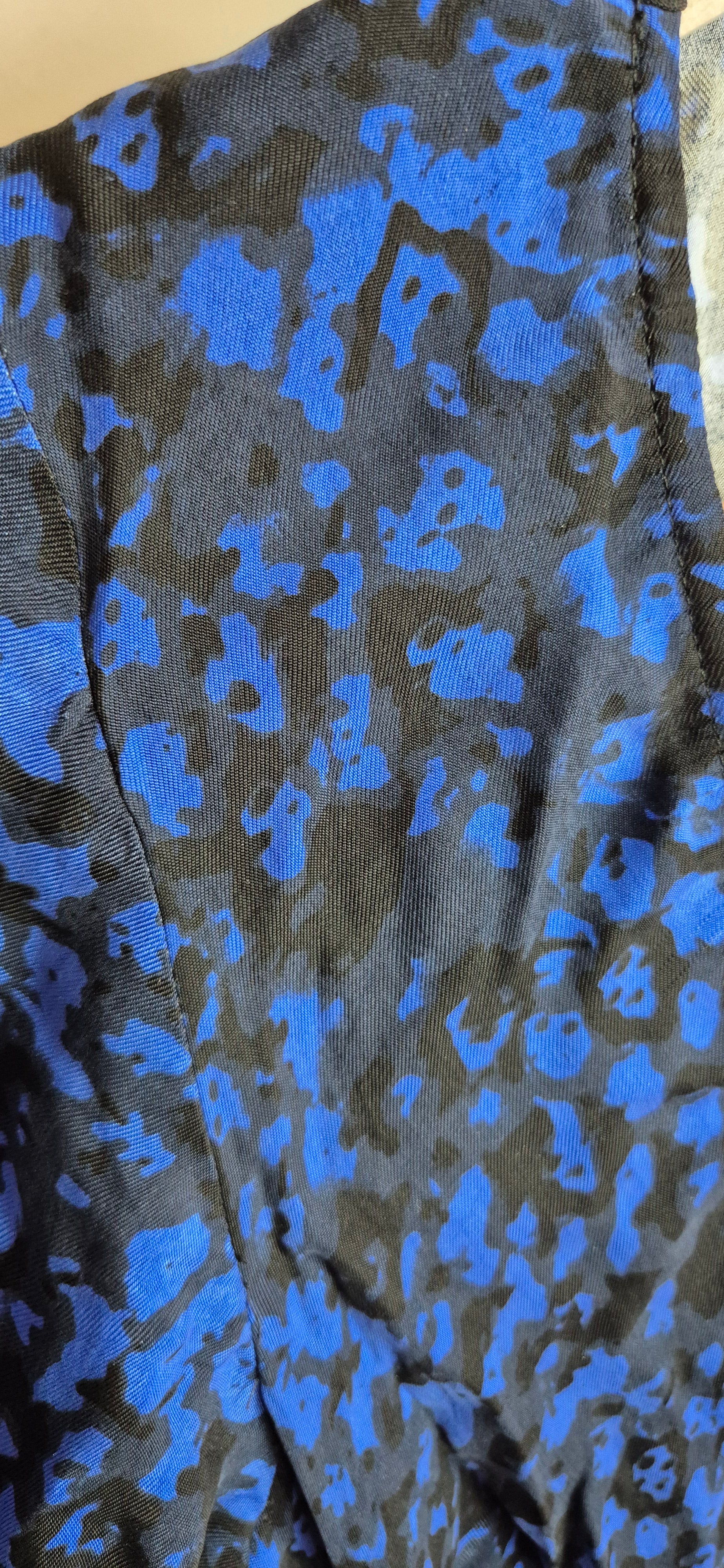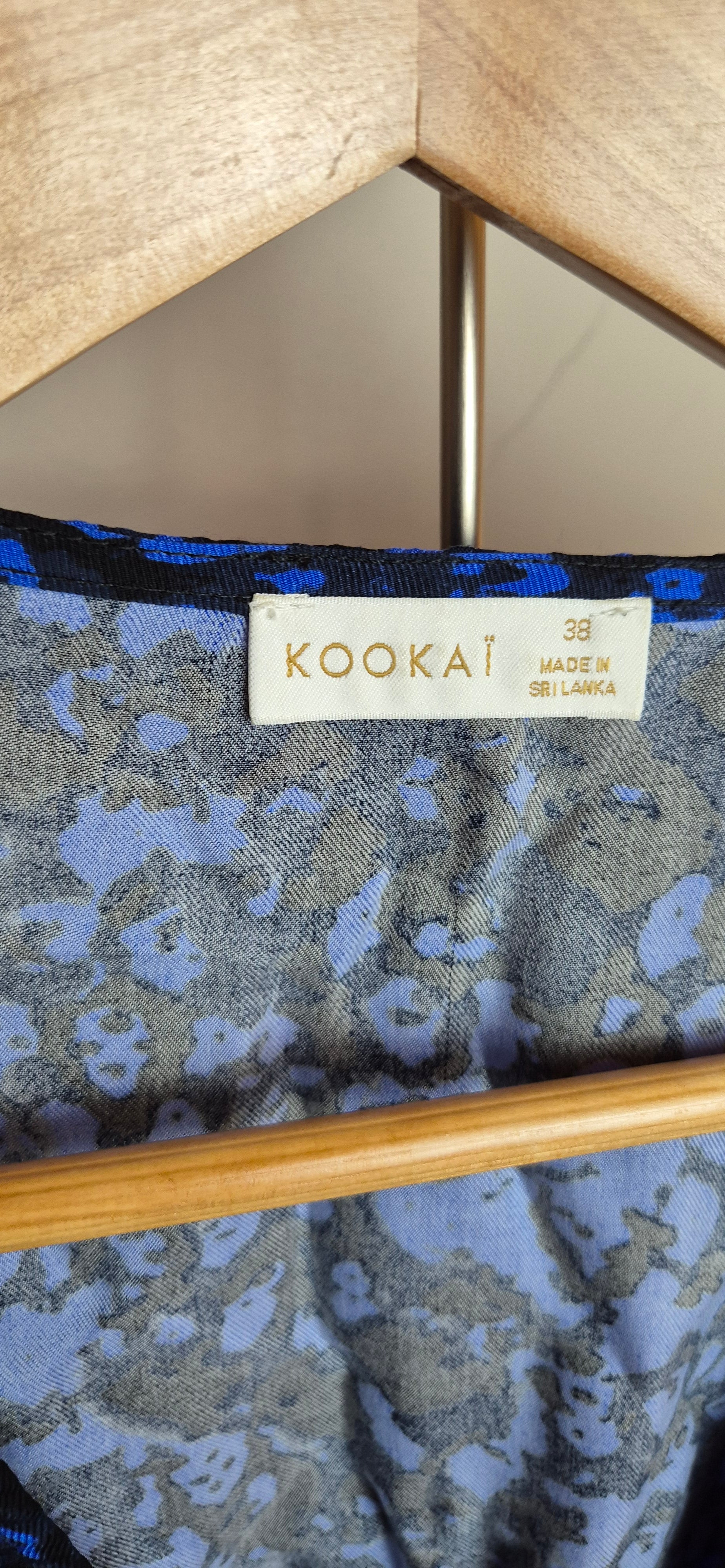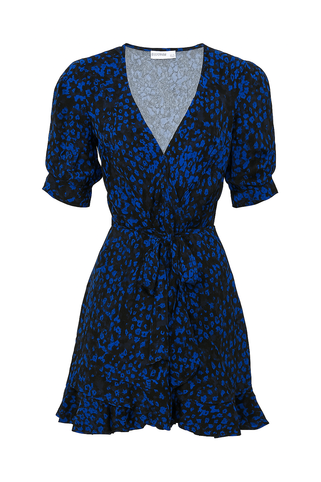 A striking silhouette in a bold palette, this Kookai wrap dress features a deep V-neckline, gathered short sleeves, and a playful ruffled hemline. Rendered in a rich sapphire blue with abstract black patterning, it cinches at the waist with a self-tie belt to create shape. Ideal for day-to-night styling—just add boots and a blazer or heels and a bold lip. Preloved in excellent condition.