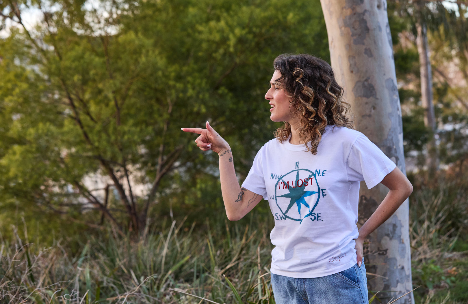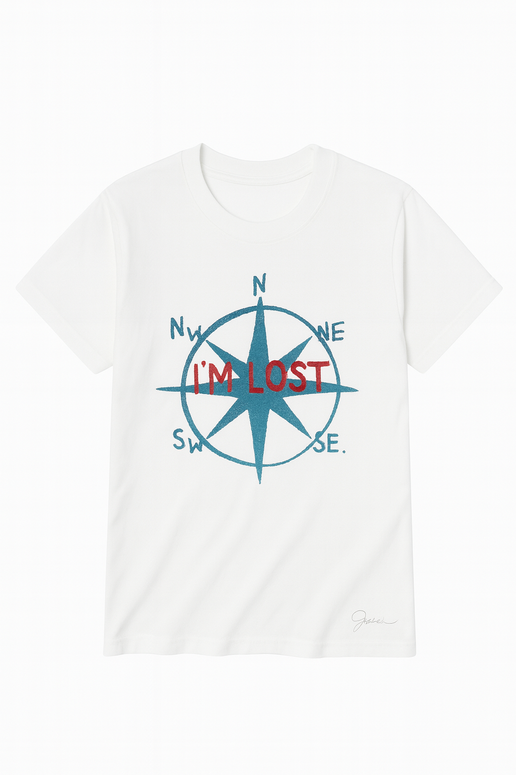 Crafted from soft, breathable cotton, this white short-sleeve tee features a bold hand-drawn compass design in blue with playful “I’M LOST” lettering in red. Finished with a subtle signature logo near the hem, it’s an easy, relaxed-fit style perfect for casual days and layering year-round.