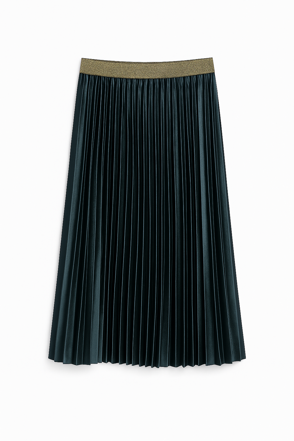 Brand new and ready to wear, this pleated midi skirt brings just the right amount of shine. Crafted from a lightweight, softly lustrous fabric, it features structured pleats that create beautiful movement and a shimmering gold elastic waistband for an elevated finish. Dress it up with heels and a blouse, or pair with a chunky knit for a more relaxed take.