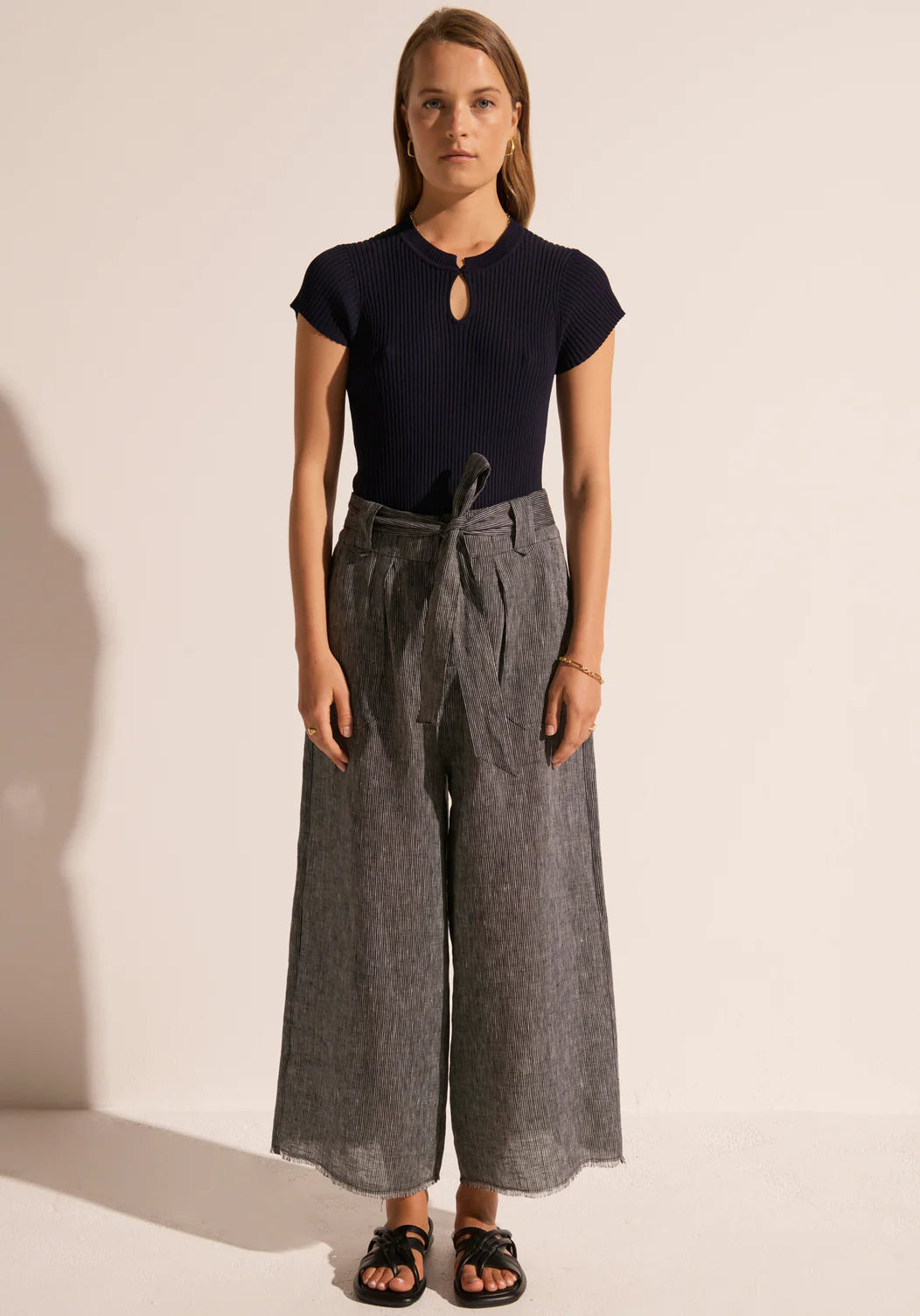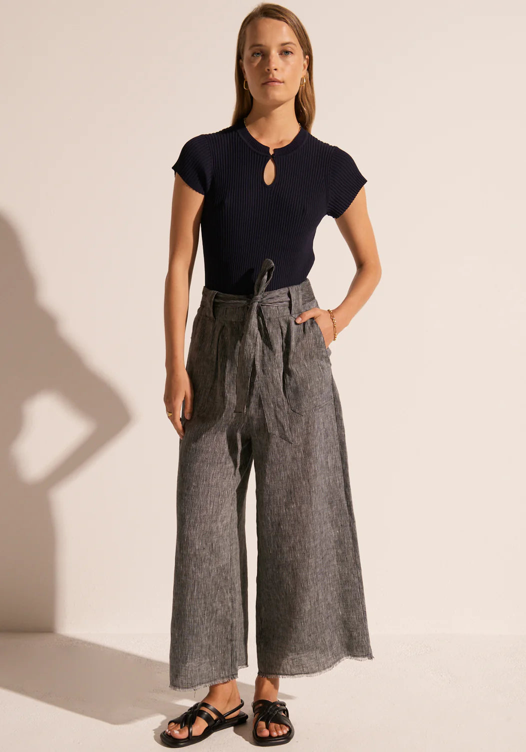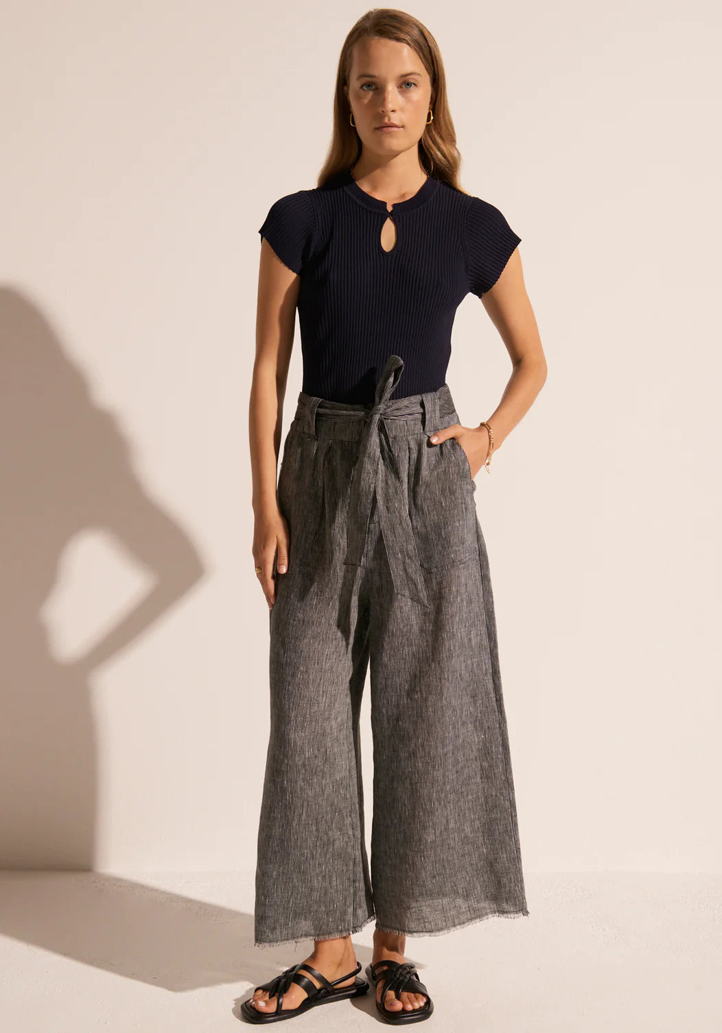 Introducing the Milla Knit Tee, featuring a sophisticated silhouette crafted from a premium rayon-nylon blend. Boasting a keyhole detail and single button closure, it is complemented with fine ribs, cap sleeves and side splits for a luxurious look.