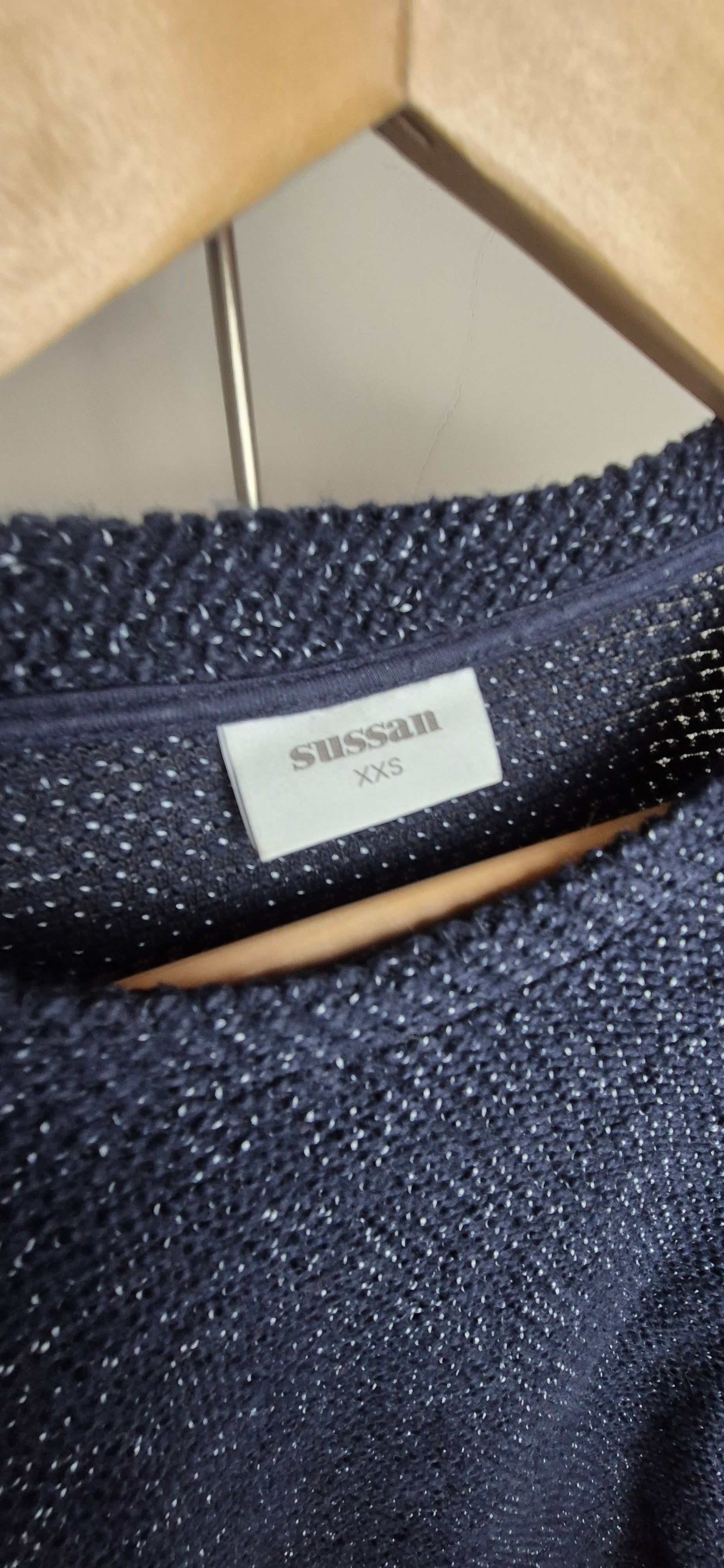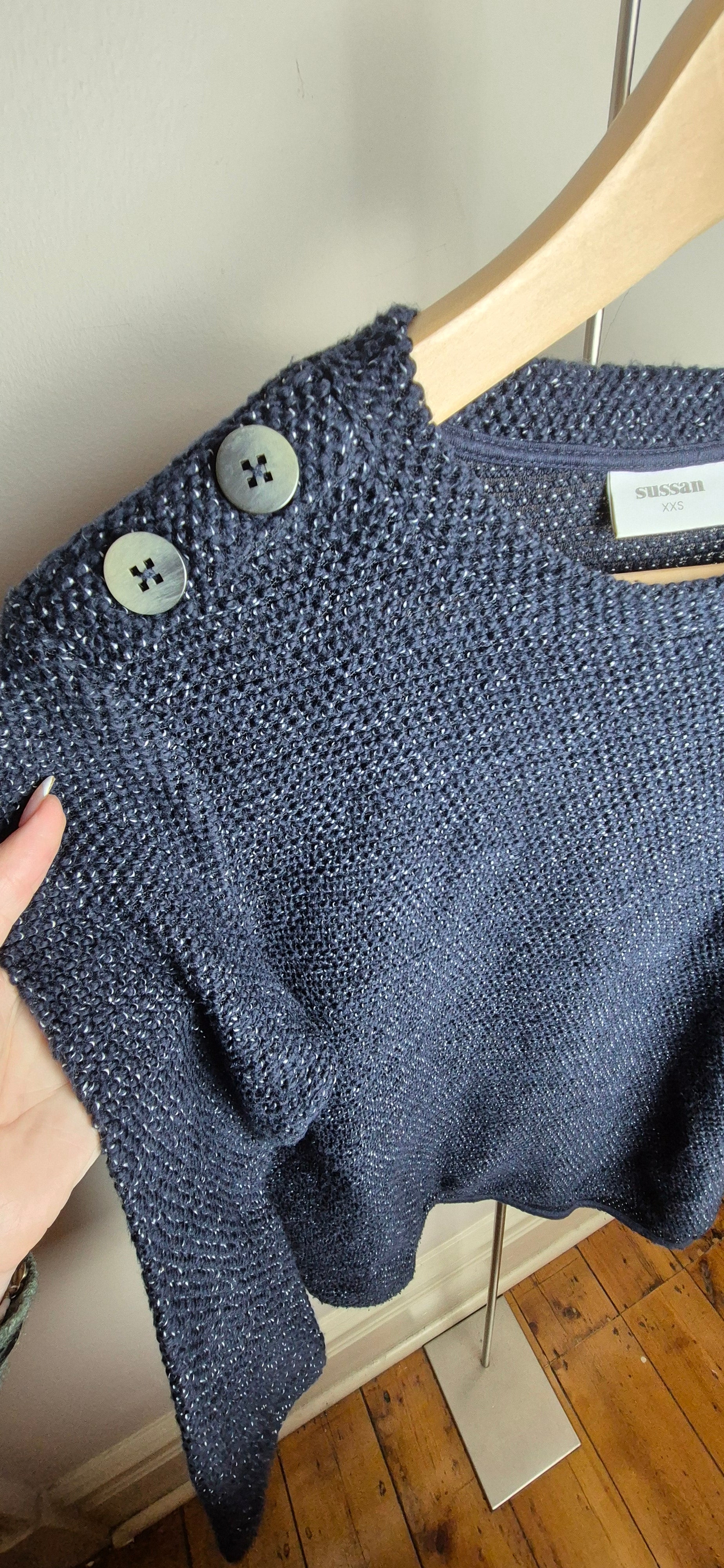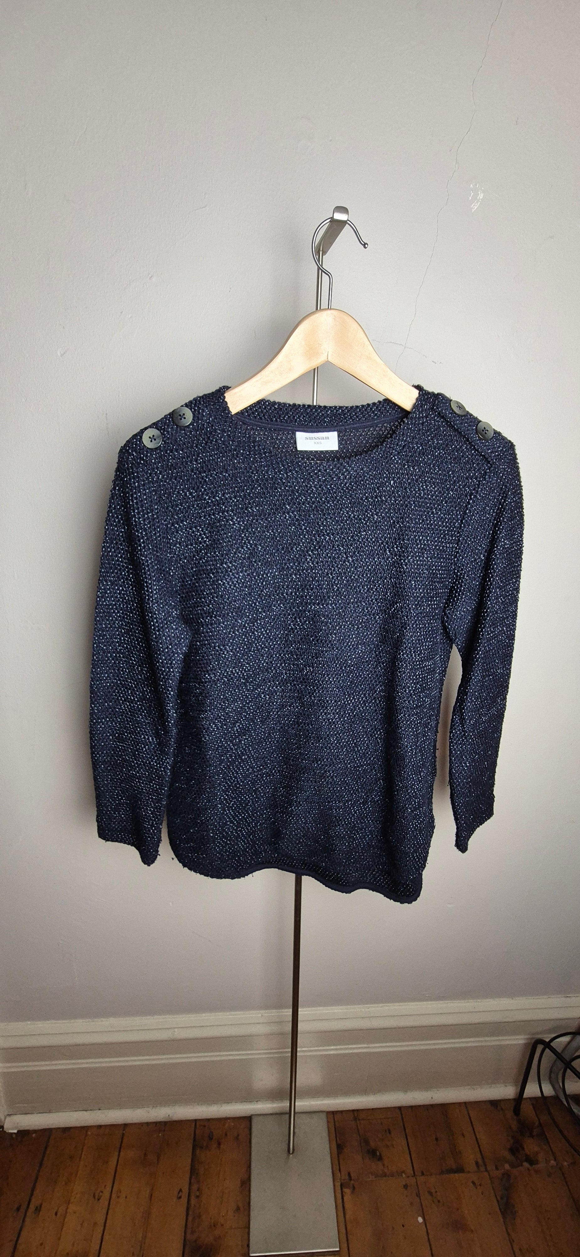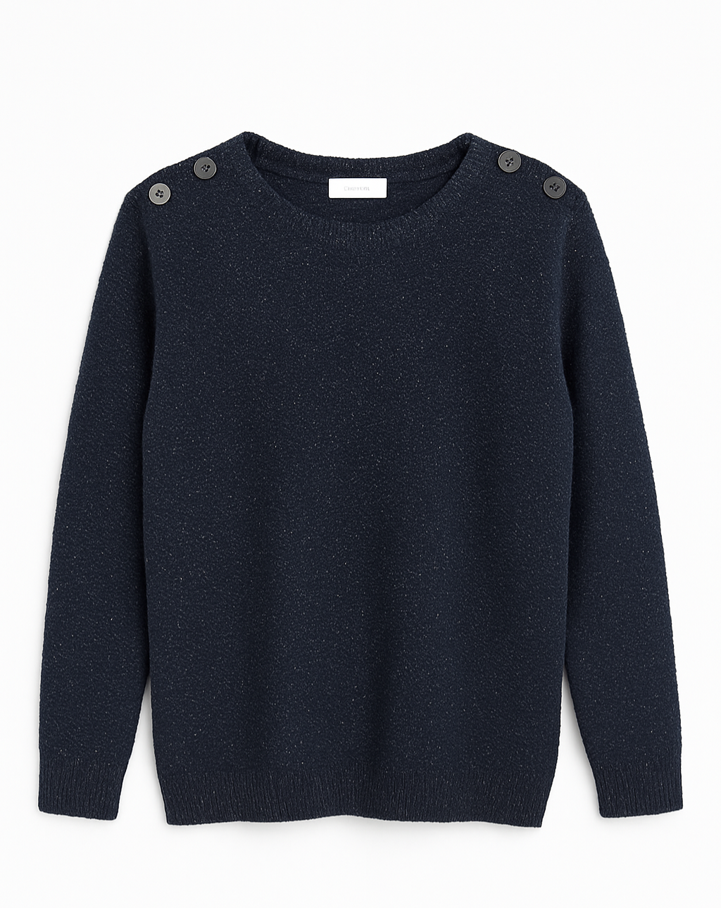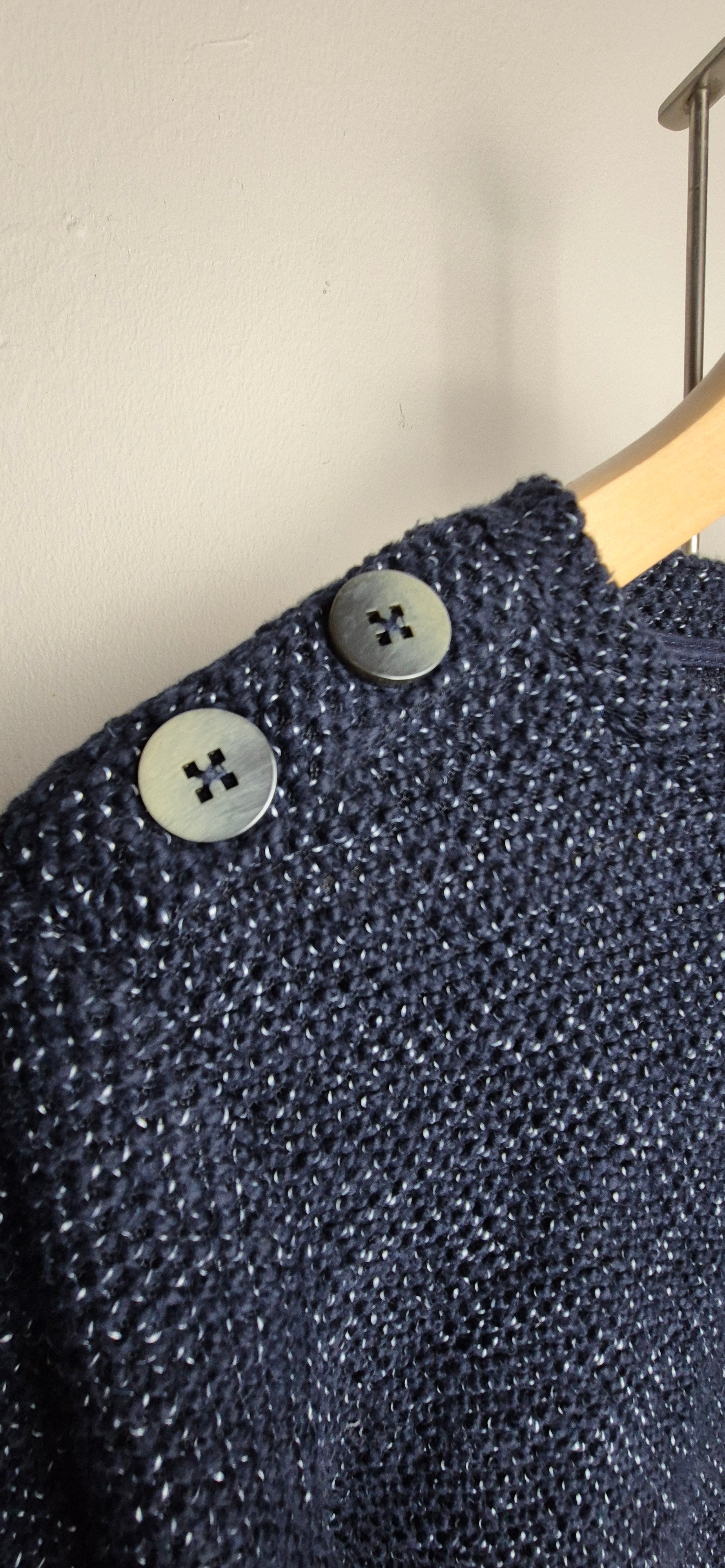 A timeless winter essential with a hint of nautical charm. This Bensimon knit jumper features a rich navy speckled weave and a classic crew neckline, elevated by bold button detailing at each shoulder. Soft yet structured, it's the perfect layering piece—pair with high-waisted denim or a wool skirt for effortless, cosy style. Preloved and in excellent condition.