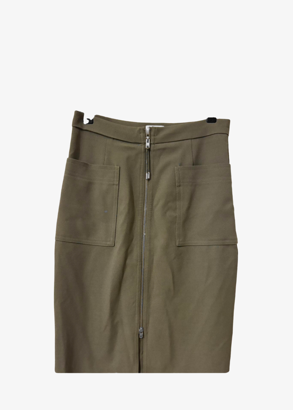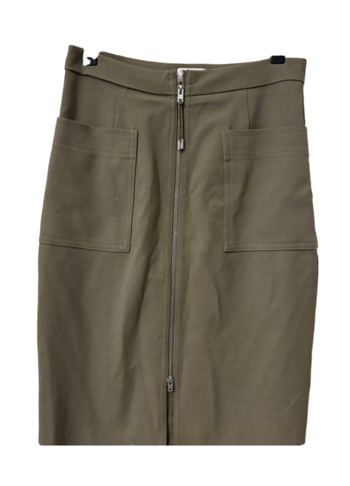 Stay stylish and functional with this olive green utility midi skirt. Featuring a sleek zip-front closure and oversized patch pockets, this skirt combines practicality with modern design. The structured fabric provides a flattering silhouette, while the versatile olive green tone makes it easy to pair with your wardrobe favorites. Perfect for both casual and semi-formal occasions, this piece adds a touch of effortless edge to any outfit.