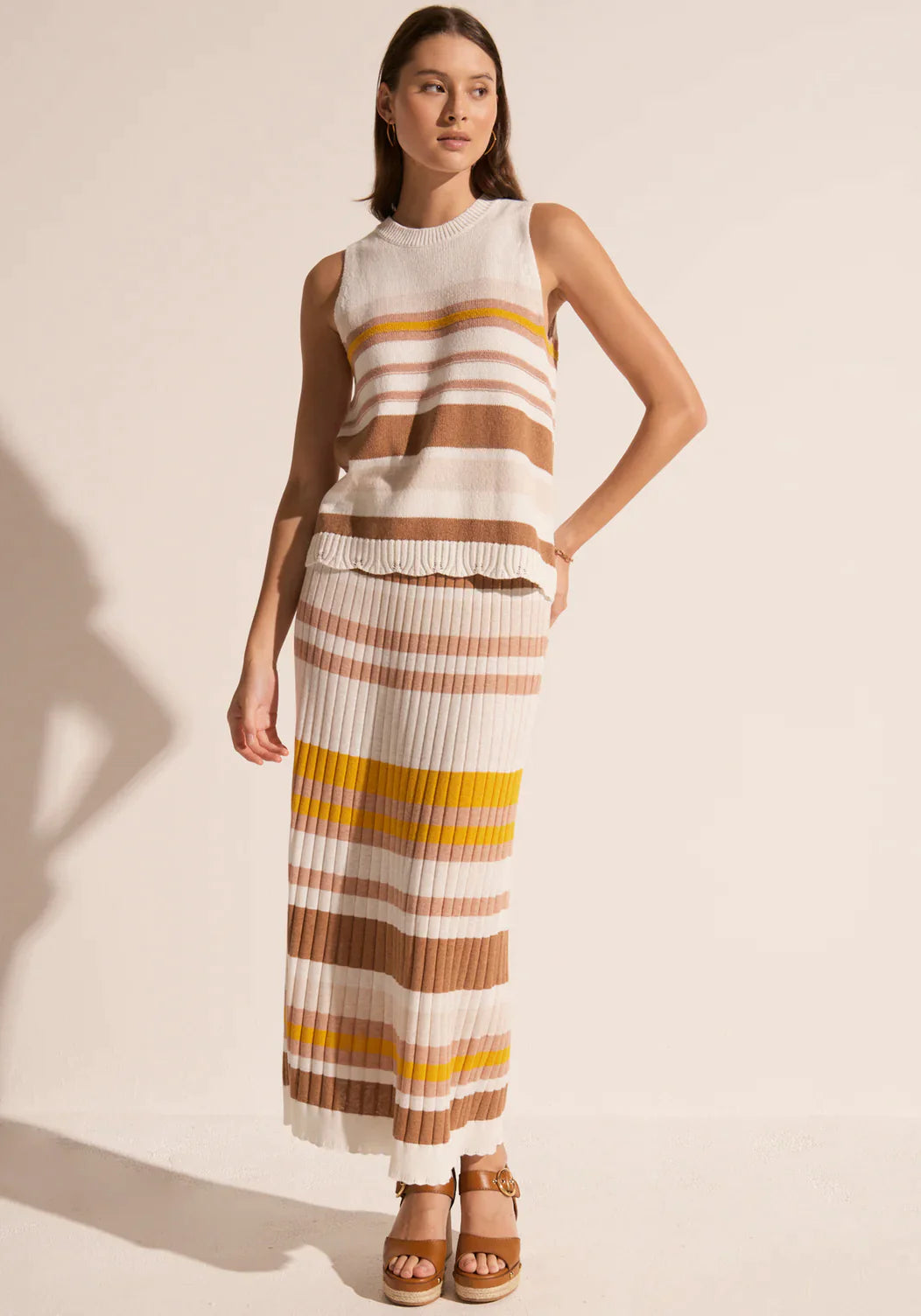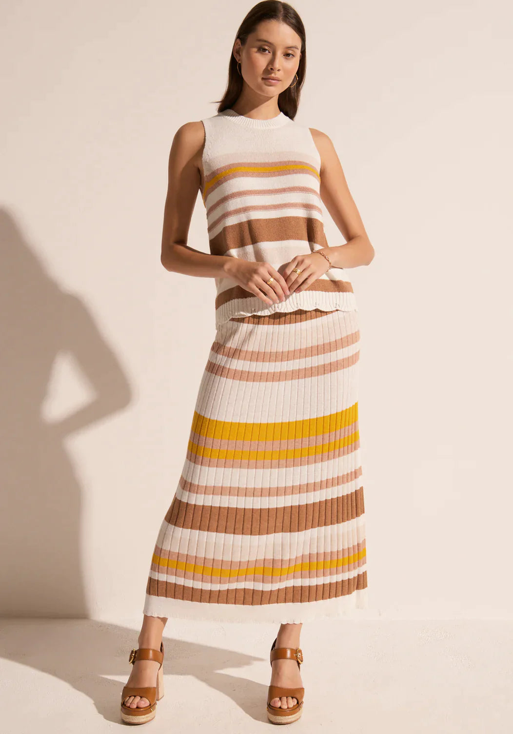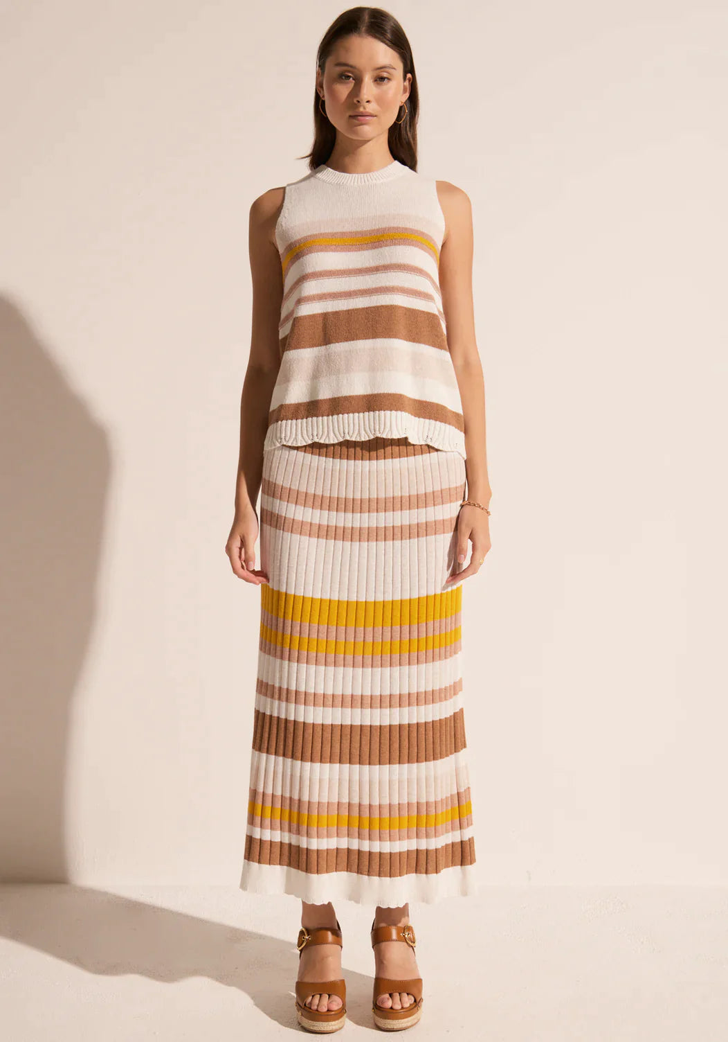 The Optic Knit Skirt gracefully entrances new season fashion, a signature multistripe delight. An elasticised waistband made from lightweight knits provides optimal breathability for warm weather wear. The carefully chosen toffee, honey and ivory palette creates a delightful harmony for the multistripe. Characteristic wide-ribbing and hint of Scallop and Pointelle detailing at the hem evoke an exquisite, tailored feel. An alluring combination of 36% Linen, 44% Cotton, 20% Recycled Polyester weaves a sartorial story of class and comfort.
