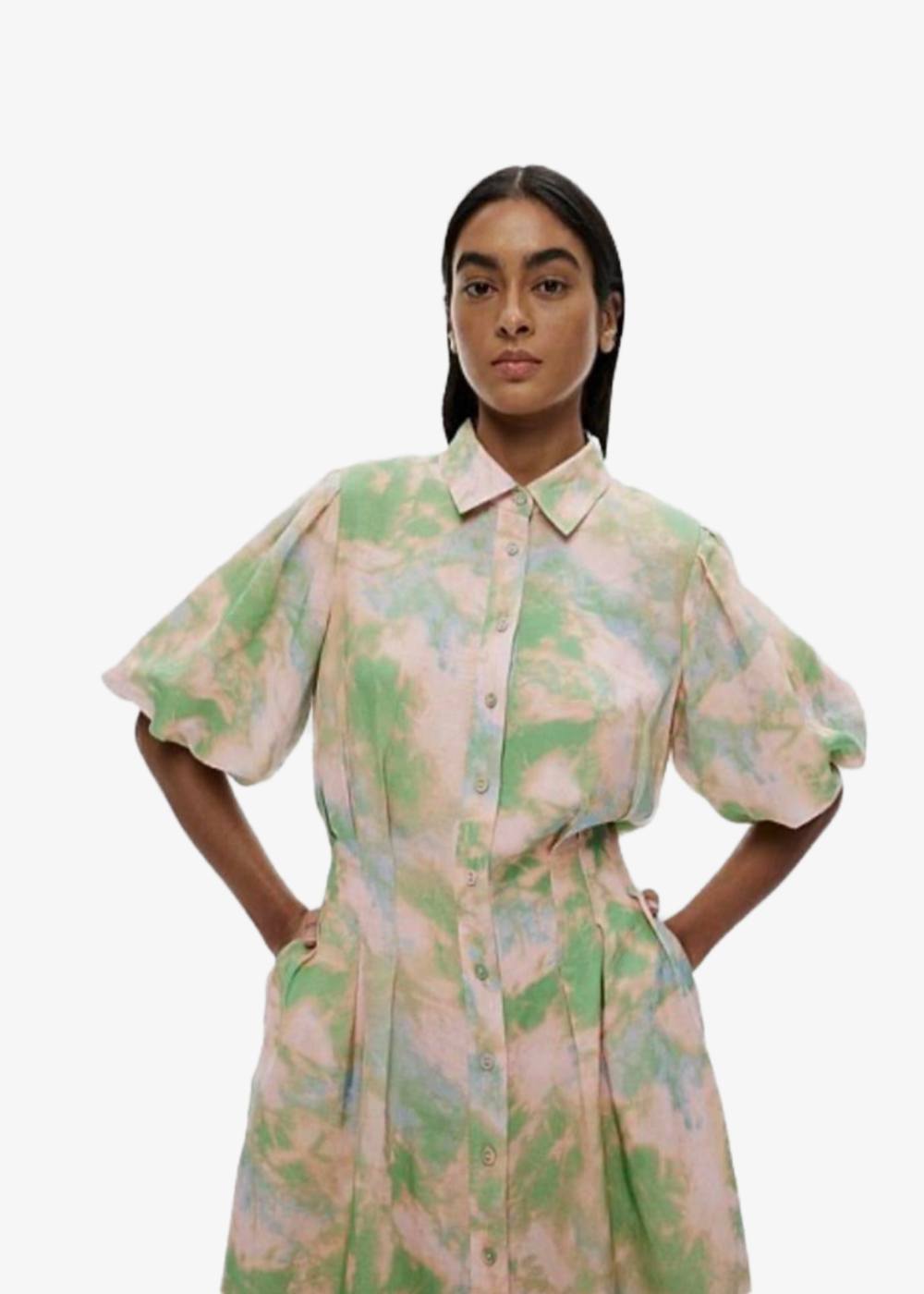 Brighten your wardrobe with this pastel tie-dye dress featuring an elegant button-up design and voluminous puff sleeves. This playful yet polished piece combines modern femininity with timeless comfort, making it the perfect outfit for weekend brunches, casual outings, or summer events. With its subtle green and peach hues, it’s easy to style and full of personality.