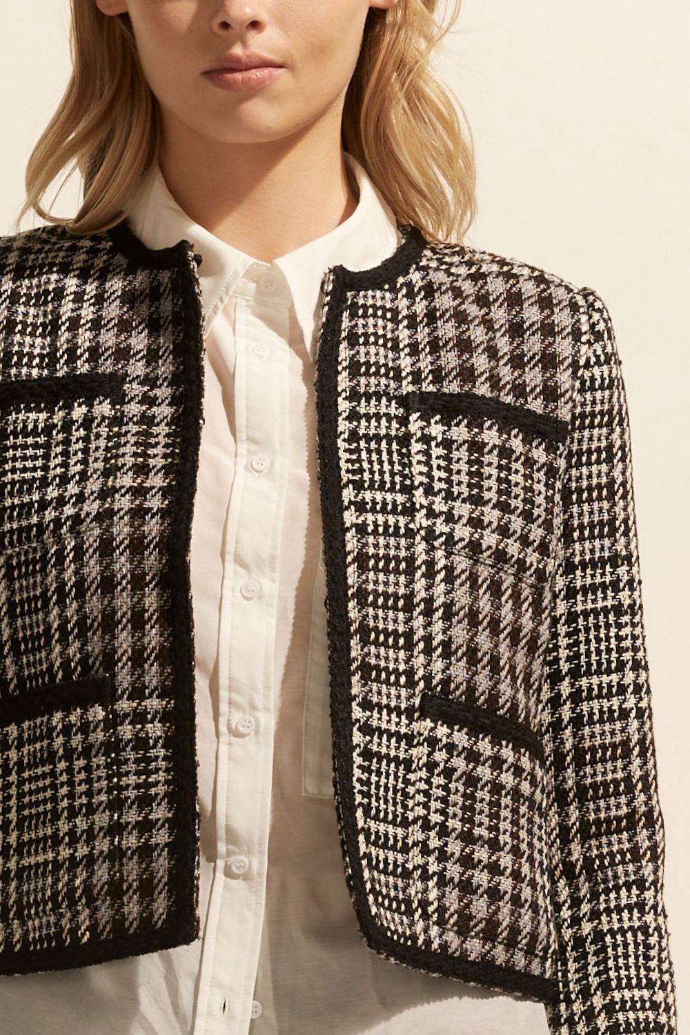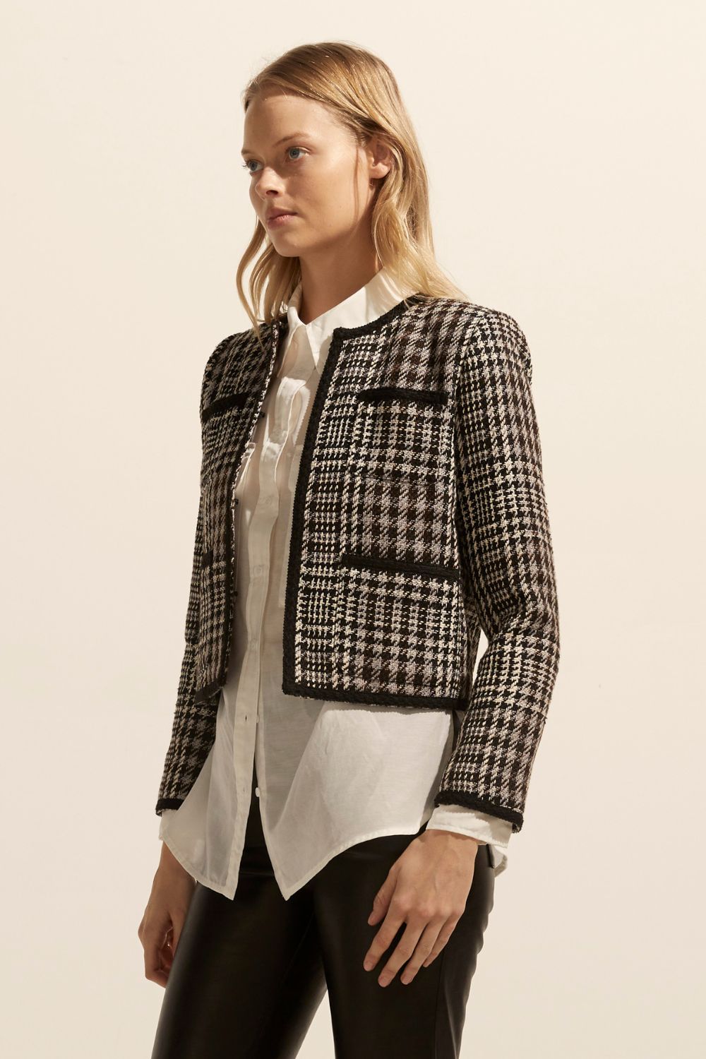 Indulge in effortless luxury with our Patron Jacket in Check Boucle. This tailored, cropped jacket boasts a fresh take on classic tweed, with four rounded pockets for a modern twist. The open front and round neckline exude timeless elegance. Elevate your everyday look with sophistication.