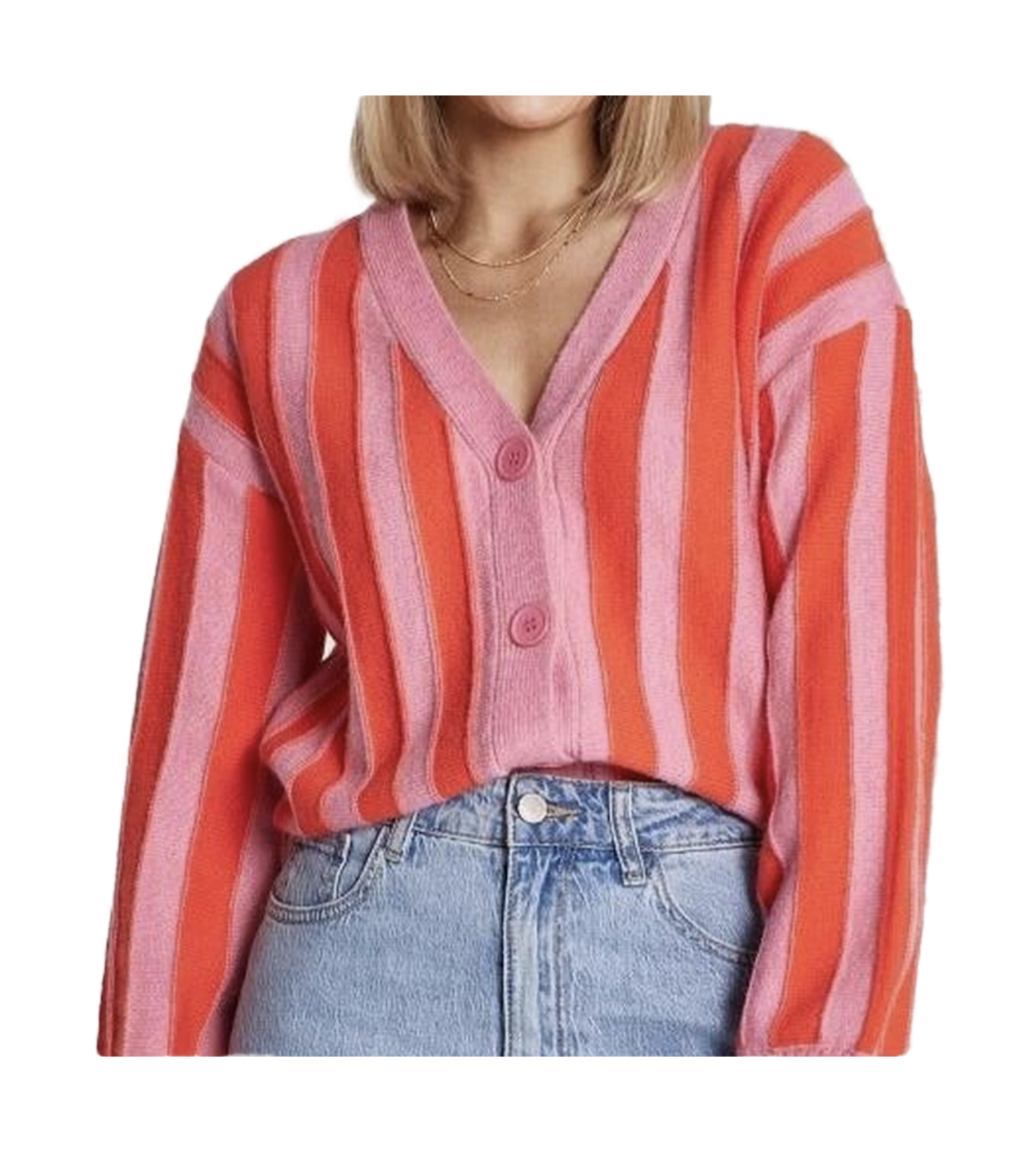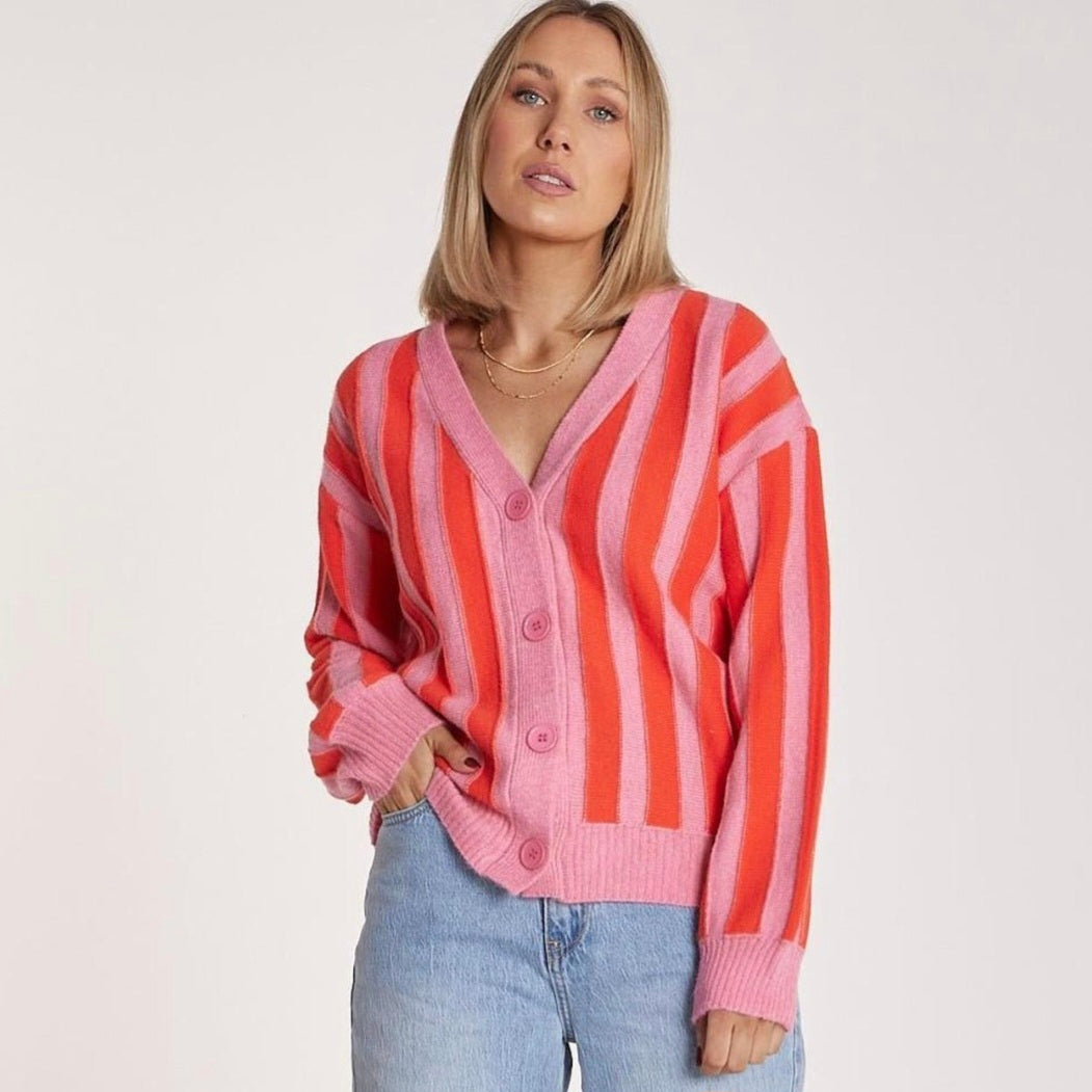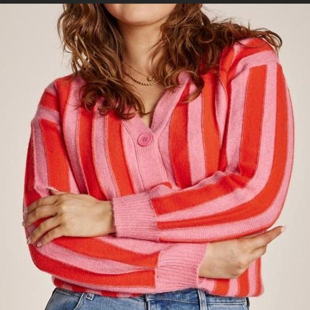 Brighten up your wardrobe with this striking striped knit cardigan from Feather & Noise. Featuring a vibrant pink and orange colourway, oversized buttons, and a flattering V-neckline, this cardigan is the perfect mix of playful and practical. Feather & Noise is renowned for creating effortlessly chic, high-quality pieces that fit seamlessly into everyday wardrobes. Layer it over your favorite denim or dresses for a cozy yet stylish look. This preloved piece offers exceptional value while maintaining the brand's signature modern aesthetic.