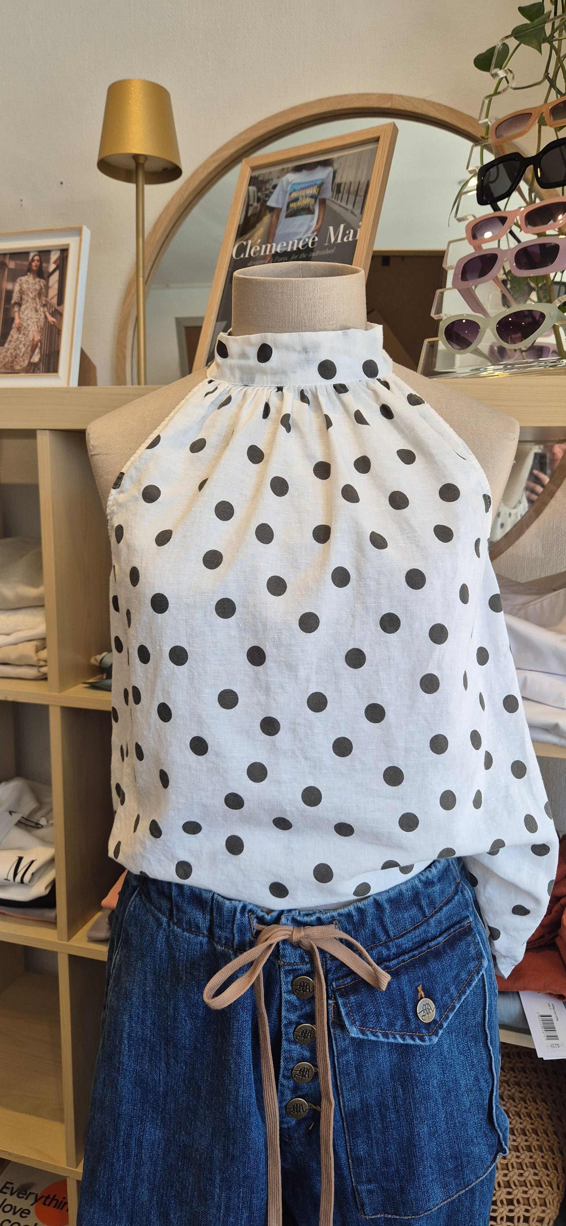Playful yet sophisticated, this Susan polka dot halter top is the perfect addition to your wardrobe. Crafted from 100% cotton, it features a flattering high neckline and an elegant tie-back design. The monochrome polka dot print adds timeless charm while keeping you on-trend as spots make a big comeback this season.