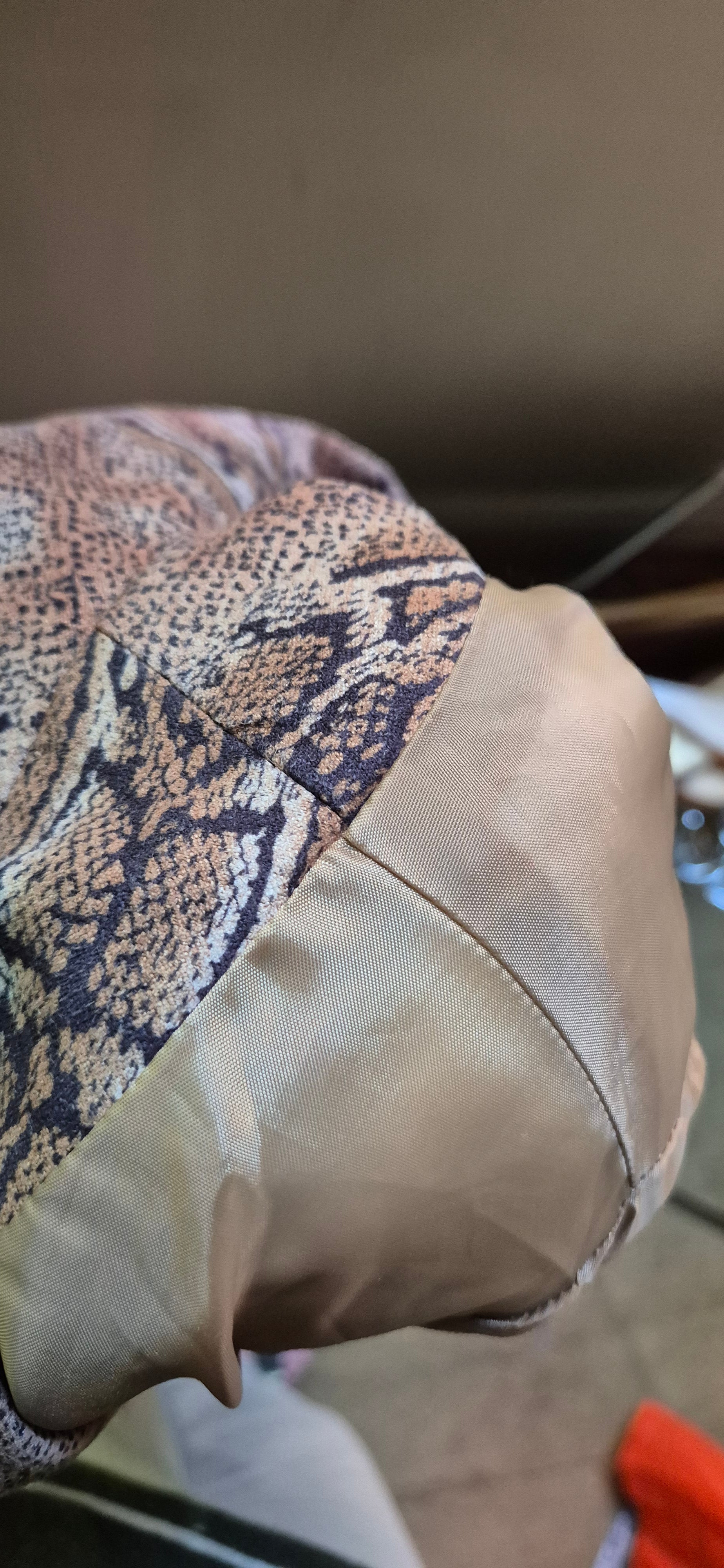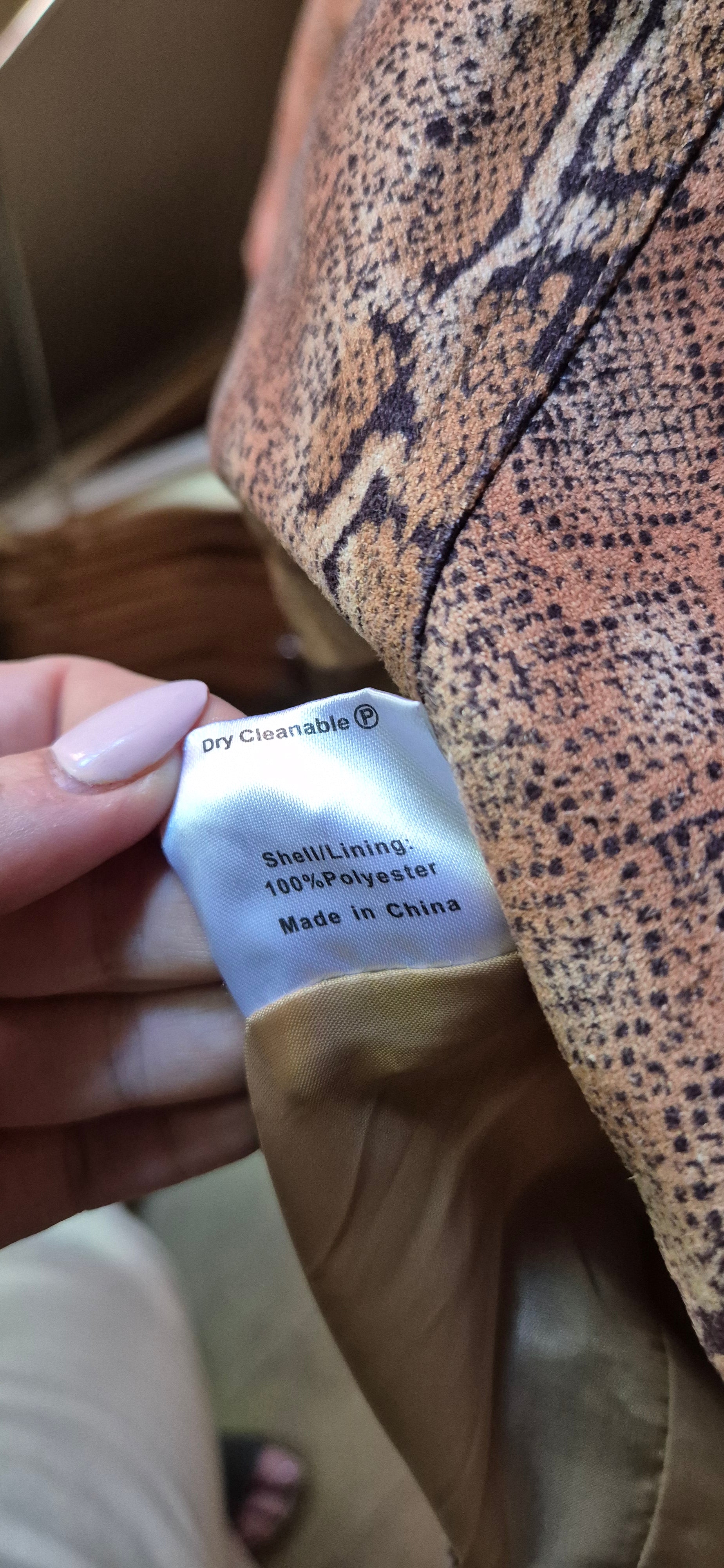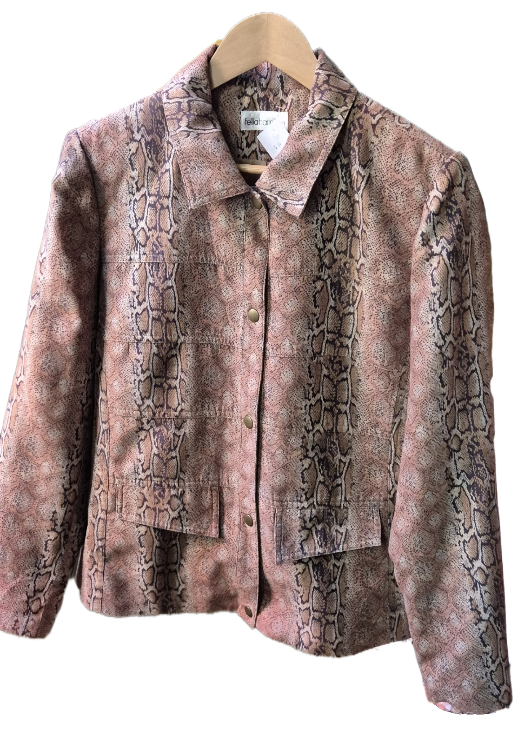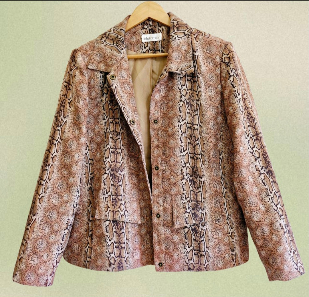 Featuring a soft, high-quality fabric with an all-over snakeskin-inspired pattern in earthy pink and beige tones, this jacket brings effortless flair to any outfit. With its structured silhouette, collared neckline, and snap-button front closure, it strikes the perfect balance between casual chic and bold elegance.