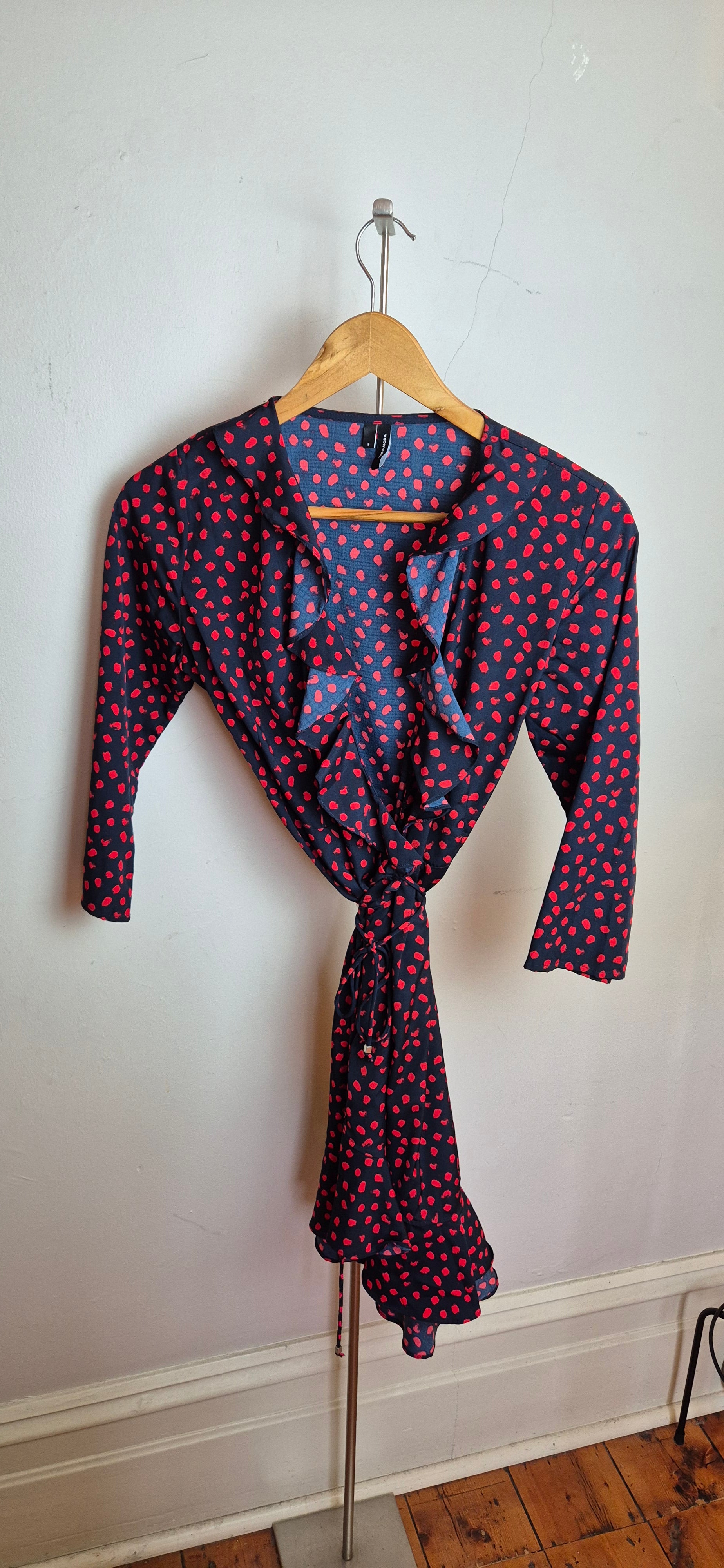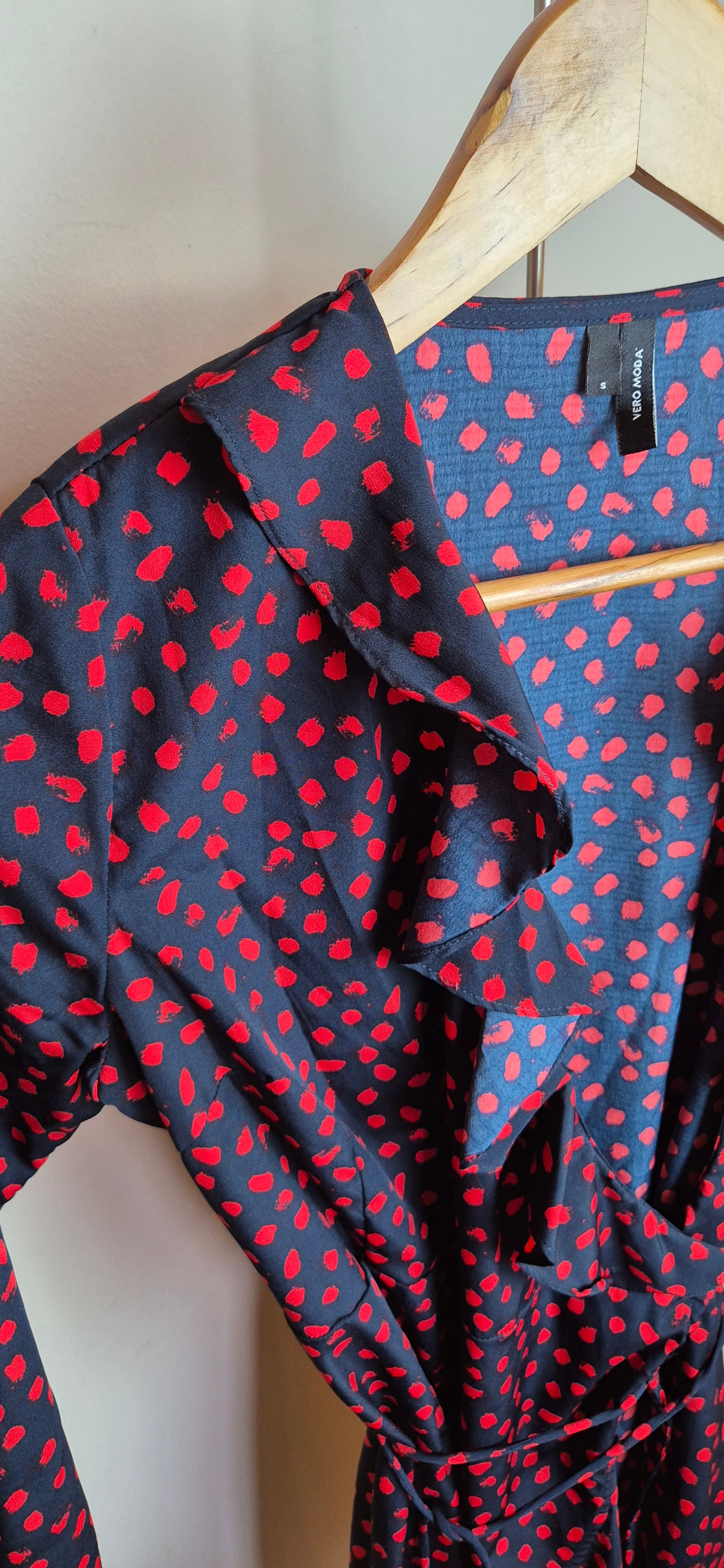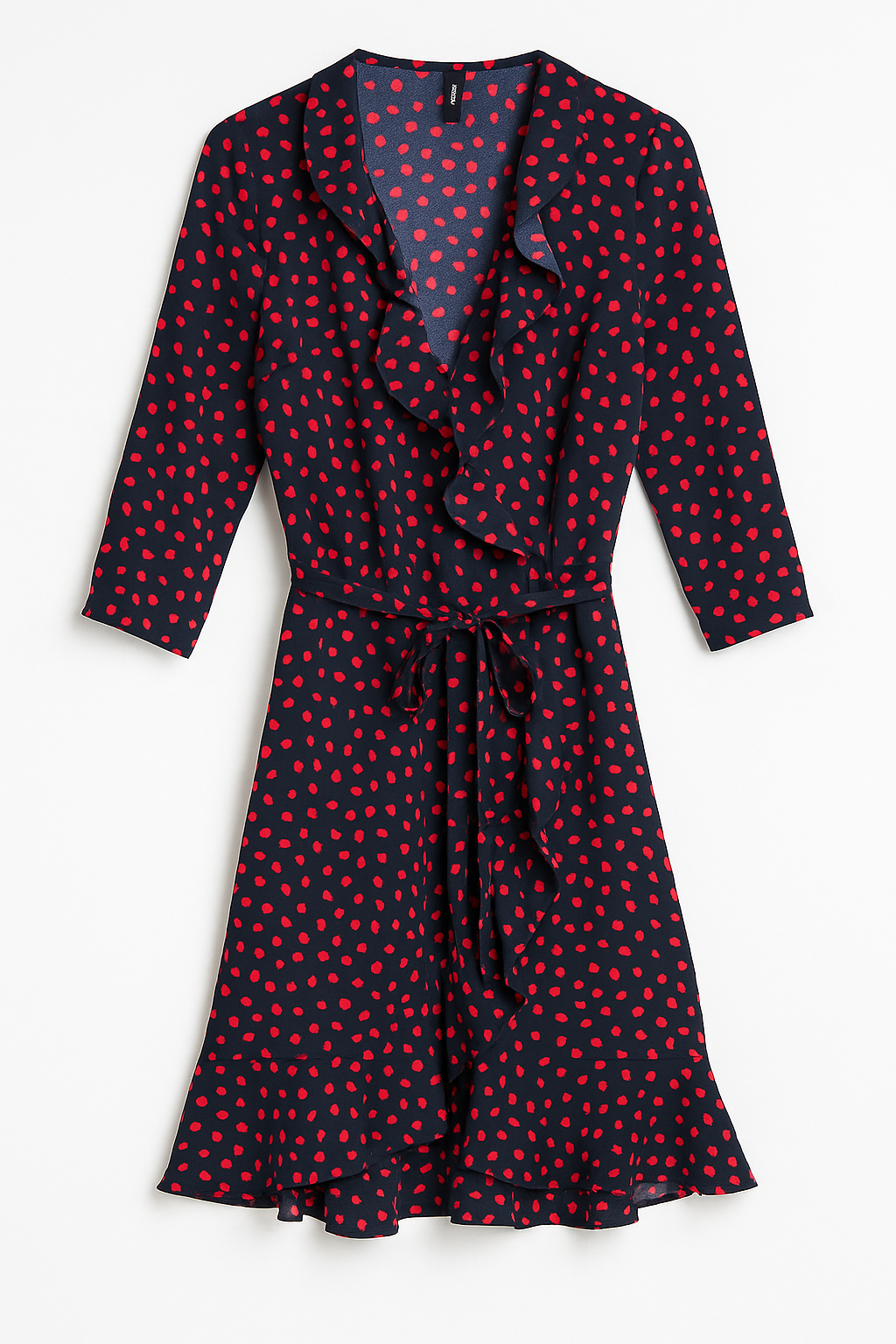 A playful take on the classic wrap silhouette, this Vero Moda dress features a navy base with vibrant red painterly dots scattered across the fabric. The flattering V-neckline is framed by soft ruffles, complemented by a tie waist and subtle frill hem. Cut just above the knee with ¾ sleeves, it’s the kind of easy, feel-good piece that transitions from daytime to dinner with a simple shoe swap.