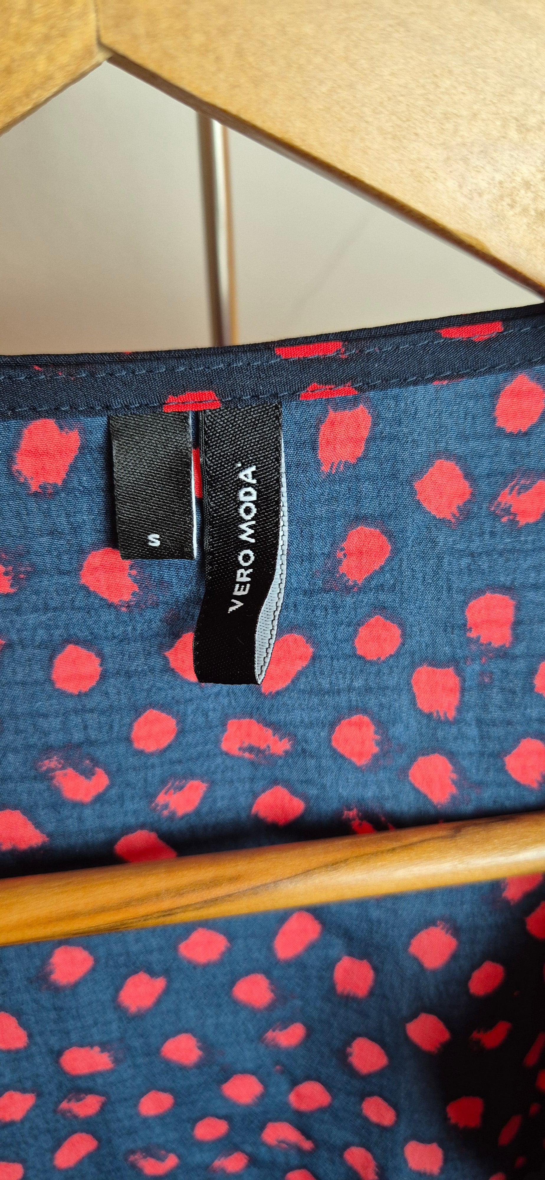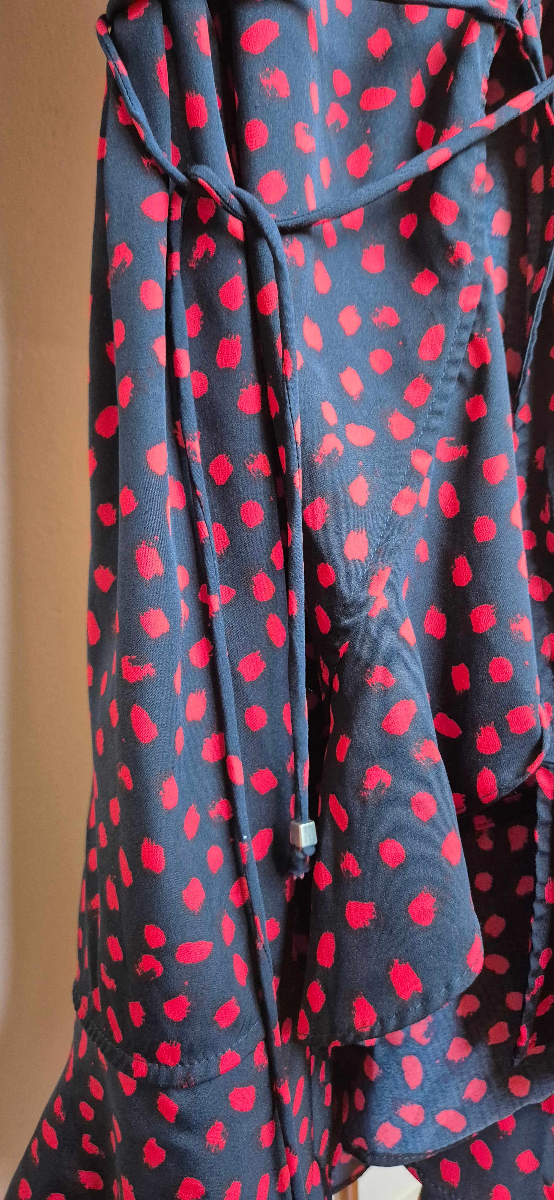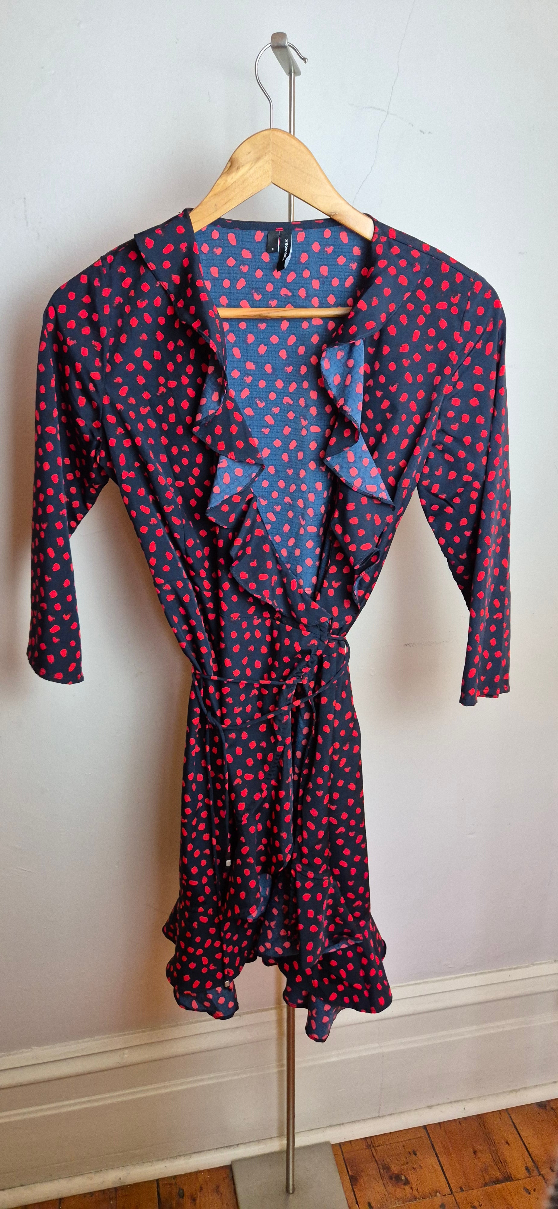 A playful take on the classic wrap silhouette, this Vero Moda dress features a navy base with vibrant red painterly dots scattered across the fabric. The flattering V-neckline is framed by soft ruffles, complemented by a tie waist and subtle frill hem. Cut just above the knee with ¾ sleeves, it’s the kind of easy, feel-good piece that transitions from daytime to dinner with a simple shoe swap.