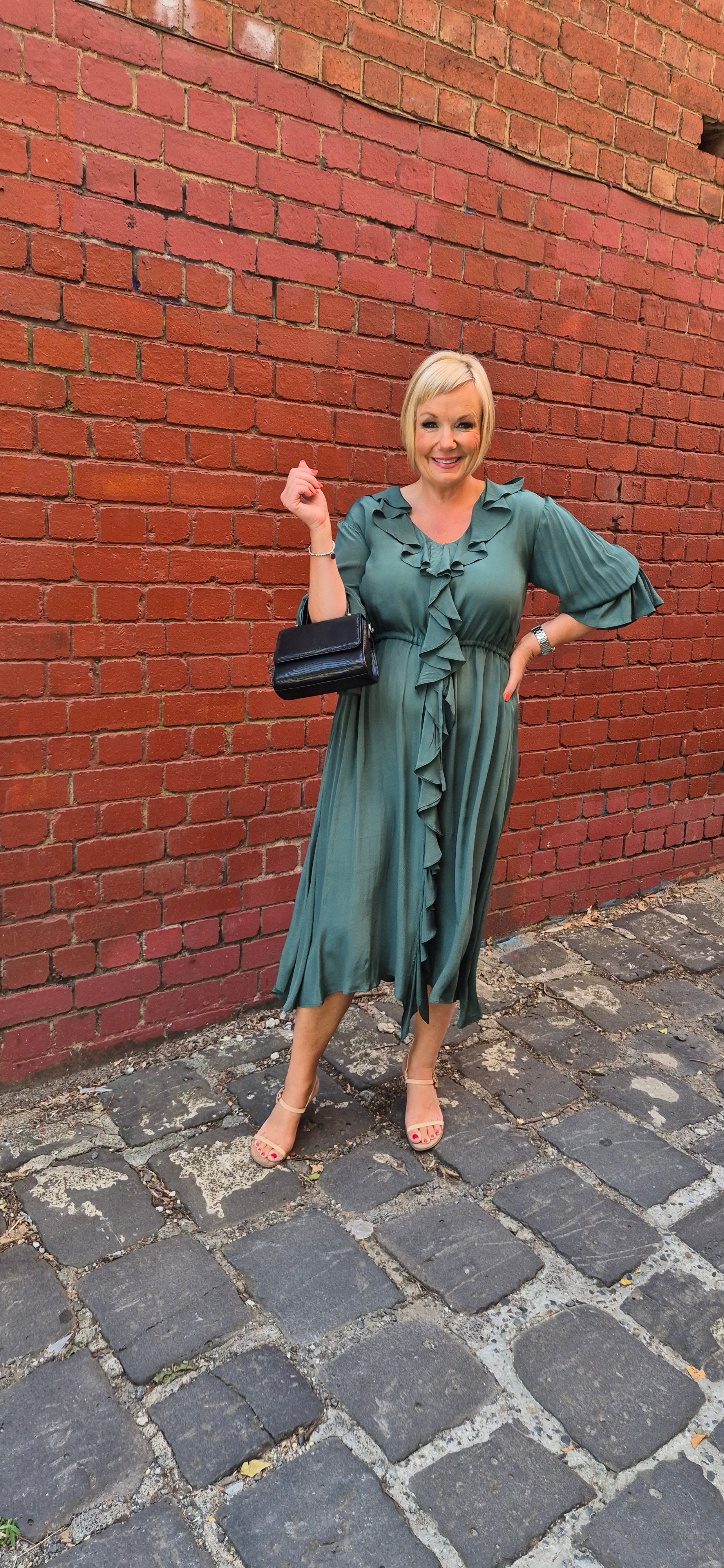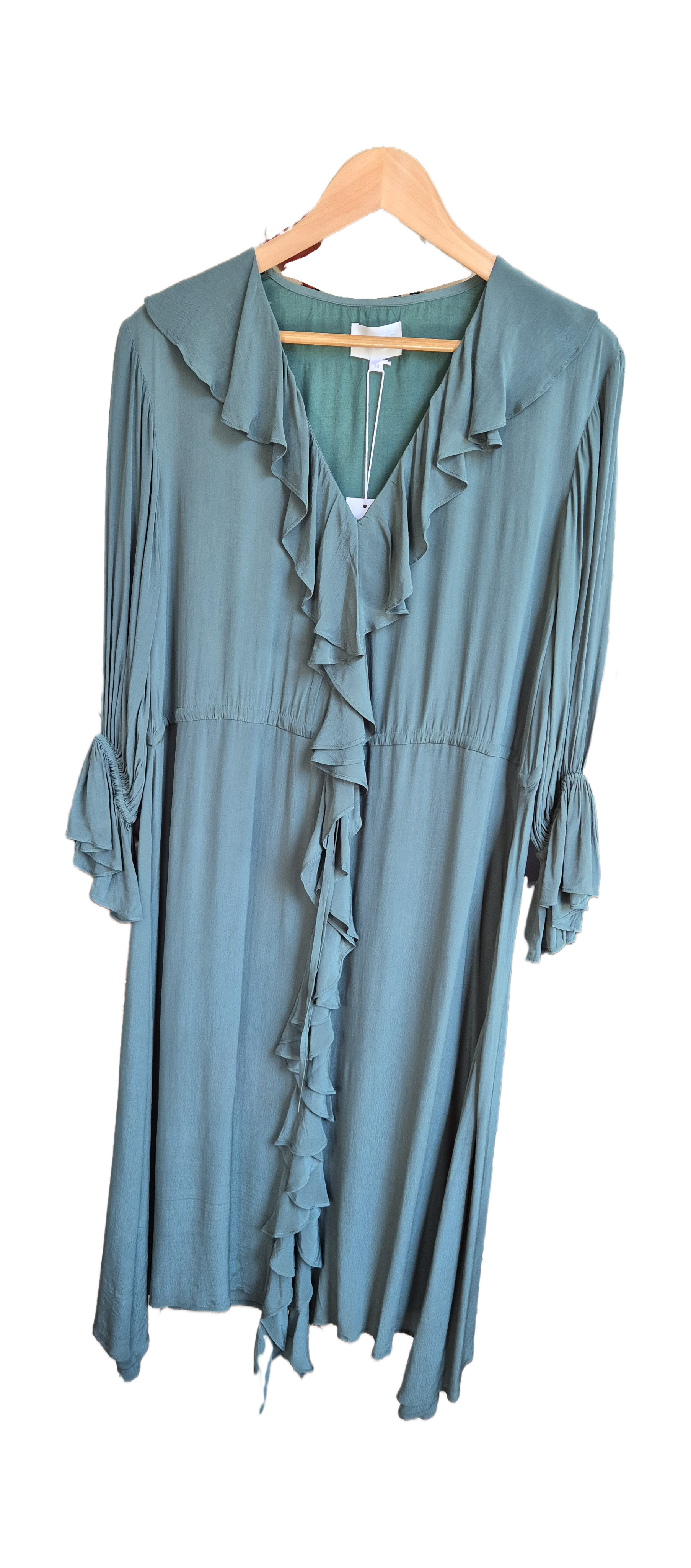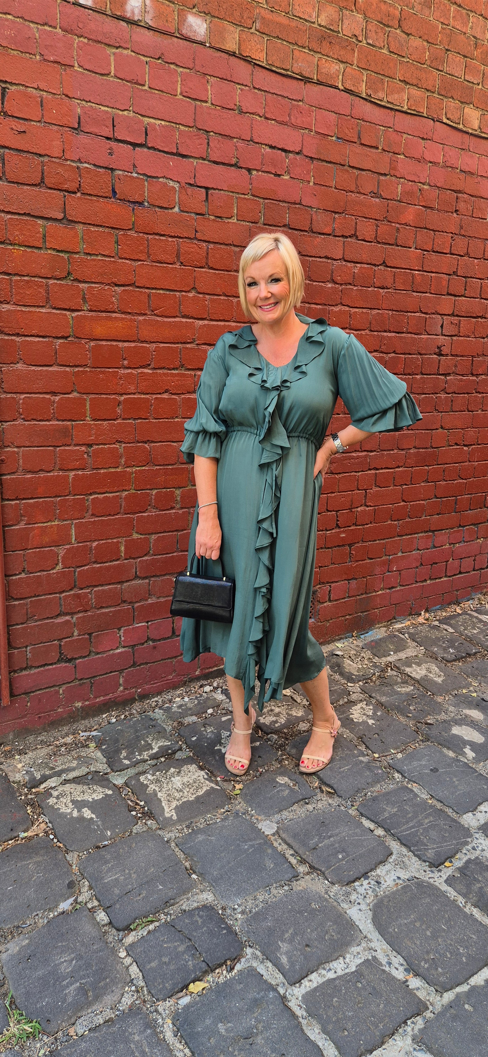 The Rose Dress by Australian label Kamare is the epitome of effortless elegance. Crafted from soft, fluid viscose, this dress features a flattering V-neckline adorned with cascading ruffles and a relaxed empire waist for gentle shaping. The flowing silhouette and delicate sleeve detail add a romantic touch, making it perfect for both daytime events and evening occasions.