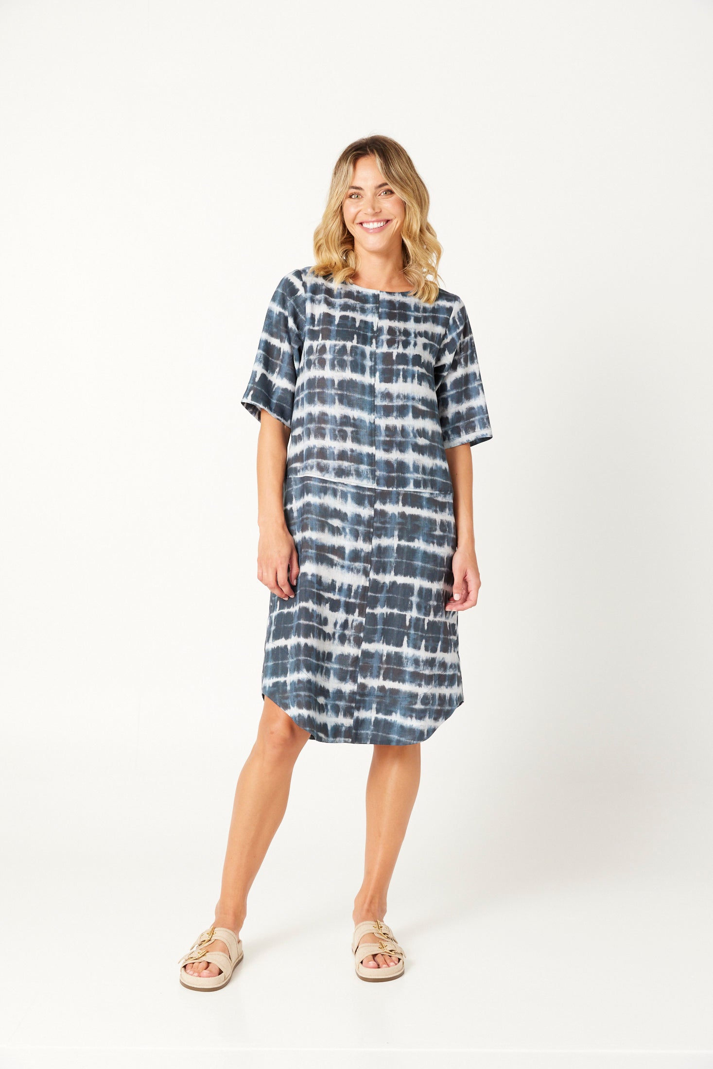 Effortlessly stylish and breathable, this Valia dress is crafted from 100% linen and proudly made in Melbourne. Featuring a relaxed silhouette, round neckline, short sleeves, and a gently curved hemline, it’s designed for ease and everyday wear. The blue tie-dye pattern adds a modern, artistic edge to this timeless staple — perfect with slides for casual days or dressed up with statement accessories.