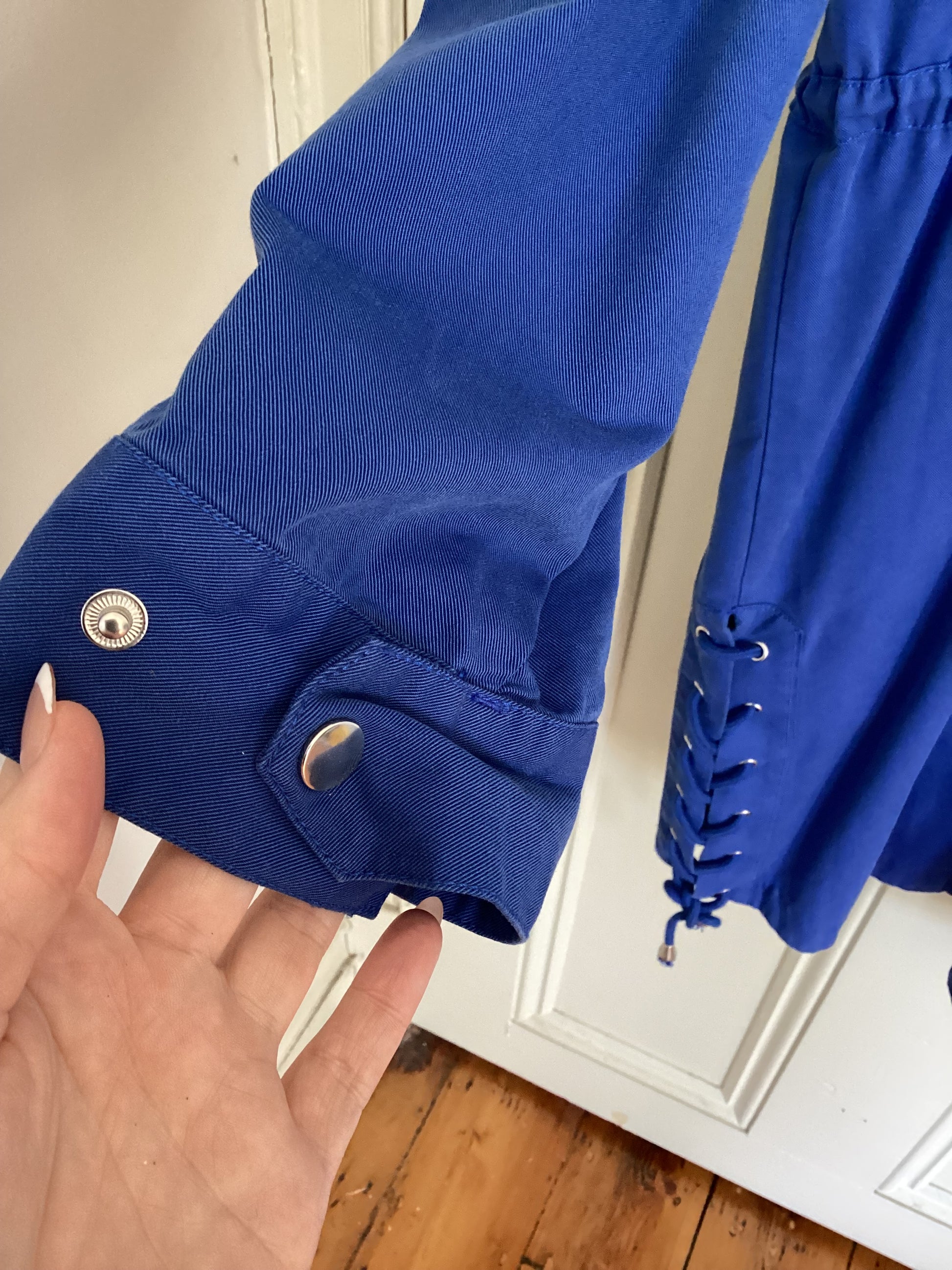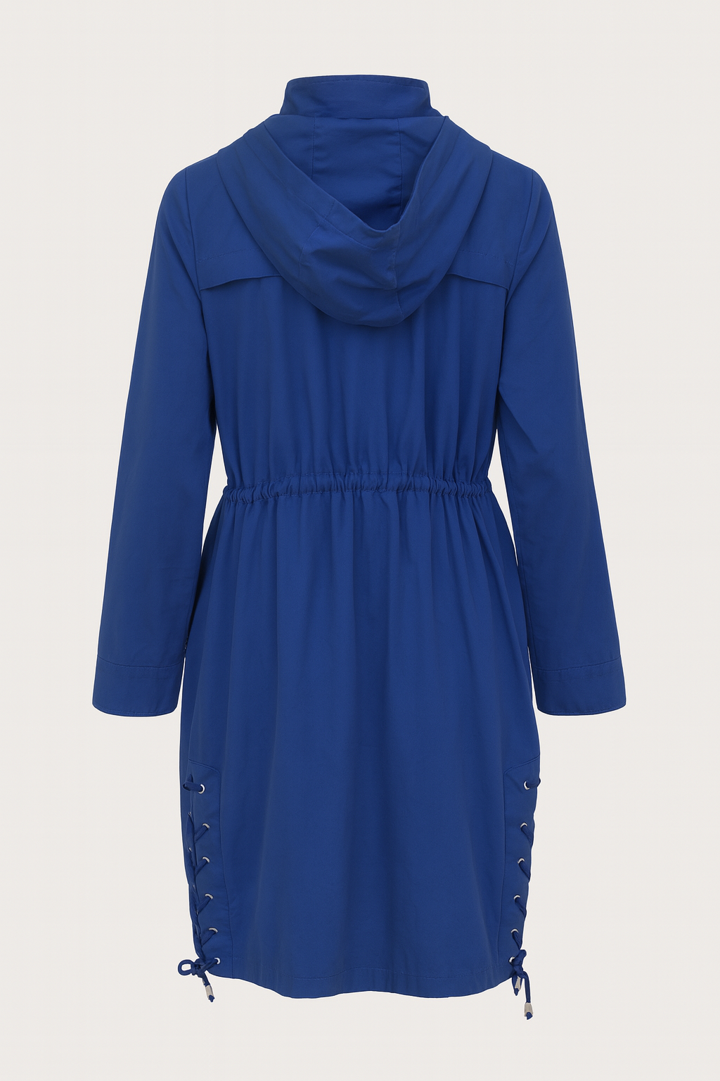 A striking yet practical transeasonal piece, this cobalt blue jacket by POL blends modern utility with effortless style. Designed with a button-down front and adjustable drawstring waist, it offers a flattering shape while remaining easy to wear. Functional details include a hood for extra coverage, generous hip and breast pockets, and unique lace-up side ties that add an elevated finish.