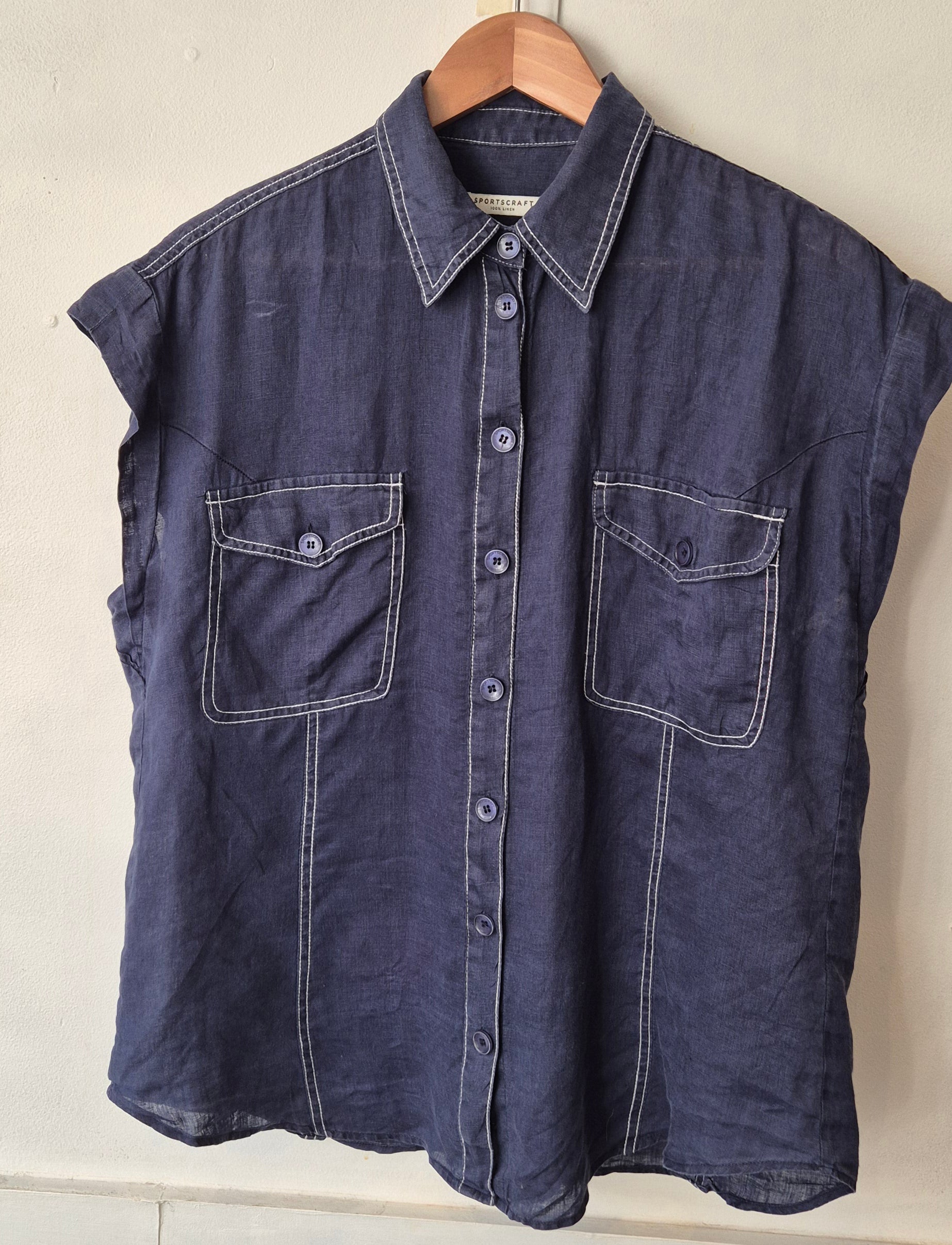 Effortlessly chic and breathable, this Sportscraft sleeveless shirt is crafted from 100% linen, making it the perfect summer staple. The deep navy colourway is enhanced with contrast white stitching and matching buttons for a casual, utility-inspired feel. Featuring a collared neckline, front button closure, two flap chest pockets, and a relaxed fit, this shirt is ideal for layering over tanks or wearing on its own.