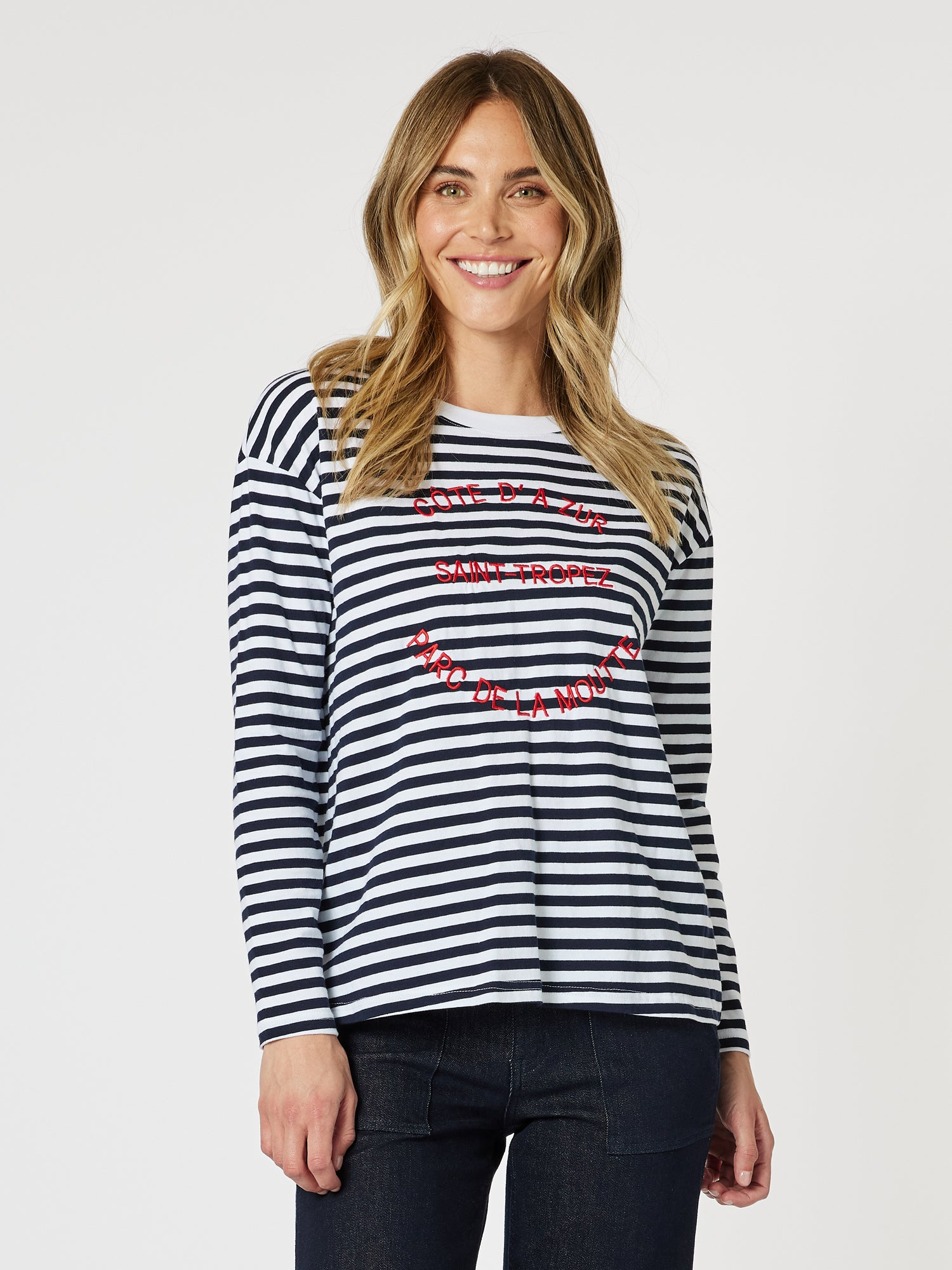 Made with soft and comfortable material, the Saint Tropez Embroidered Long Sleeve Tee features a classic stripe print that never goes out of style.
