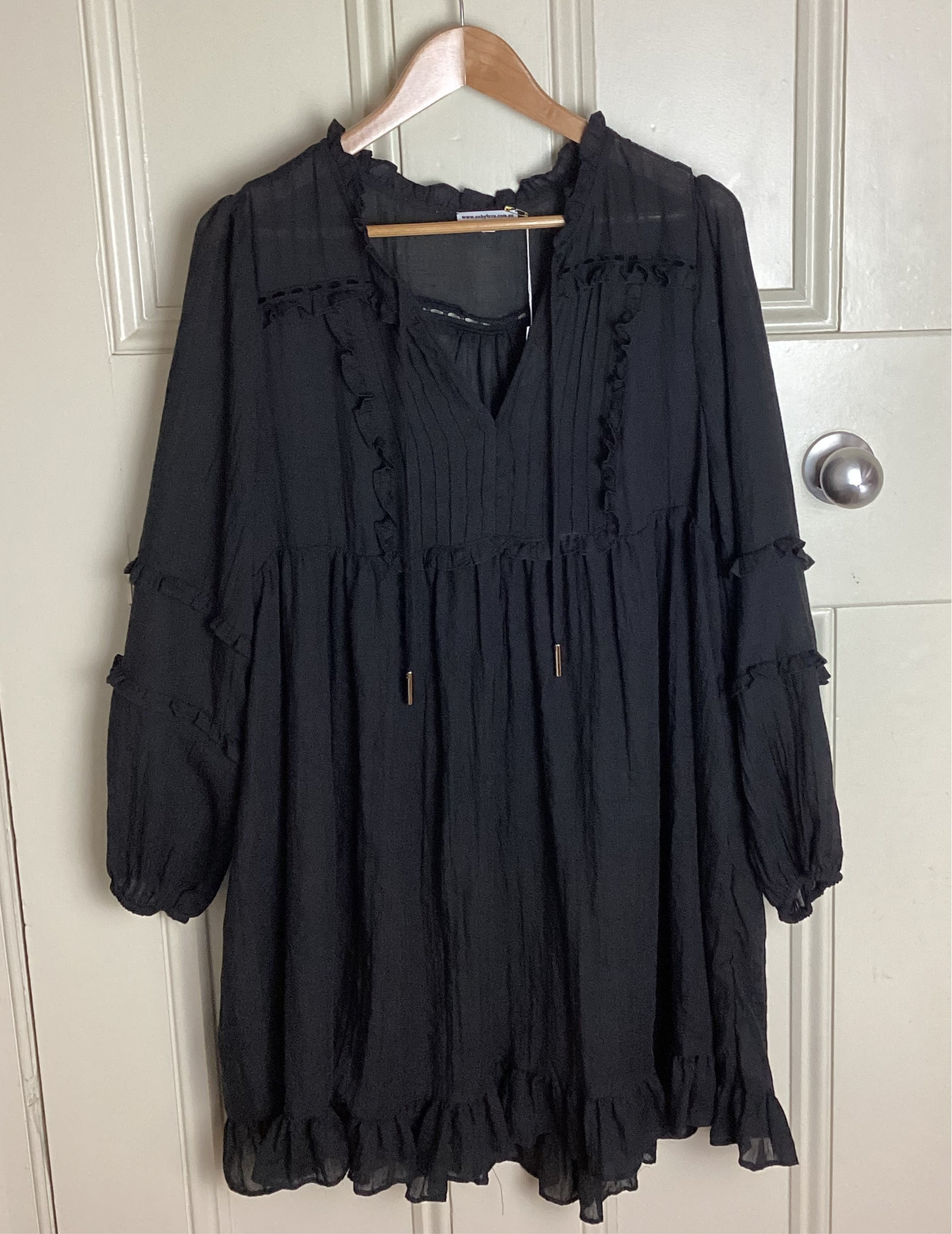 This black cotton dress offers an effortless balance of ease and detail, designed with a relaxed silhouette and soft bohemian influences. The long sleeves are gathered at the cuffs for shape, while delicate ruffle trims and vertical pleat accents add subtle texture. The V-neckline features two slim cord ties that can be styled open for a casual look or tied in a bow for extra polish. Finished with a tiered hemline that falls with a natural drape, this piece is versatile enough for everyday wear or dressed-up occasions.