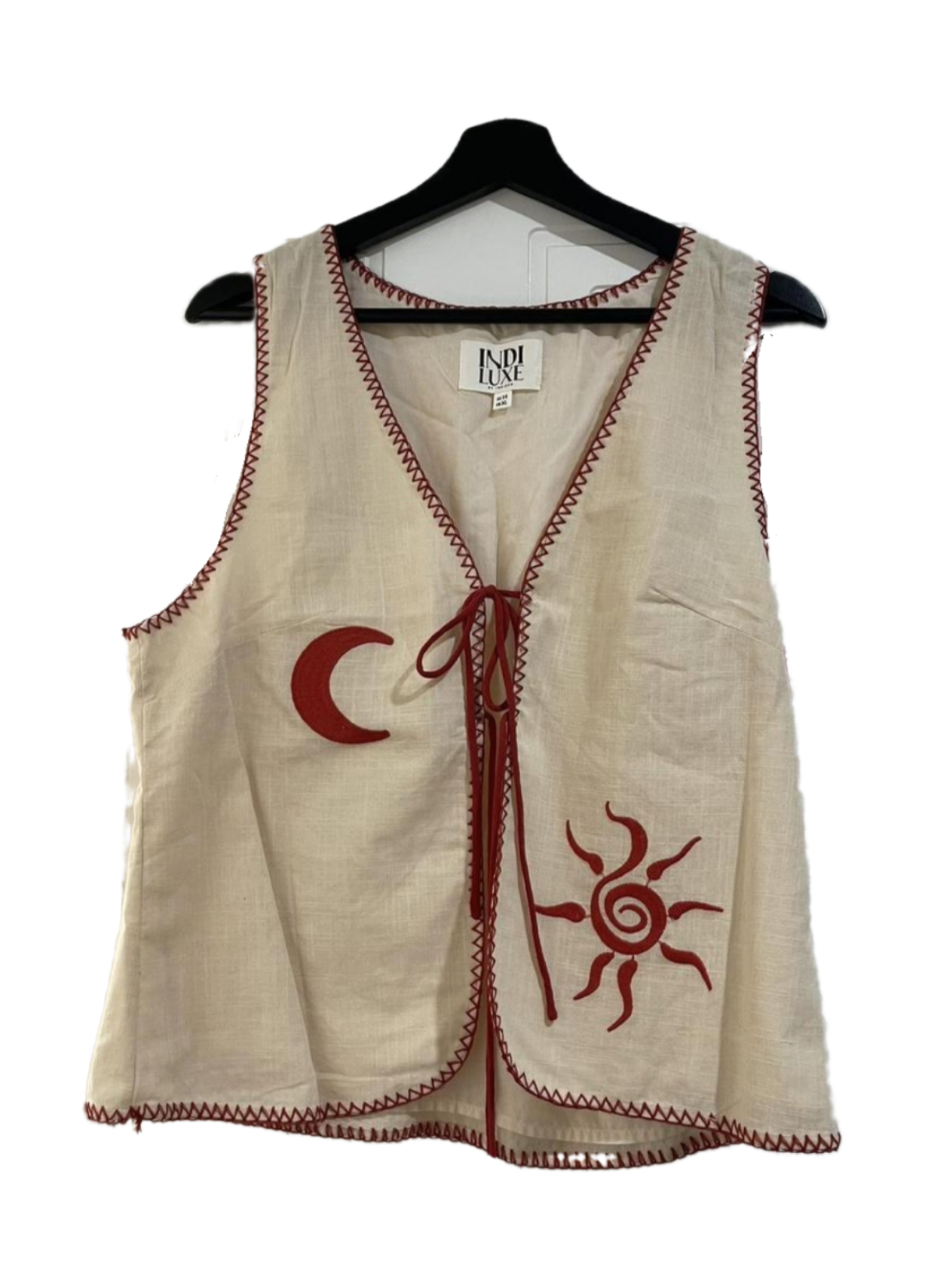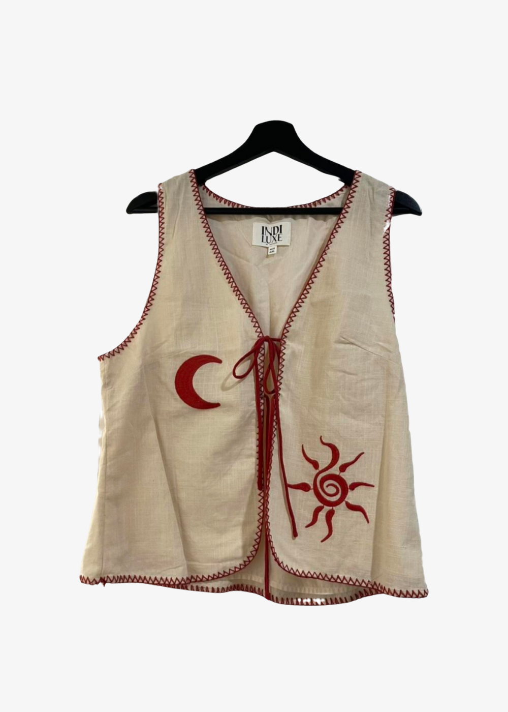 Channel your bohemian spirit with this charming embroidered vest from Indi Luxe. Crafted from lightweight, natural-toned fabric, this vest features intricate red embroidery with a striking sun and moon motif and contrasting whipstitch edging. The open-front design ties at the waist for an adjustable fit, making it perfect for layering over dresses, tops, or even swimwear. A truly unique piece to add a touch of whimsy and individuality to your wardrobe.