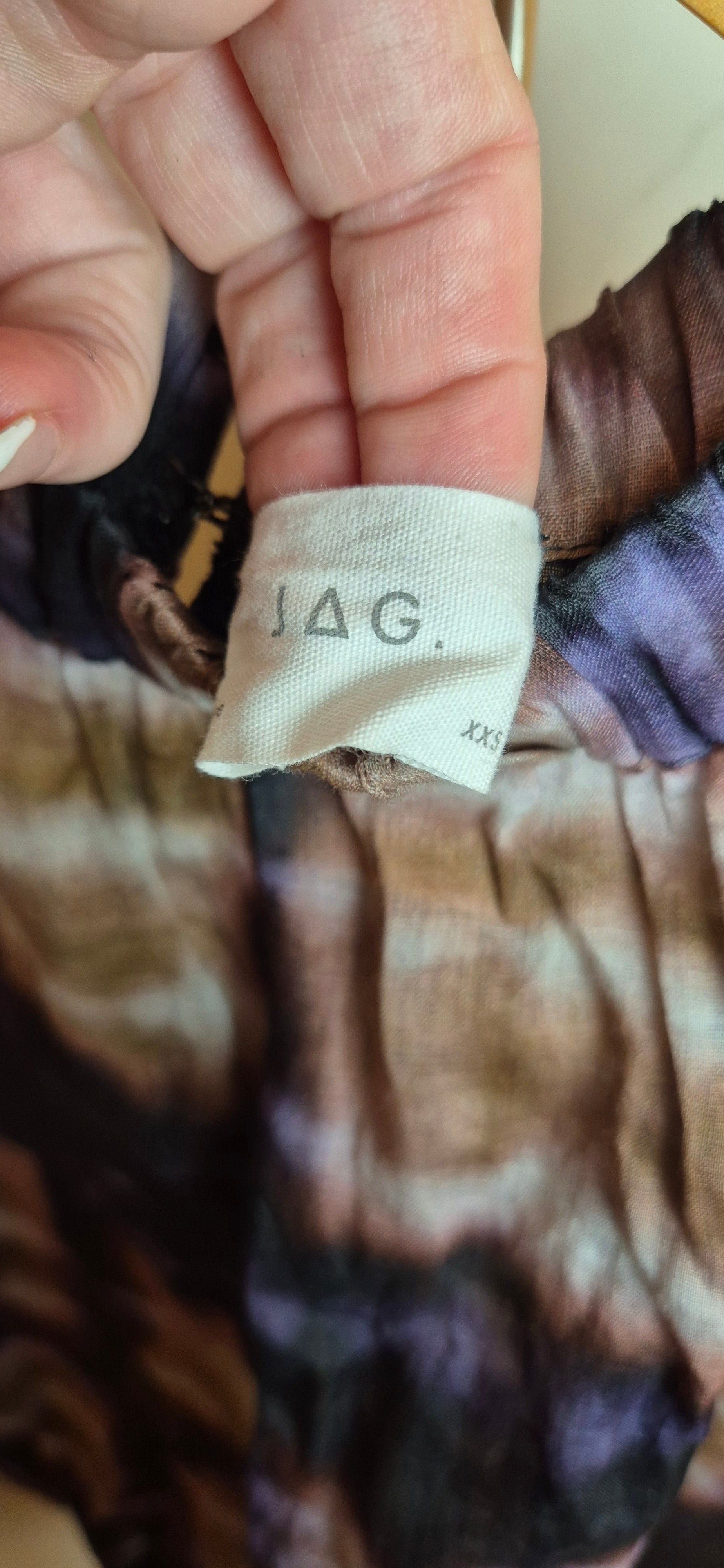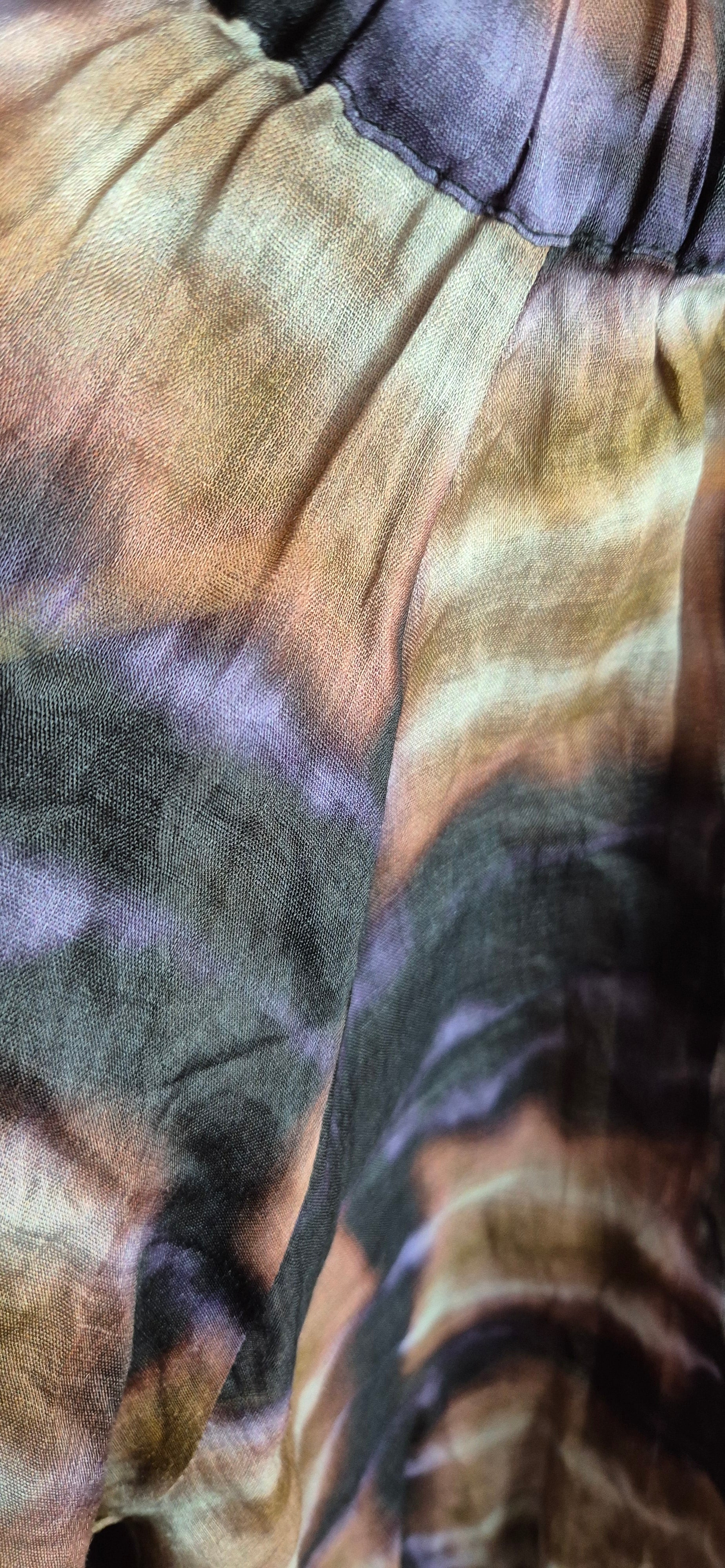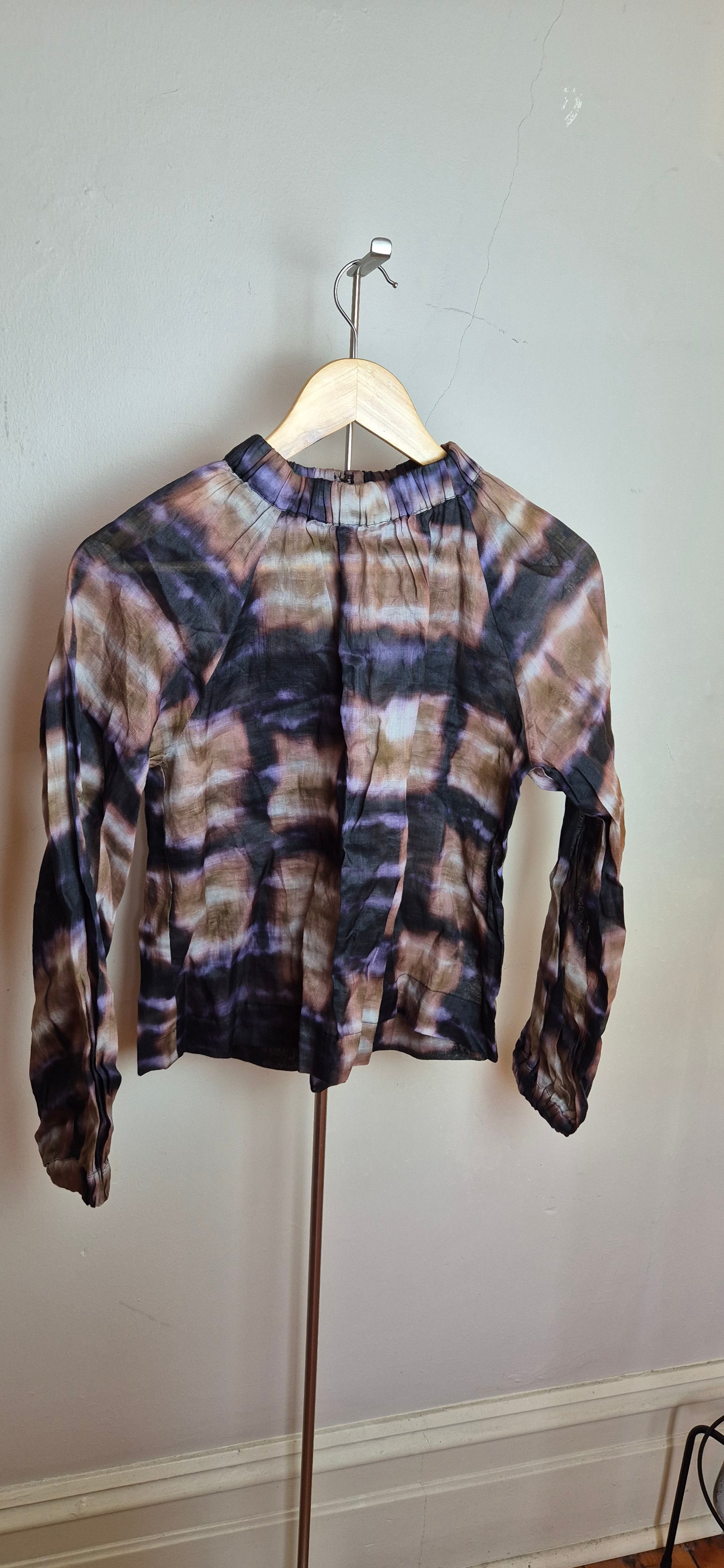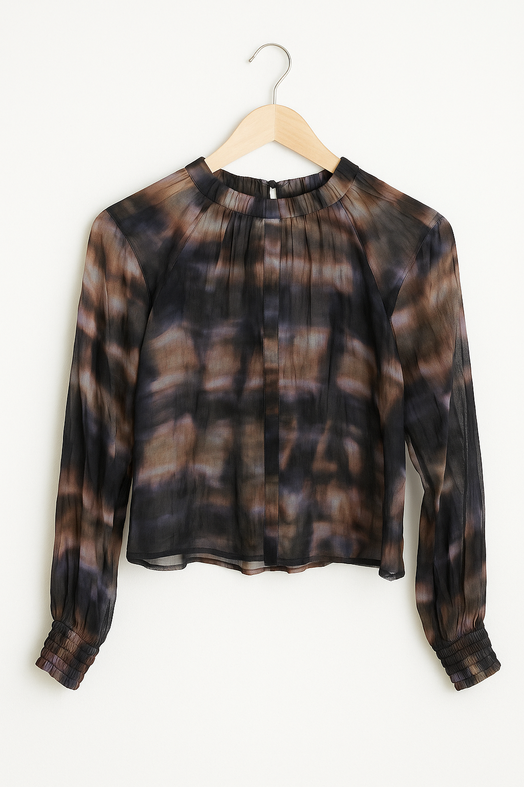 This airy long-sleeved blouse from Australian label Jag features a painterly tie-dye print in rich shades of chocolate, ink, and soft violet. Crafted from a lightweight semi-sheer fabric, it’s designed with a soft gathered neckline, raglan sleeves, and lightly elasticised cuffs for a gentle drape and floaty silhouette. Style it tucked into denim or layered under knits for a tonal, textural look that works year-round.