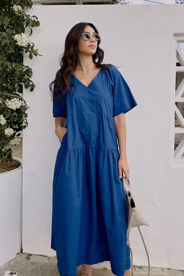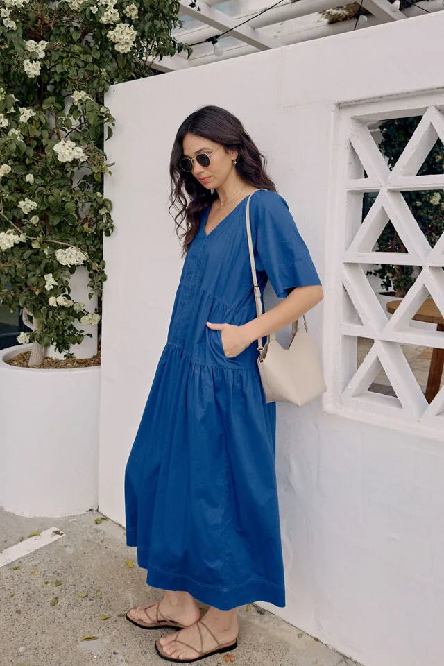 Easy, breezy, and effortlessly chic. This tiered poplin dress in a vibrant cobalt blue is your go-to for sunny days. Made from crisp, lightweight cotton, it features a flattering V-neckline, short sleeves, and a relaxed tiered silhouette with pockets for everyday ease.