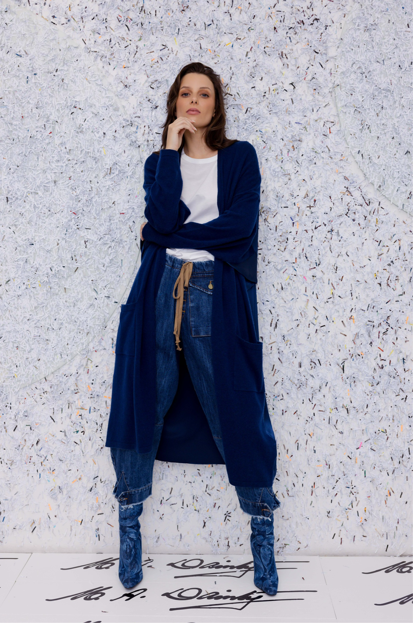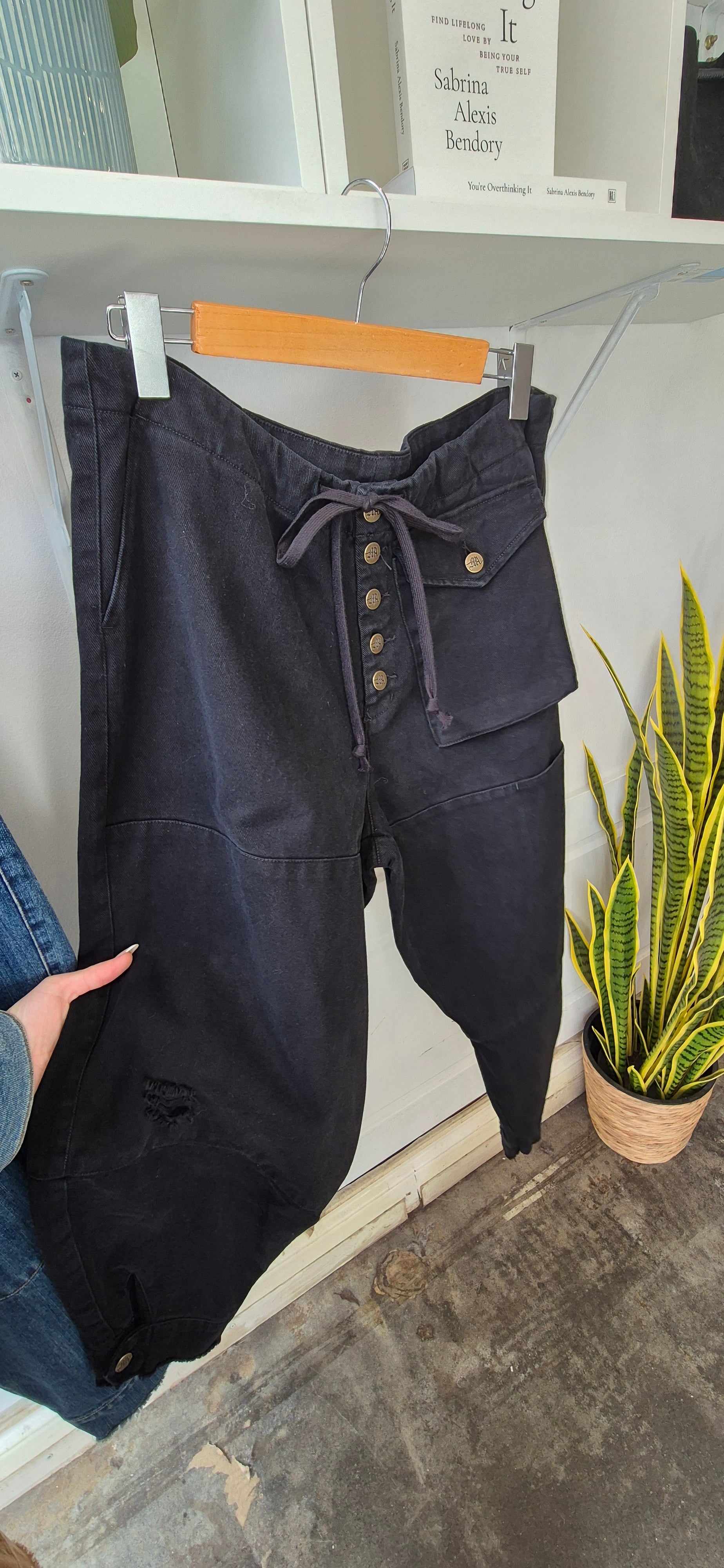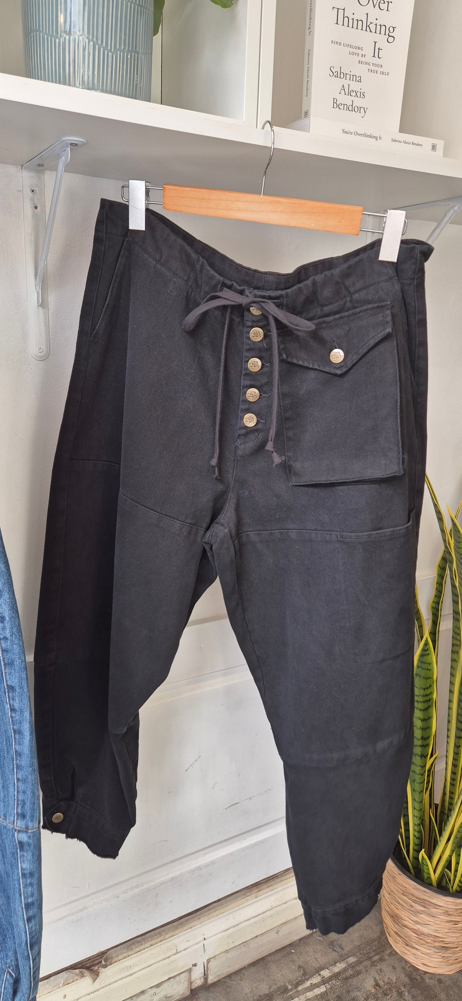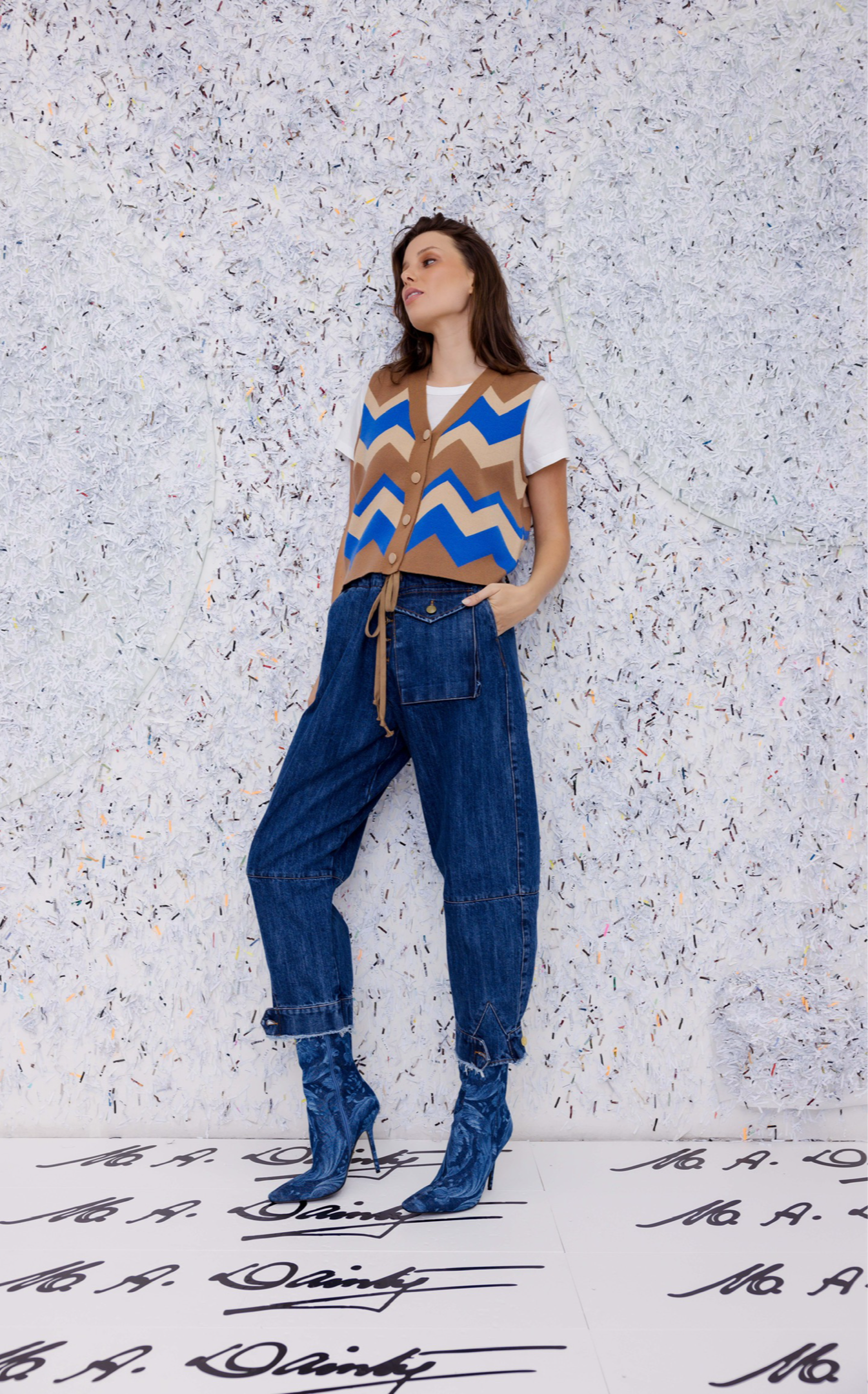 These high-waisted utility-style jeans bring a modern twist to classic denim. Featuring a relaxed, slightly oversized fit with a cinch-tie waist detail, they offer both comfort and effortless style. The deep indigo wash and oversized patch pocket add a utilitarian edge, making them a versatile staple for any wardrobe.