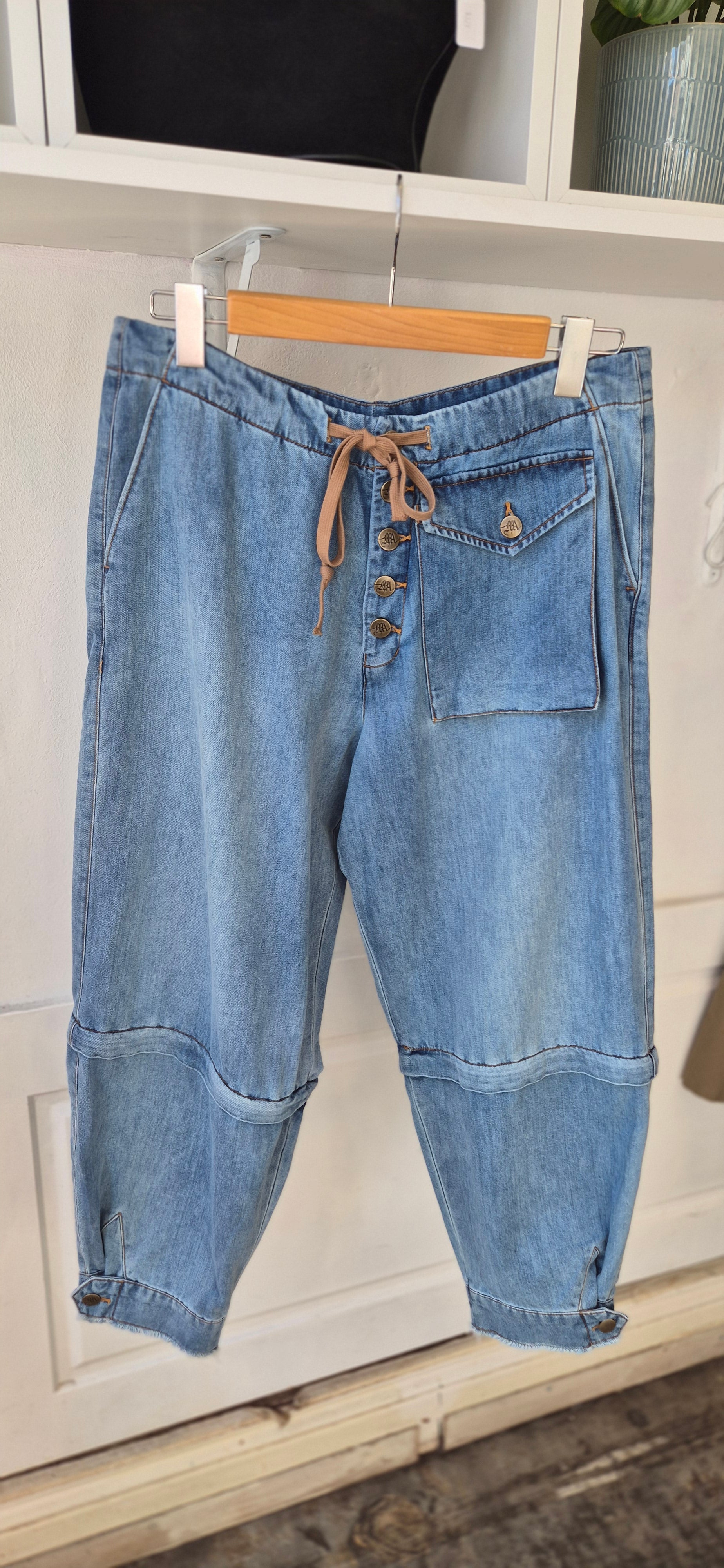 These high-waisted utility-style jeans bring a modern twist to classic denim. Featuring a relaxed, slightly oversized fit with a cinch-tie waist detail, they offer both comfort and effortless style. The deep indigo wash and oversized patch pocket add a utilitarian edge, making them a versatile staple for any wardrobe.