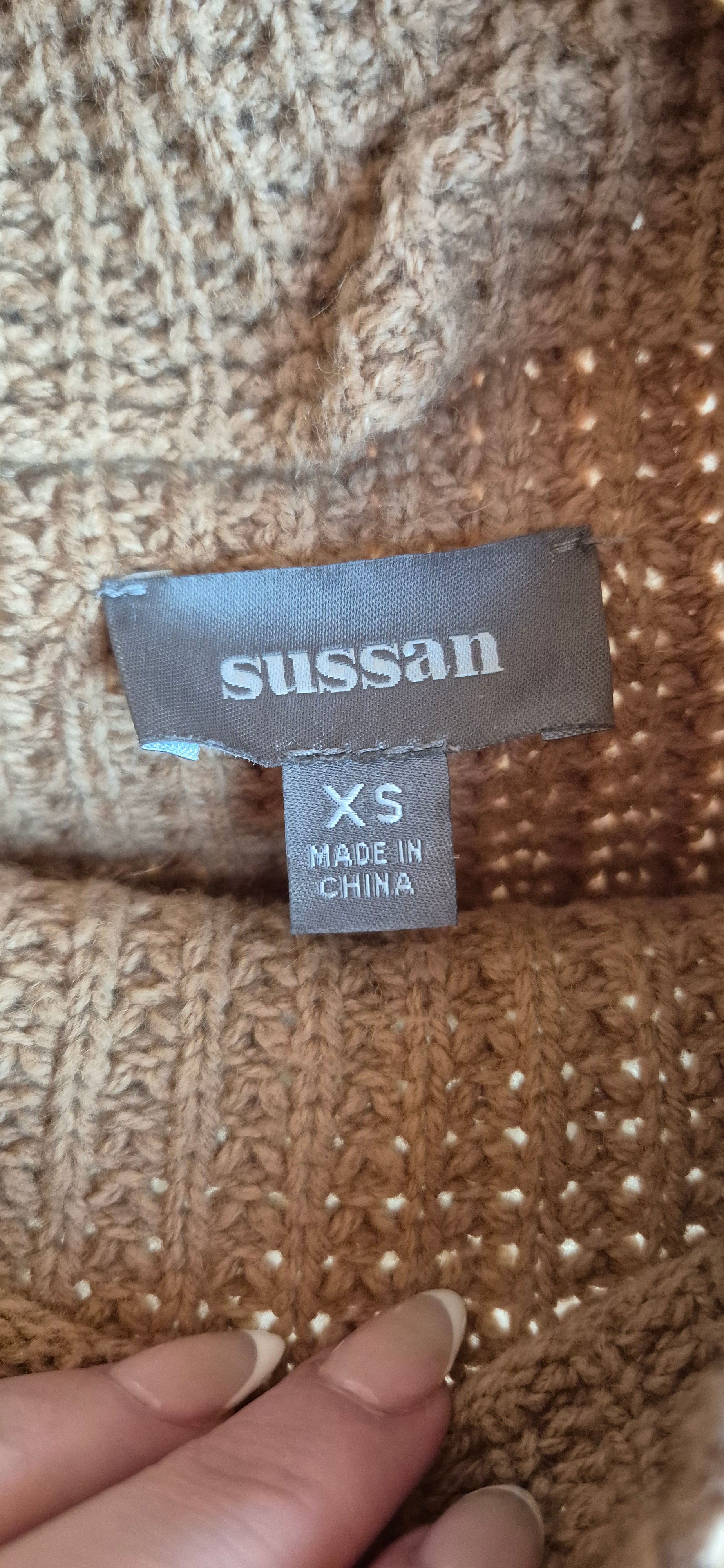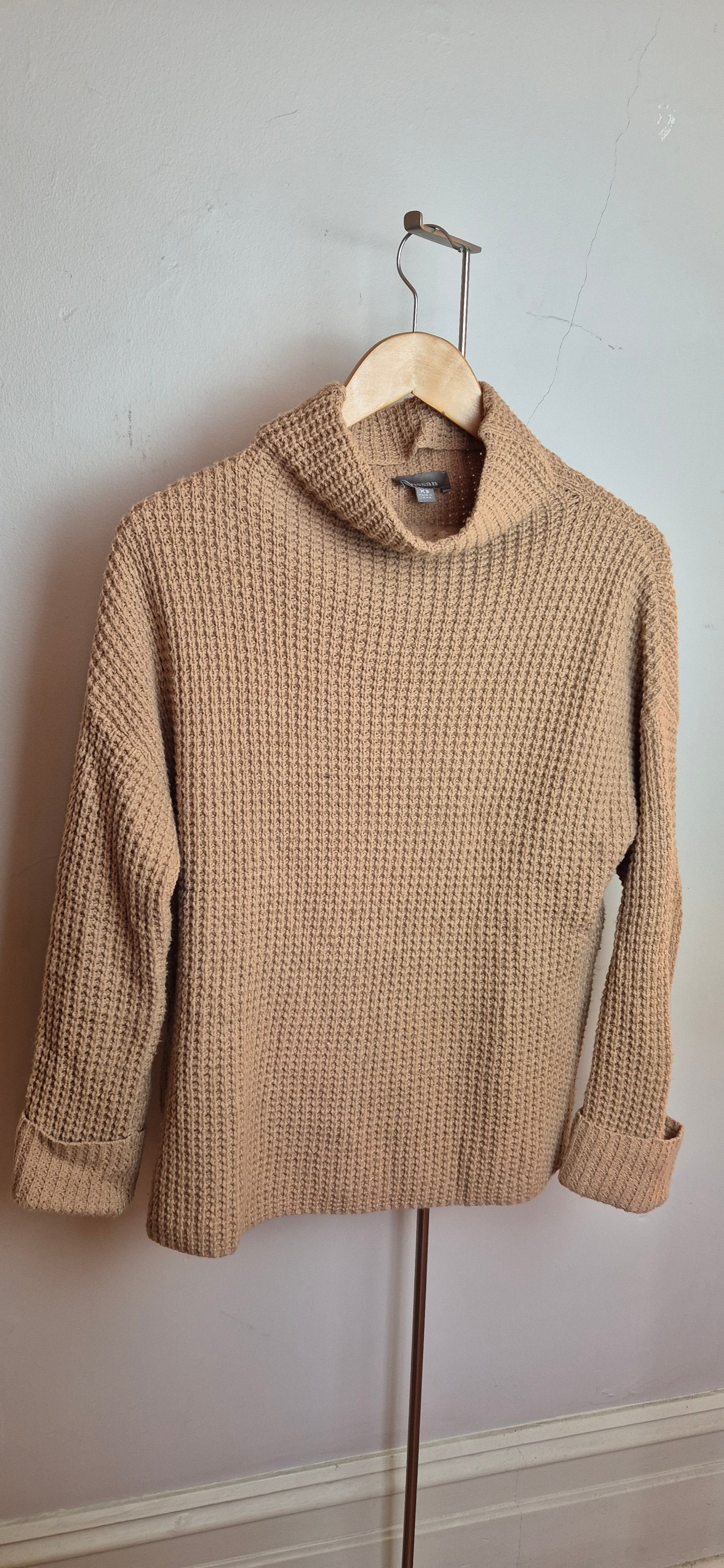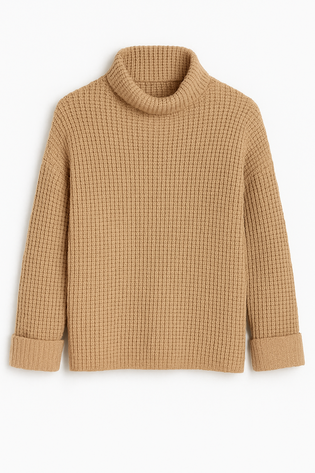 A cosy essential with timeless texture, this camel-toned waffle knit jumper features a softly structured roll neck, relaxed fit through the body, and subtle cuffed sleeves. The chunky waffle weave adds warmth and dimension while keeping the silhouette easy to layer. Perfect for styling with denim, wool trousers, or over dresses for laid-back layering through winter.