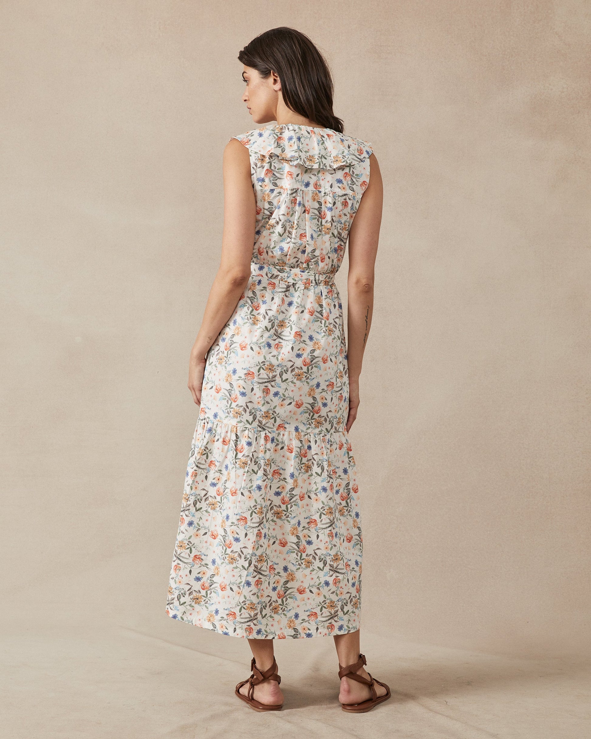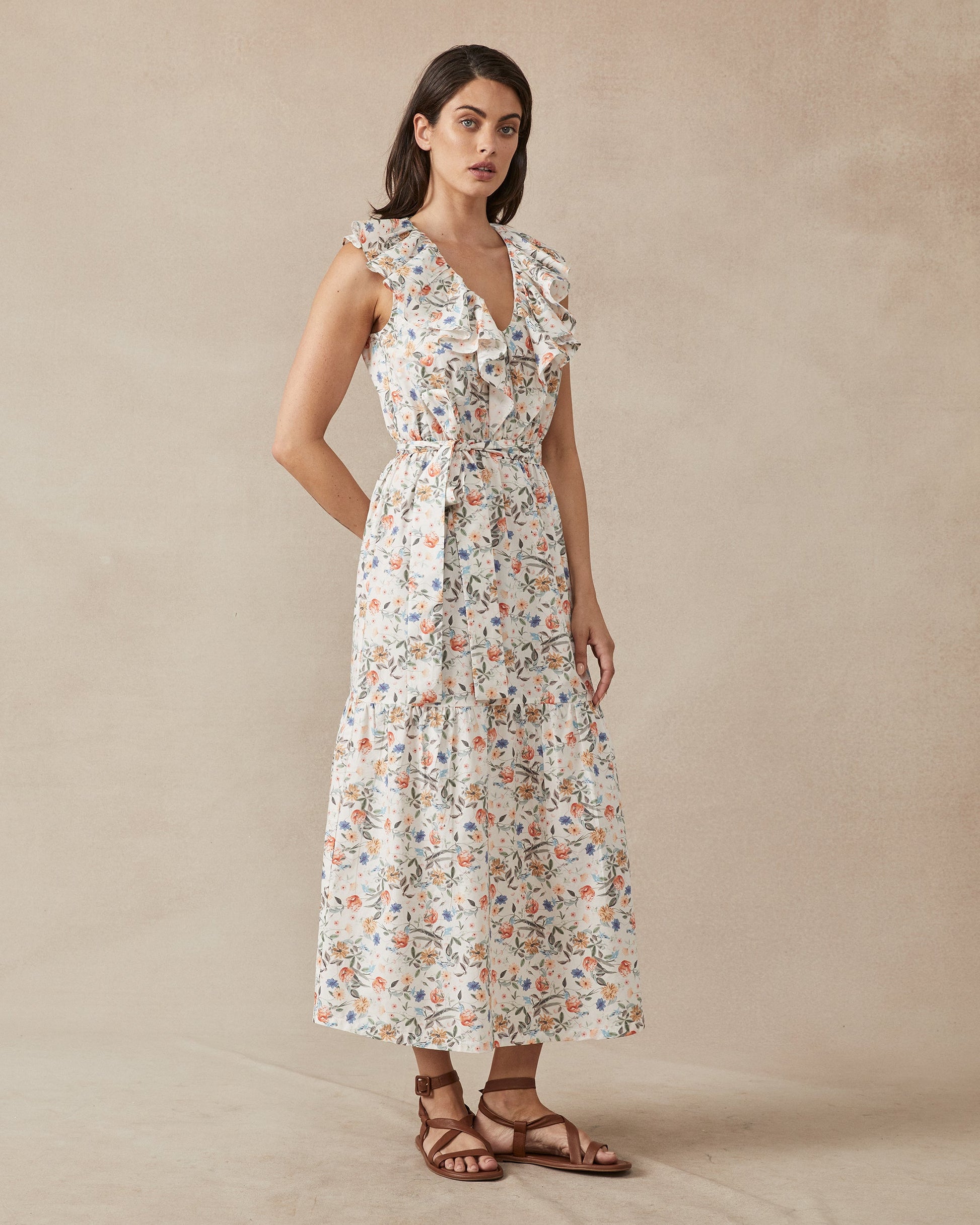Introducing the Patty Dress, a signature midi piece by Maggie the Label. This sleeveless dress boasts a flattering, ruffle deep V neckline and elastic waist, with a detachable belt for a fitted look. Made and designed in Australia, this dress offers both style and comfort.