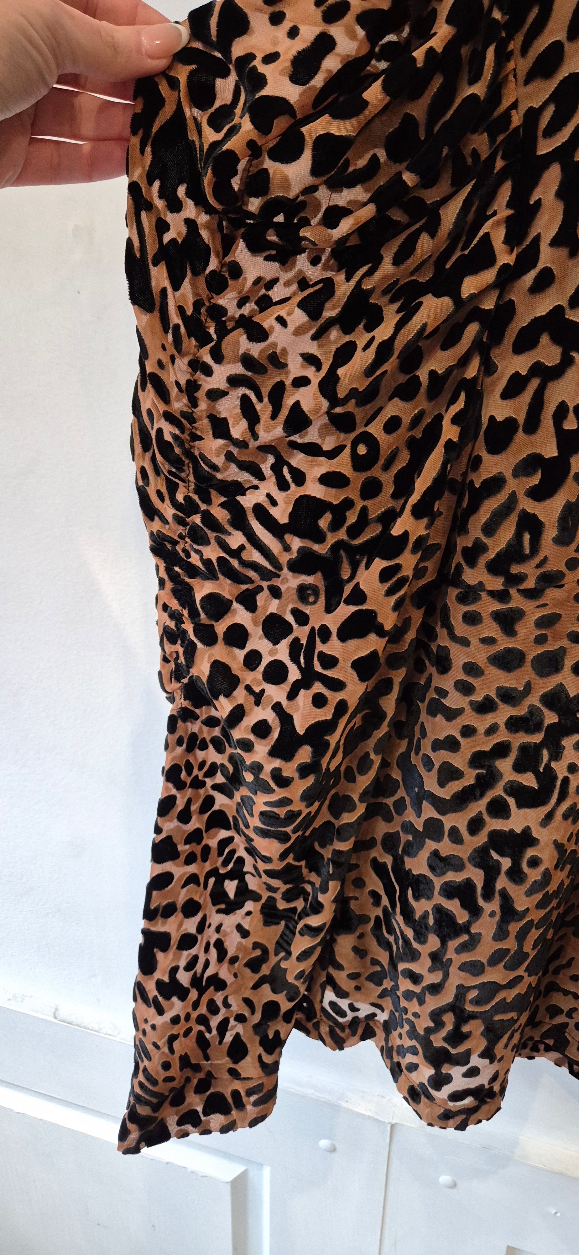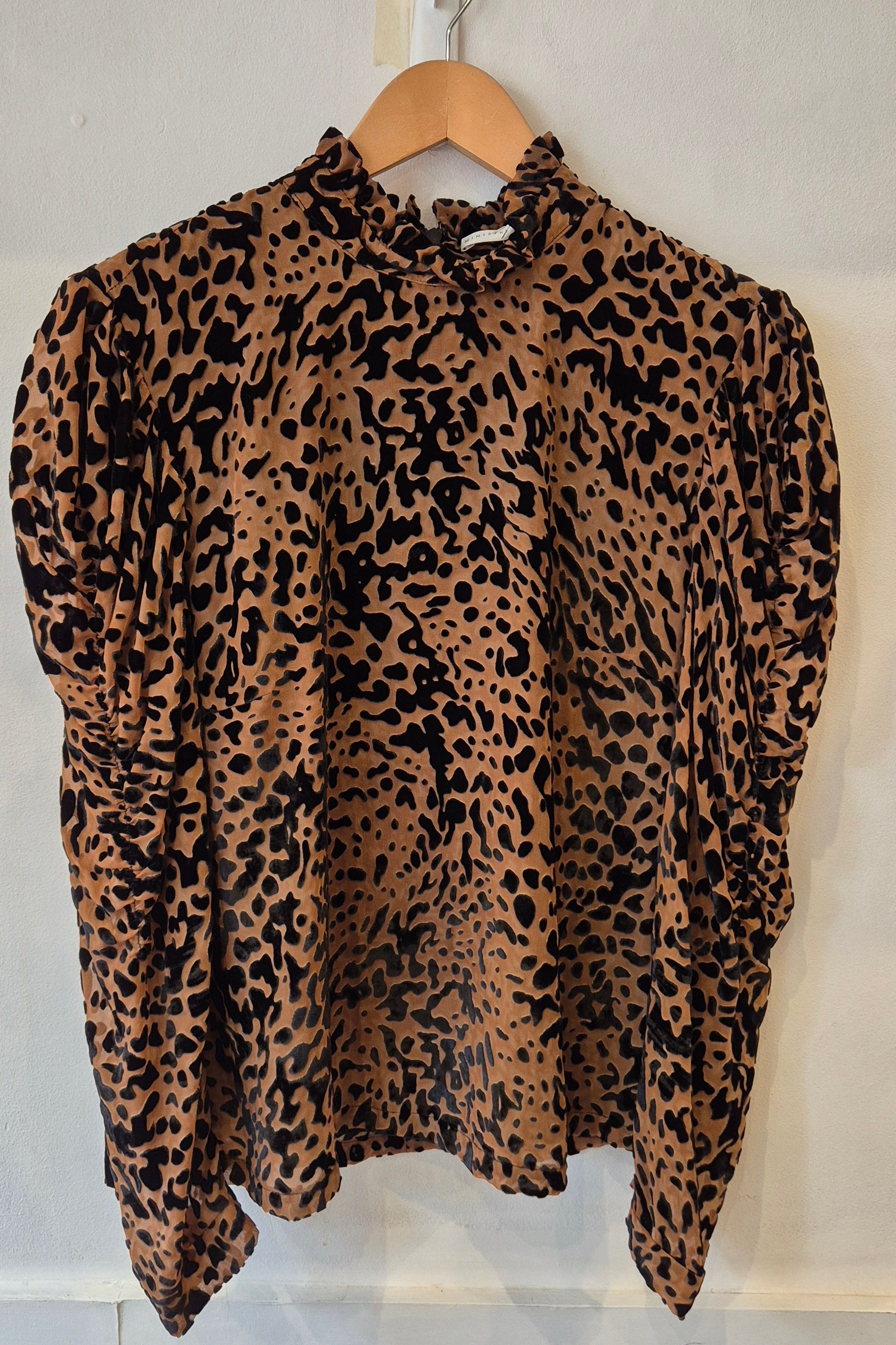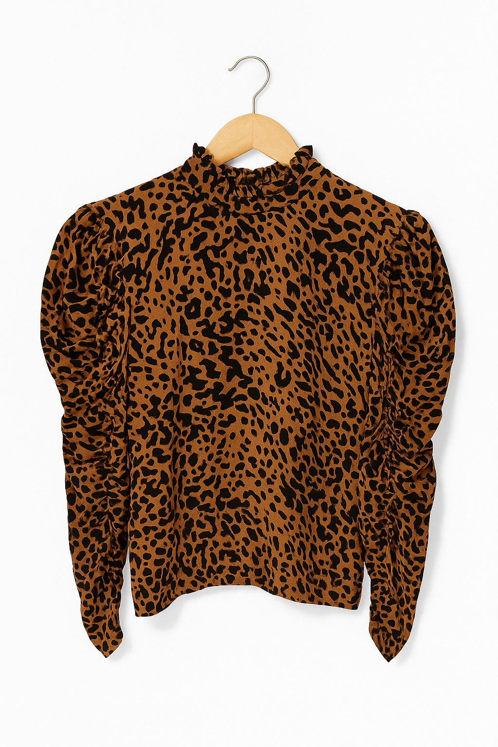 Fierce and feminine, this leopard print blouse is a statement piece that speaks for itself. Featuring a high ruffled neckline, soft gathering at the sleeves, and delicate ruching detail through the arms, it blends drama with versatility. Lightweight and semi-sheer, it layers beautifully under coats or blazers for cooler days, or shines on its own tucked into denim or tailored pants. Excellent preloved condition.