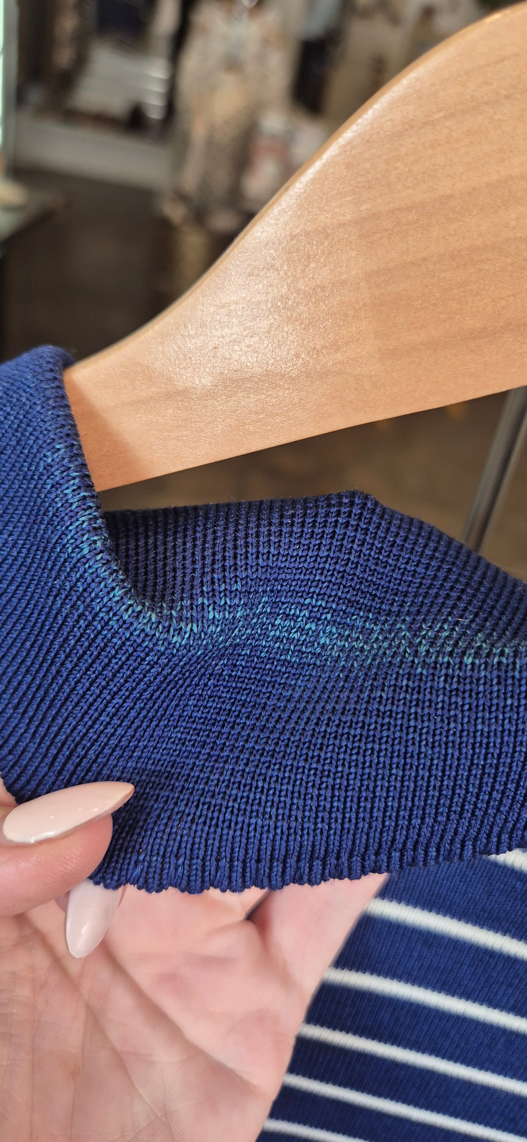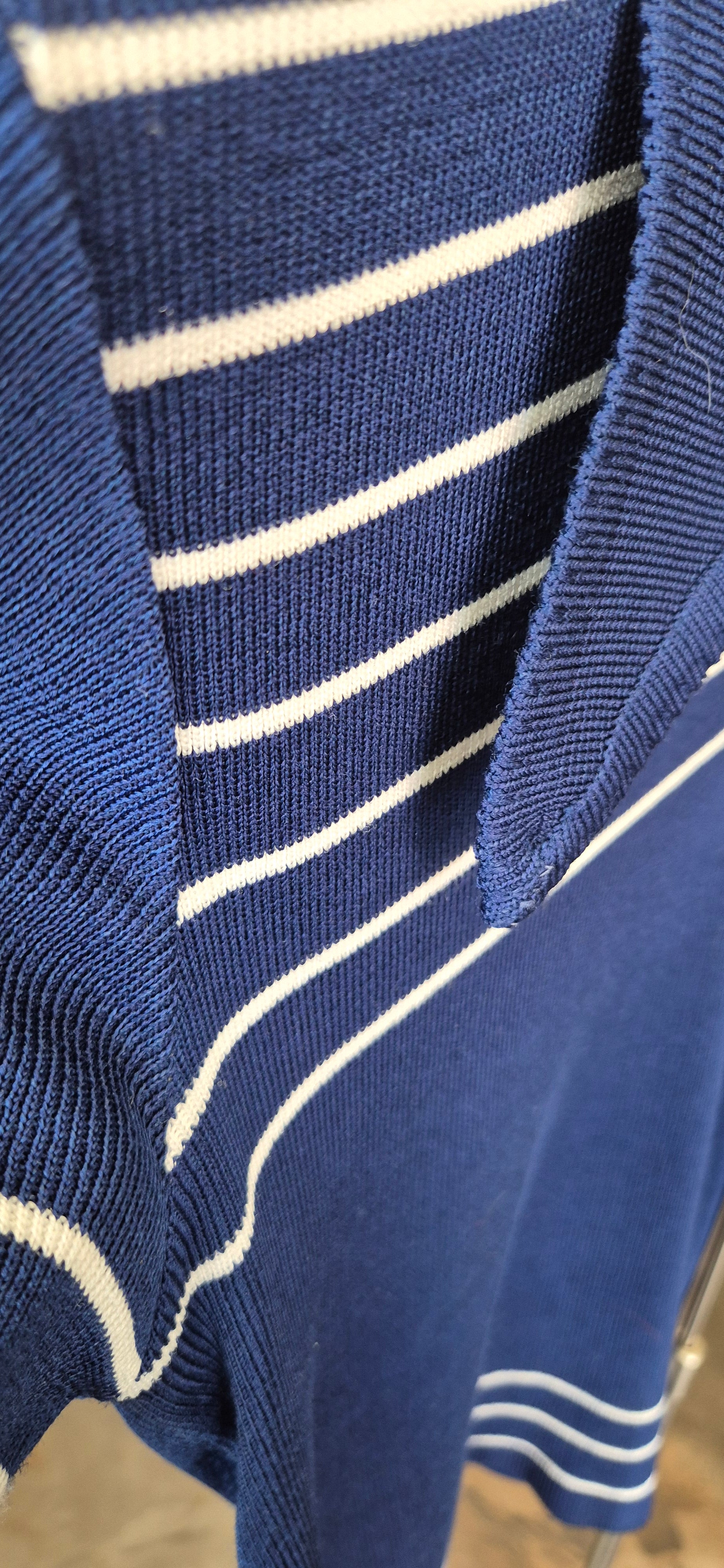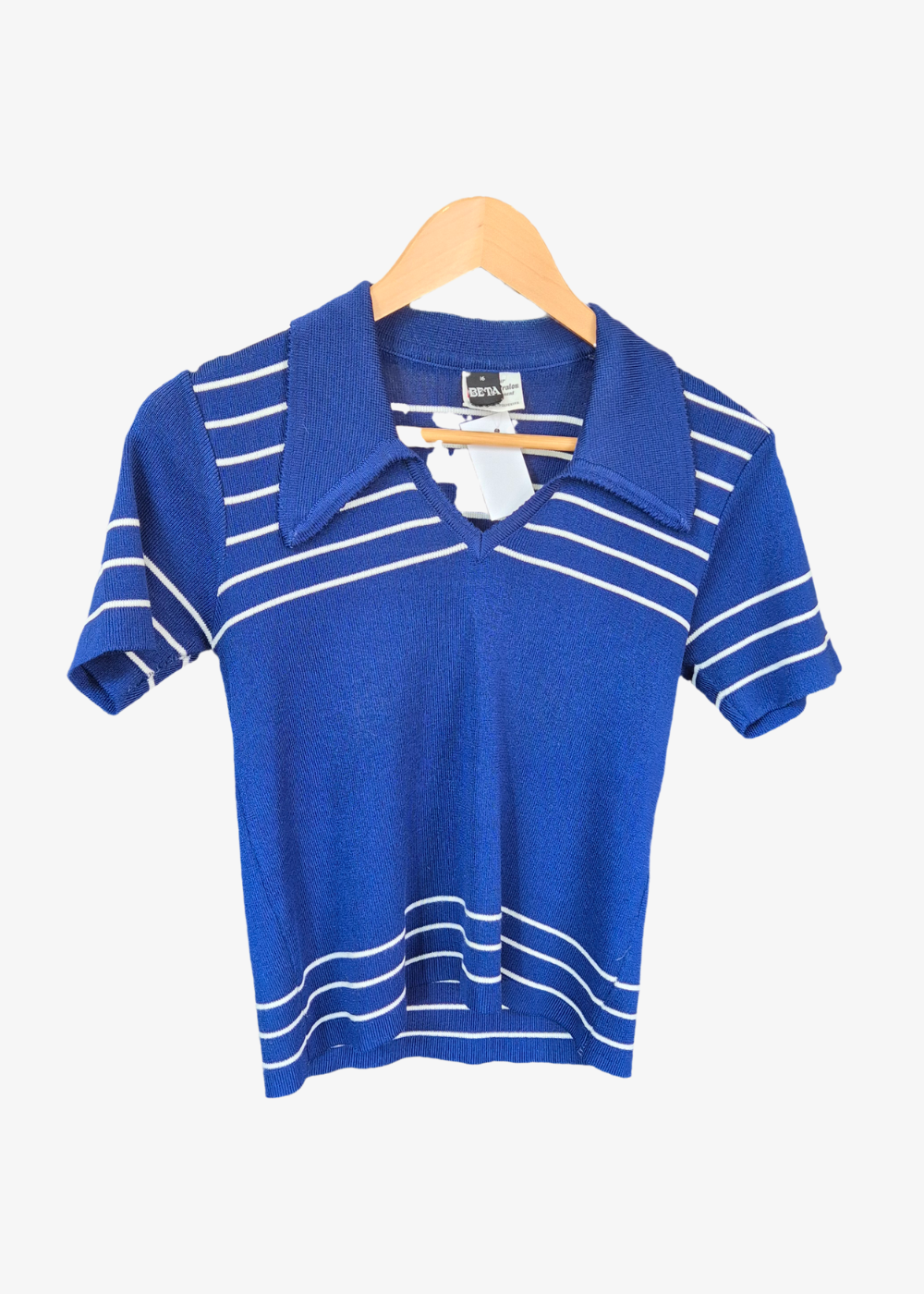 This vintage-inspired knit polo top features a rich cobalt blue hue with classic white horizontal stripes, bringing a touch of timeless sophistication to your wardrobe. The pointed collar and V-neckline add a polished yet relaxed vibe, making it perfect for casual outings or a refined weekend look. Crafted from a soft and lightweight knit, this top ensures all-day comfort with a subtle stretch for an easy fit.